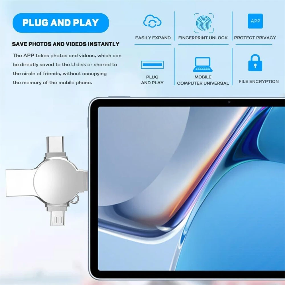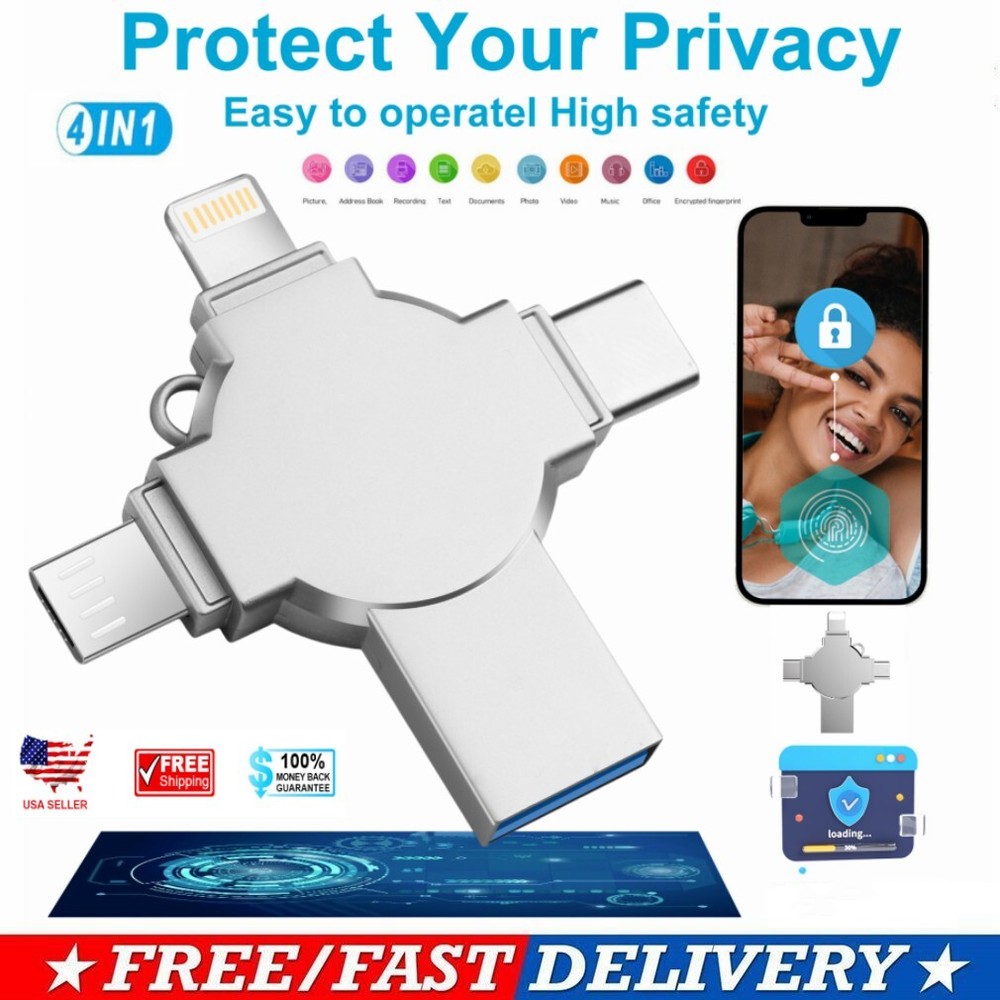 About this item 【4-in-1 Multi-Function Interface】The flash drive has four interfaces (smartphone USB + micro USB + type C + computer USB), which is more convenient for data transfer between different devices, thus getting rid of the trouble of data cables and allowing you to switch easily storage. 【Security Protection of Personal Privacy】The 4 in 1 USB flash drive can fully protect privacy and support some or all file encryption. The encrypted files will not be displayed on the computer. When sharing files, photos and videos with colleagues and friends, there is no need to worry about personal privacy leakage, providing you with comfort and security use experience. 【One-Click Easy Backup】With this flash drive, you can easily back up files, photos, videos and phonebooks on your phone with one click through the APP, eliminating the trouble of pasting and copying, and you can also use the USB port to store your own data backup on the computer as a dual Insurance. (Android phones need to turn on the OTG function, no need to download APP.) 【Stable & High-Speed Transfers】The USB 3.0 memory stick with premium chip guarantees fast and stable data transfer, allowing you to transfer photos, videos and files within seconds. The transfer speed of this USB is faster than ordinary 2.0 version, which has higher performance than ordinary traditional USB storage flash drives, save time and get more work done. 【Portable Streaming Media】There is a metal hole on the USB stick, you can connect it to your backpack. The storage space allows you to watch movies/play music directly on the flash drive, and you can also share photos and videos taken during the trip to Facebook, Twitter and other social media to share beautiful moments