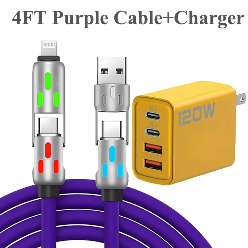 Description: Colorful breathing light fast charging cable 240W fast charging fully Universal with everything High power to low power 240/140100/60/30W device data cables are fully compatible Four modes, four options Four interfaces can be combined at will, multi-protocol full device support can be switched between mobile phones, tablets and other devices 240W fast charging PD full series compatible Support iPhone7-iPhone15 Samsung and other mobile phones compatible Colorful atmosphere lights make charging at night more convenient With soft colorful atmosphere lights, you can find your phone clearly when charging at night Zinc alloy material anti-oxidation process Free plug and unplug,as good as new, full of texture Free bending and long-term use without breaking After 20000+ bending test, wear-resistant and non-breaking, with longer service life Bold gold-plated copper wire charges faster and more stably The conduction area is increased, the resistance is reduced, and the charging and transmission speed is more stable and faster Product name: 4-in-1 liquid silicone data cable Interface: Type-C/USB-A/8pin Function: charging + data transmission Material: zinc alloy + liquid silicone Transmission speed: 480Mbp/s Current: 2.4A/5A Length: 1.2m Color: pearl nickel shell + purple line Applicable models: For Apple/Android/Type-C interface devices include: 1pcs 1.2 4in1 240w liquid silicone data cable