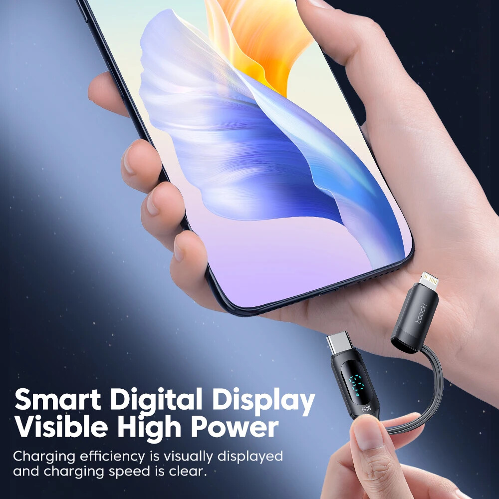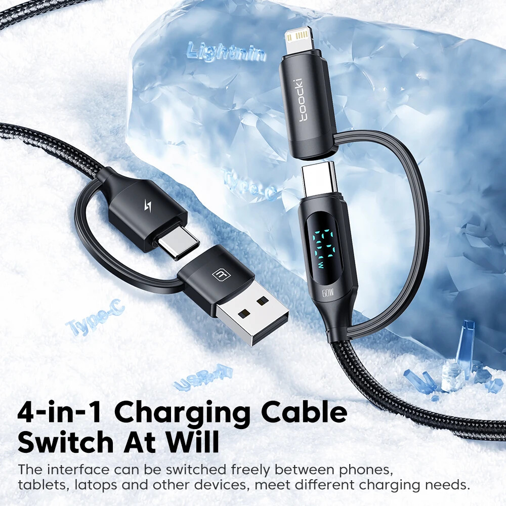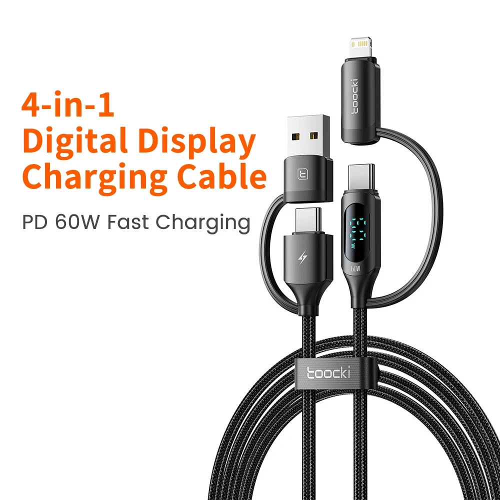 Feature: [4-in-1 Digital Display Charging Cable] Super Fast Charge PD 60W Fast Charging 4-in-1 Design [Smart Digital Display Visible High Power] Charging efficiency is visually displayed and charging speed is clear. [Multiple Usage Widely Compatible] Supports multi-brand mobile phones, tablets, computers and other devices, no need to change cables for charging. Type-C to Type-C (power delivery 60W max.): laptop/tablet/Switch/mobile phone USB-A to Type-C (3A): Tablet/Switch/Mobile phone USB-A to iP (2.4A): Tablet/Mobile Phone Type-C to iP: Tablet/Switch /Mobile Phone IP13/14/15 Pro Max (PD 27W) Regular Model (PD 20W) Reference Model Mobile Phone For iPhone (All Series) For Huawei: p60/P60 Pro/P50/P50 Pro/Mate 60/Mate 60 Pro/Mate 40/Mate 40 Pro/Mate 40 Pro +/Mate 40 RS/Mate 30/Mate 30 Pro/mate 30 RS/Nova9/Nova8 For Honor: 60SE/Magic V/V40/50; 50 SE/Magic 3/Magic 3Pro/Magic 2/V30/30 Pro For Samsung: Galaxy S24/S23/S20/20+/20 Ultra; Note 20/20 Ultra; Note 10/10+ For Xiaomi: Mi 5; 4C; 4S; 5S; 5s Plus For Meizu: Pro 5; Pro 6; Mx6 Product Parameters Material: Aluminum alloy + braided wire Color: Black Length: 1.2m/1.8m Function: Fast charge + USB2.0 transmission Input interface: USB-A/Type-C Output Interface: Type-C/iP Interface Note: Up to 60W for Type-C to Type-C charging only