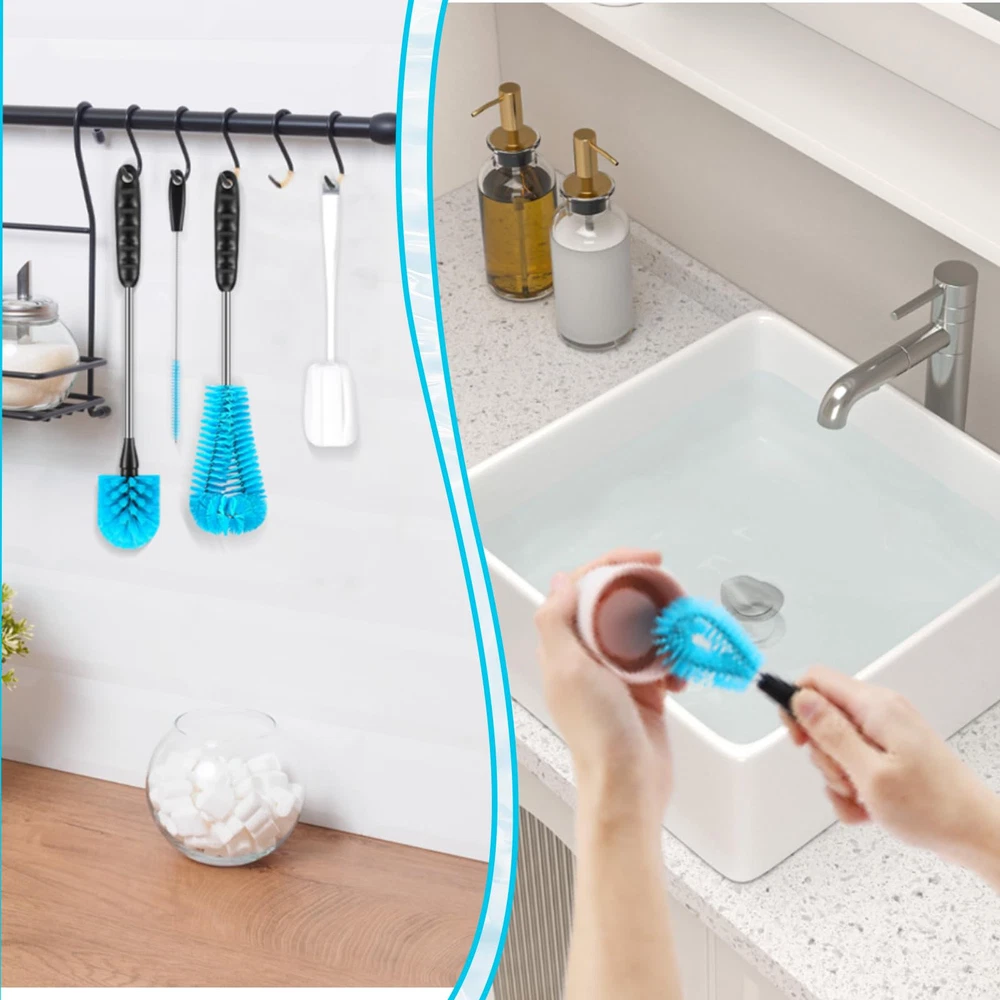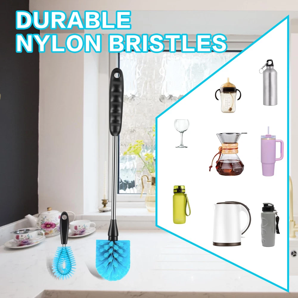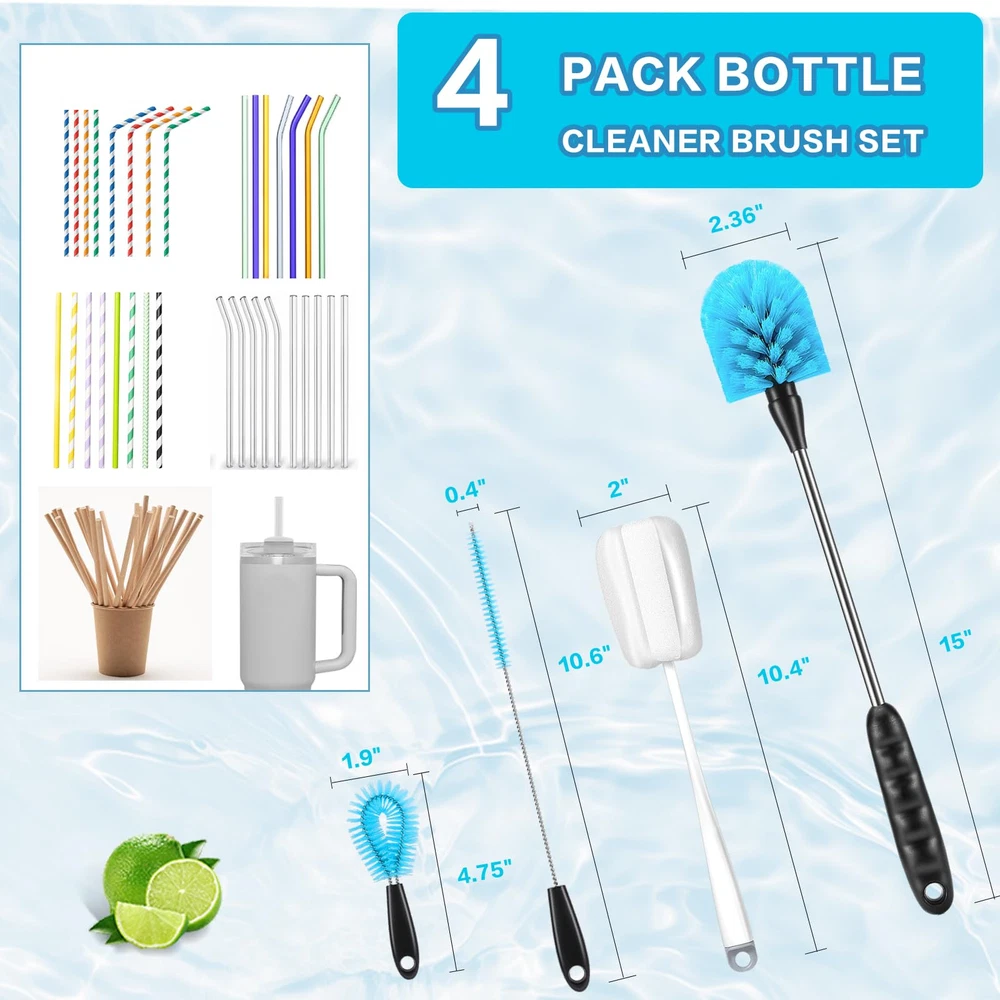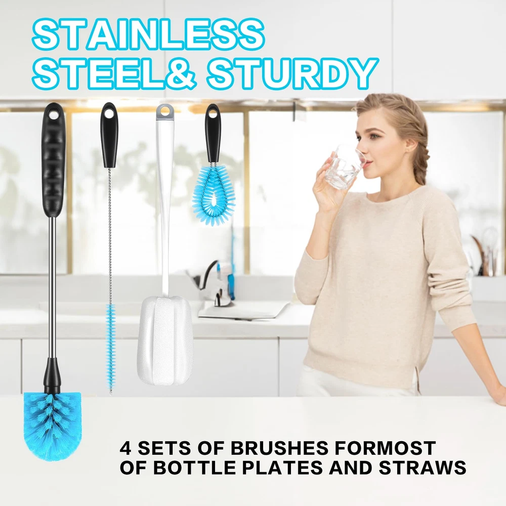 [4-in-1] Water Bottle Brush and Straw Cleaner Set, Stainless Steel Long Handle Baby Water Bottle Brush for Sports Bottles, Mugs, Cutlery, Coffee Mugs, Glassware, Wake-Ups. Made with high-end odorless nylon bristles, stainless steel handles and PP plastic grips, this bottle cleaning kit is comfortable and sturdy enough to clean all water bottles and mugs with confidence. Our sponge brushes are made of carefully selected sponges, reusable, please wash with soap and water after each use, specially treated foam sponges have good water absorption. 15 Inch Long Handle Bottle Brush and Straw Cleaner Set with soft, pliable bristles that reach deep into any bottle and glass less than or equal to 15 inches for a deep clean that lasts longer than regular bottle cleaners. The cleaning brush easily fits into a variety of water bottles, insulated mugs, travel mugs, baby bottles, coffee cups and mugs, vacuum flasks, narrow containers, kitchen dishes, sinks, and a variety of pots and pans, making it easier for you to clean and your family to rest assured.