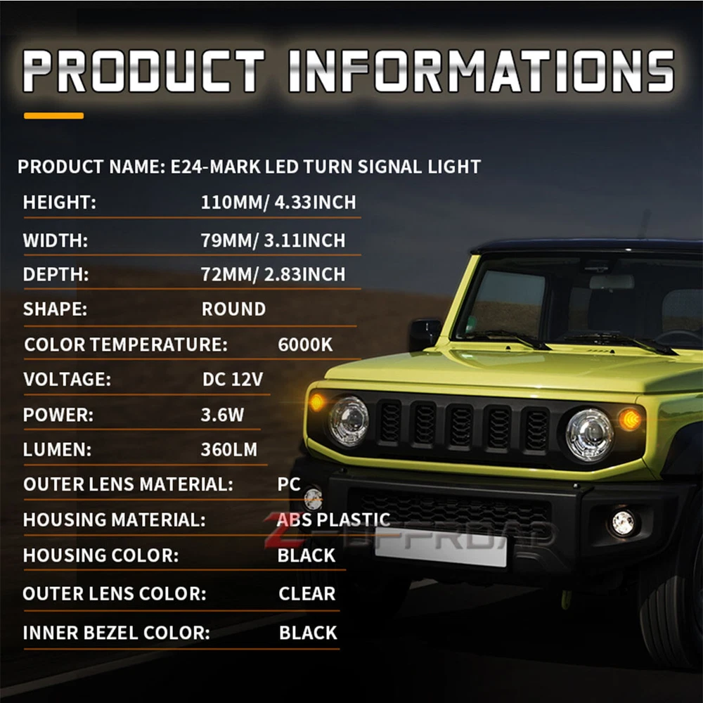 4"inch Front LED Lights with Turn Signal For Suzuki Jimny JB74W JB64 2018-2020 Descriptions: Type: E24-mark LED Turn Signal Light Height: 110mm/ 4.33inch Width: 79mm/ 3.11inch Depth: 72mm/ 2.83inch Shape: Round Color Temperature: 6000K Voltage: DC 12V Power: 3.6W Lumen: 360LM Outer Lens Material: PC Lens Housing Material: ABS Plastic Housing Color: Black Outer Lens Color: Clear Inner Bezel Color: Black 4"inch Front LED Lights with Turn Signal For Suzuki Jimny JB74W JB64 2018-2020 FITMENTS: Fit For Jimny 2018 2019 2020 FEATURES: The Certification--The Headlight carries the European Union's E24-mark and therefore complies with Essential Safety Requirements. Durable Construction--The steady housing made of strengthened PC lens and solid ABS plastic is impact scratch-resistant. Which it's strong enough to deal with all kinds of bad conditions. Mufti-function--Function as fog light and turn signal. Built with high-intensity led chips, these fog lights are brighter with minimized glare and light scattering that will make it easier for you to see what lies ahead without blinding the oncoming drivers against night and inclement weather. Superior Luminosity-- 3.6W Wattage, 360LM, led chips are perfect for lighting up the road. Updated built-in EMC function to avoid conflicting with your model. It is power frugal that the Life-span reach 50000hrs. Easy to Install--Plug and play. Quick and easy fitting without any modifications. It only takes about 30 minutes to finish the installation Package Includ ed: 1 Pair LED Turn Signal Light At last but no the least: 1.If you have any fruther question,please feel free to contact with us. 2.Do not leave any negative or netural feedback before contact us , we will try our best solve your problem and make you 100% satisfaction,thank you.