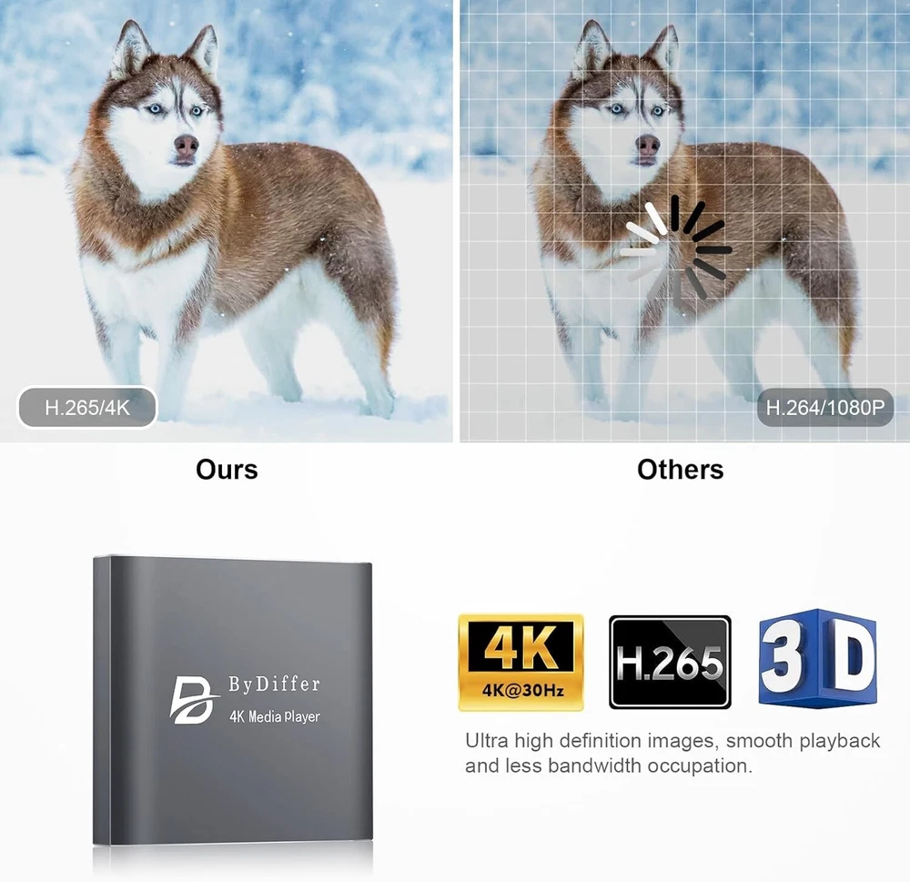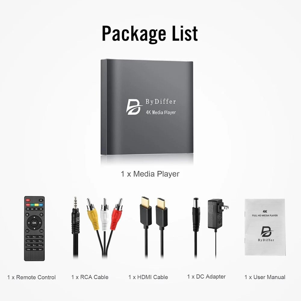 【4K HD Media Player】The digital media player 4K enables any TV(old or new) to play videos, music and photo slideshows/PPT from USB drives or micro SD cards. Enjoying 4K video quality via HDMI output by connecting to TV/monitor/projector and up to 7.1 stereo surround sound via AV/Optical output by connecting to speakers/amplifiers. 【Powerful H.265 Decoding】USB video player supports H.265/HEVC decoding technology up to 4K@30Hz resolution and 200mbps. Compared with H.264 decoding and 1080P resolution, ByDiffer hdmi 4K media player for TV has ultra high definition images, smooth playback with less buffering and less bandwidth occupation. 【Dual USB Ports】Read micro SD cards/USB flash drives(up to 128G)and USB hard drives (up to 8TB). Dual USB2.0 ports can connect two devices, but only read one of them at one time. You can also connect a USB keyboard/mouse/U disk/printer via the USB2.0 port. The mp4 player supports FAT32, exFAT and NTFS file systems. 【Multiple Playback Modes】Videos and photos can be played in sequential orders, and music can be played in random orders. TV player supports automatic playback, the ability to resume video playback from the last stop point and shuffle playback with repeat. Suitable for digital signage applications, home theaters and office work. 【Portable Media Players】Compact and travel design due to the palm size, the pocket USB media player is easy to carry. The gray hdmi media player is made of zinc alloy with fast heat dissipation, better protection, exquisite and superior appearance.