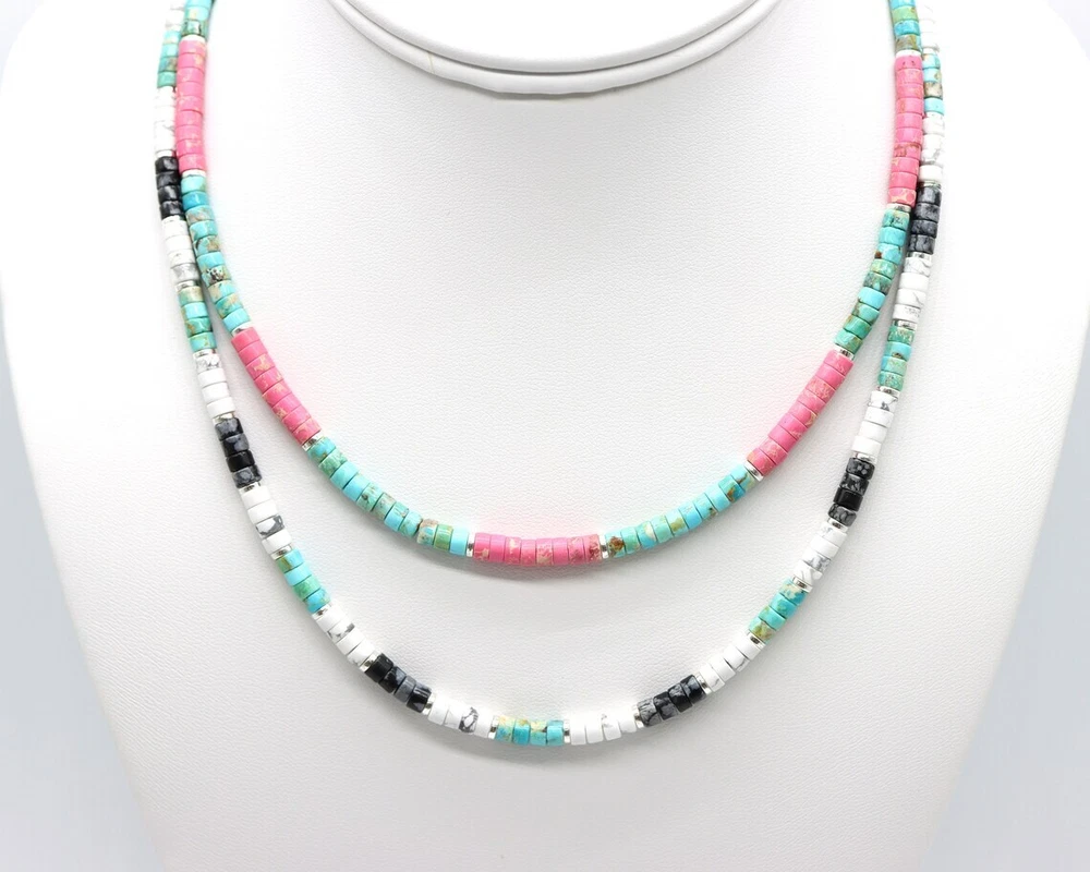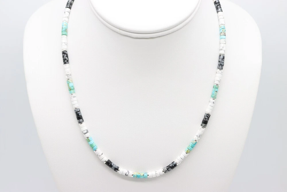 This Native American inspired beaded heishi necklace is made with natural white buffalo turquoise from Nevada, blue green turquoise from the Kingman Turquoise Mine in Kingman Arizona and black obsidian with gray highlights, and sterling silver spacer beads. The beads are uniform in size, making for a clean flowing pattern of semi precious gemstones. Modeled in both 18" and 20". The AAA grade white buffalo turquoise beads are beautiful shades of gray and white polished to a fine quality semi gloss luster that compliments that of the green turquoise and black obsidian. White Buffalo Turquoise This rare white turquoise is actually white in color while still being turquoise. It is the most spiritual of all the turquoise colors. While containing all of the colors on the spectrum, it represents enlightenment, knowledge, and transformation. As a Healing Stone, the color alone is not specific to any one chakra. Rather, it covers all of them. Blue Arizona turquoise was originally discovered by prehistoric Native Americans over 1500 years ago. The superior properties of Arizona turquoise sets the standard for quality worldwide, as all turquoise is measured against that of the southwestern USA. Arizona turquoise is known for it's pure clean colors that range from bluish green to sky blue. The many variants of green and blue turquoise are known for the finest matrix patterns of pure turquoise with often little to no markings, webbing, or matrix, making it very valuable and sought after. Arizona turquoise is mined from the many rugged copper rich mountain turquoise mines of the Arizona American Southwest. Turquoise captures the magic and mystery of the ancient Southwest. Here is a interesting fact about the color of Arizona Turquoise. The base mineral giving turquoise its beautiful blue hue is copper. It is iron that gives turquoise its green coloring. Greenish blue turquoise is most often found in the upper turquoise formations, where blue turquoise is more often found deeper within the formations. Turquoise is known to be the purification stone of peace and serenity, a gentle guiding light that inspires self-care and self-confidence. Obsidian is a volcanic mineral that forms in Volcanos. The black and gray obsidian is native to the southwestern United States. It comes from the rapid cooling of felsic lava. Obsidian is naturally black in color and has a glassy texture and a vitreous luster. There are several shades of Obsidian including rainbow, snowflake, gold, and mahogany. Obsidian is hard and was commonly used for tools. The meaning of Obsidian is safety and grounding. Dark and dreamy, the volcanic glass rock of Obsidian is a sword against negative energy and a powerful anchor for keeping you grounded in this good life. - 100% natural color, not dyed, treated or color enhanced. - Photos taken outside in natural lighting and in a light box. - No filters or color enhancements are added to the photos. The necklace is strung with premium strong 49 micro woven stainless steel beading wire with nylon coating. I use only the finest brightly polished sterling silver and gold filled findings. A large clasp that is easy to hold and open completes this necklace. I offer this in lengths; choker 14" - 28". Please select your size and finish from the drop down menu. A 2" necklace extender is included, so you can adjust the necklace and wear it at different lengths. Please message me if you would like the necklace without the extender. * Unisex styling, suitable for a man or woman and would make a perfect gift! * This necklace is completely handmade and constructed in my studio. * All pieces purchased come ready for gift-giving *Shipping on this item is within 3 days of receiving payment. *Standard Shipping to U.S. Addresses: Orders are shipped via USPS 1st class mail and per USPS guidelines, domestic delivery times range between 2-9 days, but in most cases 2-4 business days to the contiguous 48 states. *Standard Shipping to International Addresses: Orders are shipped via USPS 1st class international mail and per USPS guidelines, delivery times range between 10-21 business days. 4mm White Buffalo, Blue Arizona Turquoise, & Black Obsidian Heishi Bead Necklace, Unique Modern Boho Bead Gemstone Hippie Tribal Choker Thank you for visiting!