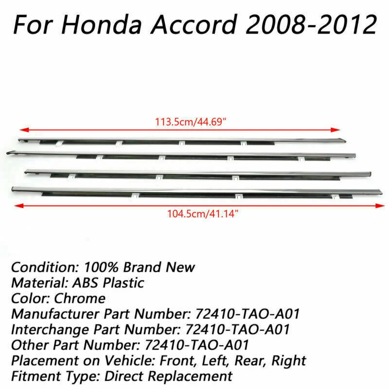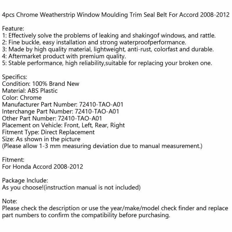 You may also like Tent Camper Crank Handle For Coleman/Fleetwood Pop-up Campers Round Mouth USA 32.6 USD Free shipping Metal Wing W12 Emblem Badge Sticker For Bentley Genuing Continental GT GTC 13.7 USD Free shipping Union Jack WING Mirror Cover for MINI Cooper R55 R56 R60 Power Fold Mirror Z USA 32.7 USD Free shipping NEW K114 K115 CVT Transmission Belt Chain Fits for Toyota Lexus 210.68 USD Free shipping NEW Pair Door Window Weather Molding 72410-S03-003 For HONDA 1996-2000 CIVIC EK 79.68 USD Free shipping Hot Side Intercooler Pipe Kit For 6.6 LLY LBZ LMM Duramax Diesel 2004.5-2010 73.7 USD Free shipping SAFE & SECURE SHOPPING 100% SATISFACTION GUARANTEED FAST SHIPPING Store Categories Store Categories Other eBay Motors Honda Toyota Ford Chevrolet Audi Mercedes-Benz Dodge Jeep You may also like Tent Camper Crank Handle For Coleman/Fleetwood Pop-up Campers Round Mouth USA 32.6 USD Free shipping NEW K114 K115 CVT Transmission Belt Chain Fits for Toyota Lexus 210.68 USD Free shipping Hot Side Intercooler Pipe Kit For 6.6 LLY LBZ LMM Duramax Diesel 2004.5-2010 73.7 USD Free shipping NEW Left+Right Headlight Lens Cover For Lexus GS350 GS450H 2013-2015 US 128.77 USD Free shipping 4pcs Chrome Car Window Moulding Trim Weatherstrips Seal For Accord 2008-2012 US Product Description 4pcs Chrome Weatherstrip Window Moulding Trim Seal Belt For Accord 2008-2012 Feature: 1: Effectively solve the problems of leaking and shakingof windows, and rattle. 2: Fine buckle, easy installation and strong waterproofperformance. 3: Made by high quality material, lightweight, anti-rust, colorfast and durable. 4: Aftermarket product with premium quality. 5: Stable performance, high reliability,suitable for replacing your broken one. Specifics: Condition: 100% Brand New Material: ABS Plastic Color: Chrome Manufacturer Part Number: 72410-TAO-A01 Interchange Part Number: 72410-TAO-A01 Other Part Number: 72410-TAO-A01 Placement on Vehicle: Front, Left, Rear, Right Fitment Type: Direct Replacement Size: As shown in the picture (Please allow 1-3 mm measuring deviation due to manual measurement.) Fitment: For Honda Accord 2008-2012 Package Include: As you choose!(instruction manual is not included) Note: Please check the description or use the year/make/model check finder and replace part numbers to confirm the compatibility before purchasing. About Us Shipping Terms Returns Contact Us About Us VIPIH is one of the international leading distributors specialized in distribution of auto spare parts of the world’s prime auto part suppliers on a global scale with the full responsibility in procurement, shipping, sales and marketing and after sales service. VIPIH fulfills all needs of its clients completely and on a timely basis with the know-how it has built up since it was established and the comprehension knowledge of the sectors standards. The perfectionist approach in product quality, high service availability, strict principle of business follow-up, reliability and the good reputation which has gained strength as a result of customer satisfaction are the most striking components of VIPIH ’ s success. VIPIH is presently capable of supplying all demands for auto parts from the gear box to turbo hoses in a wide range. Free delivery with worldwide shipping options available. If can not locate what you need then please get in touch! Shipping United States Buyers Parcel will via USPS or UPS from us United States warehouse Shipping Time Usually ,Parcel will be delivered 2-7 working day include Handling time. Sometimes shiping time may has a little delay, such as Bad wether,Holidays Terms We stand behind everything that we sell and will do everything possible to assure you are satisfied. When you receive your purchase if you are not 100% satisfied, please sent me ebay message and we will do our best to make you happy. If you still want to return your purchase, simply ship the item(s) back to us and we will refund your original purchase price and the original shipping charge. Buyers are responsible for the postal cost of returning the items. We must be notified of the intent to return your item within 30 days of receiving the item. Items returned must be in the same condition that they were received. How to return 1,Please ask us for return address . 2,Shipping back the package . The RMA#(Return Merchant Authorization Number = Your ebay ID) must be clearly written on the return package ,Otherwise the package will be refused. 3,Sent us the return tracking number. 4,All returns will be inspected prior to a credit being issued. Returns 1:Returns are accepted within 60 days of purchase. 2:All returned items MUST BE in the original packaging. 3:We will be happy to assist you if if any item needs to be returned or replaced 4:Please don't open a return request before contacting us first to solve, many thanks. Contact Us If you have any questions, our Customer Service staffs welcome you to sent me ebay message. We strive to answer all questions and resolve any problems as quickly as possible. Business Hours: Monday-Saturday 9:00-17:00 Copyright © 2022 Tongtool