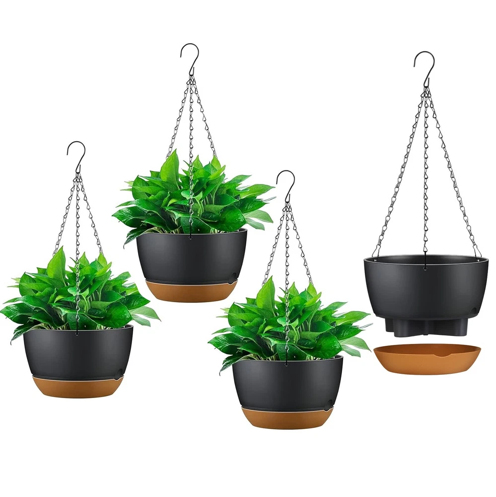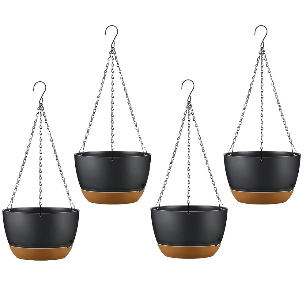 GOOD QUALITY Featured Item Product Detail Image Gallery Product Description Overview: With a diameter of 9.64in, our minimalist style hanging planters are suitable for repotting medium and large plants and flowers. A perfect solution for adding a touch of elegance and greenery to patio, garden, windowsill, porch, balcony, and more. Equipped with multifunctional removable tray, can be used as an extra water reservoir to ensure your thirsty plants stay hydrated even when you're away, or it can be used as a drain tray to collect excess water from the upper pot's drainage holes. Rustproof triangle structure chains and durable thickened plastic body ensure long-lasting durability, making them easily withstand various weather conditions in outdoor. Features: 4Pcs Minimalist Style Hanging Planters: Our hanging planter with the diameter of 9.64in,fit for repotting medium and large plants and flowers,like ferns,succulent,philodendrons,ivy,herbs and other plants. Classic dark grey color and minimalist appearance make our eye-catching hanging pots perfectly match various decoration styles for both indoor and outdoor. Multifunctional Removable Tray: Equipped with a removable water tray,you can either take it as an extra water reservoir to ensure your thirsty plants won’t get withered when you go for trip,or the removable tray can be used as a drain tray to collect the excess water flowing from multiple drainage holes in the upper plant pot which help to keep your floor always clean and tidy. Extra Ventilate & Watering Hole: Especially designed with one small hole on the tray,deliver enough air ventilation and effectively prevent the rotting root caused by over-watering and waterlogging. Additionally,this hole is convenient for you to add water without disassemble the tray. Your flourish plants and flowers will get the best growing environment! Adjustable Hanging Chains: Made of sturdy triangle iron chains with electroplating coating,built to last for long term use. Rustproof coating can withstand various weather conditions,like rain,fog,snow,while the stable triangle structure can up to 11lbs weight capacity. Each chain composed by multiple components allows you to flexibly adjust the length of hanging planters. Sturdy & Durable Material: The hanging planter with self-watering tray is constructed by durable thickened plastic material,anti-fading,corrosion-resistant,suitable for indoor and outdoor use,like patio,garden,windowsill,porch,balcony,etc.. Ideal housewarming gift for your horticulture lovers friends. Specifications: Brand: iMounTEK Product Type: Self-Watering Hanging Planters Material: Plastic, Iron Color: Grey Load Capacity: 11LBS Hanging Chain Length: 43cm/16.92in Per Assemble Item Size: 24.5x14.5x55cm/9.64x5.71x21.65in Per Assemble Item Weight: 330g/0.72lbs Package Size: 29.5x25x25cm/11.61x9.84x9.84in Package Weight: 1574g/3.47 lbs Package Contents: 4x Plant Hangers 4x Hanging Chains 4x Trays Terms & Conditions Thank you for your business !