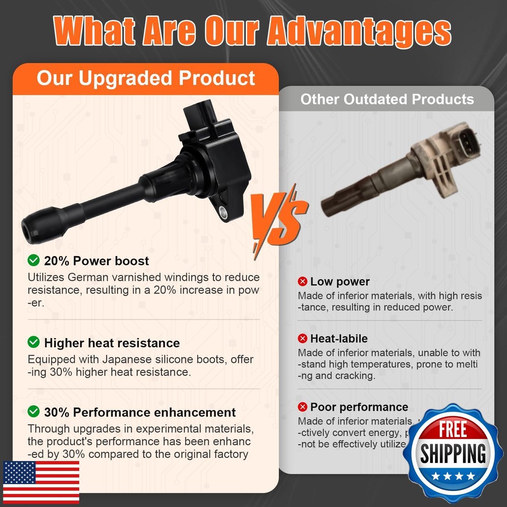 4pcs Ignition Coil and Spark Plug Fit for Nissan Altima Sentra Versa Rogue NV200 Cube 2.5L 1.8L 1.6L 2.0L L4 2007 2008 2009 2010 2011 2012 2013 Coil Pack Replaces# C1696 GN10241 UF549 Features 【Compatible Vehicle Models】: Ignition coil Fit for Nissan Models: Altima | Versa | Sentra | Cube | Rogue | Rogue Select | NV200 etc. For detailed applicable models, please check the product description page and the main image. Coil pack Replaces# UF-549, 22448ED000, 22448JA00A, 22448JA00C, 22448-JA00A, UF549, 1788369, DQ50226, C1696, CUF549, 6734028, IGC0002, 22448-JA00C. 【Peak Performance Engineering】:Our Ignition Coils Experience a 20% power boost with German varnished windings that reduce resistance, Japanese silicone boots offering 30% higher heat resistance, and 0.6mm iridium electrodes lasting 5 times longer than nickel alloys. Lab - tested for 45% faster spark and 18% better fuel efficiency. 【Complete Ignition System Solution】:Fix common issues such as rough idle (72% reduction in speed fluctuations), check engine light (OBDII fault codes P0300 - P0304), poor acceleration (1.2 - second improvement from 0 - 60mph), and fuel waste (About 10% reduction in actual tests). 【Military - Grade Durability】: Our ignition coil benefits from a three - layer protection system. It features epoxy encapsulation with an IP67 waterproof rating, a silicon - steel core that offers a 40% improvement in vibration resistance, and a copper - nickel alloy shell that provides 35% better heat dissipation efficiency. As a result, our ignition coil is more durable than the original factory - equipped one. 【24-Month Warranty】: Enjoy a 24 - month warranty, 30 - day hassle - free return, and year - round technical support (9 am - 9 pm EST). With an average response time of less than 60 minutes. If you encounter any issues or have questions, our dedicated support team is available to assist you at any time. Shipping Free & Fast Shipping: We offer free shipping to most of the USA with a normal delivery time of 3-7 days. However, due to the current situation, additional delivery time (up to 3 weeks) may be required for some items. Alternative Carriers: We may use alternative carriers (e.g., USPS, FedEx, UPS) to ensure your package arrives safely and on time. Due to the use of multiple carriers, we are unable to provide a tracking number automatically. Handling Time: Orders are processed and shipped within 1-2 business days of receiving cleared payment. Shipping Restrictions: Shipping to Alaska, Hawaii, Puerto Rico, Guam, and other US territories may incur shipping charges or delivery restrictions. Please contact us before ordering, or your order can be refunded/cancelled. State Restrictions: Certain items may not be shipped to California due to state regulations. Contact for Tracking Updates: If you require tracking updates or have any concerns about the delivery of your order, please feel free to contact us, and we will be happy to assist you. Return Policy 30-Day Hassle-Free Returns: If you are not completely satisfied with your purchase, you can return the item for free within 30 days of receiving it for a full refund or exchange. Easy Return Process: Contact us, and we will provide you with a prepaid return shipping label and detailed instructions. No Restocking Fee: There are no restocking fees for returns. However, the buyer is responsible for return shipping costs if the return is not due to a seller's error. Refund Processing: Refunds will be processed within 1 business day of receiving the returned item in its original condition. Payment We accept all major credit cards, PayPal, and Apple Pay for your convenience. Your payment information is secure and encrypted to ensure a safe and seamless transaction. Please complete your payment within 3 days of purchase to avoid any delays in shipping. Feedback Your feedback is extremely important to us. We strive to provide the best products and customer service possible. If you are satisfied with your purchase, please take a moment to leave us a positive review. If you have any concerns or issues with your order, please contact us before leaving negative feedback. We are committed to resolving any problems and ensuring your satisfaction. Contact Us If you have any questions or concerns, please feel free to reach out to our customer support team. You can contact us through the eBay messaging system. We are available Monday to Friday, 9:00 am to 5:00 pm EST, and we will do our best to respond to your inquiry within 24 hours. Thank you for supporting our small family business!
