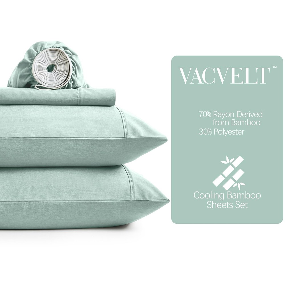 4pcs 70% Rayon Derived from Bamboo Sheets --Luxury cooling sheets are made of 70% rayon derived from bamboo and 30% polyester, soft and breathable, suitable for night sweaters and hot sleepers. --Rayon derived from bamboo sheet set can provide you with a pool like coolness, silky softness, which can relieve your daytime fatigue and bring you quality sleep. Upgrade Extra Deep Pocket Design: There are elastic around the fitted sheet, which can fit closely with the mattress, up to 24 inches deep. Available Color (Solid Color): Dark Grey, Aqua Blue, White, Black, Light Grey Available Size: Full Size Sheets: 1 Extra Deep Pocket Fitted Sheet: 54" x 75" + 18"-24"; 1 Flat Sheet: 81" x 96"; 2 Pillowcases: 20" x 30" Queen Size Sheets: 1 Extra Deep Pocket Fitted Sheet: 60" x 80" + 18"-24"; 1 Flat Sheet: 90" x 102"; 2 Pillowcases: 20" x 30" King Size Sheets: 1 Extra Deep Pocket Fitted Sheet: 78" x 80" + 18"-24"; 1 Flat Sheet: 108" x 102"; 2 Pillowcases: 20" x 40" California King Size Sheets: 1 Extra Deep Pocket Fitted Sheet: 72" x 84" + 18"-24"; 1 Flat Sheet: 108" x 102"; 2 Pillowcases: 20" x 40" Washing Suggestions: Machine wash in cold water at a gentle cycle is recommended, tumble dry low. In order not to damage bed set, please do not iron, dry clean or bleach. Tips: All the pictures of our products are taken in an environment with sufficient light. Because the satin fabric is glossy, the color will vary slightly under different light intensities. Please do not mind. 70% Rayon Derived From Bamboo Sheets: After multiple attempts, we ultimately used 70% rayon derived from bamboo and 30% polyester to make our cooling sheets. This ratio of 70% rayon derived from bamboo sheets can provide you with a pool like coolness, silky softness. At the same time, this 70% rayon derived from bamboo bed set won't be so slippery that you have to search for your bedding on the ground when you wake up. Extra Deep Pocket Queen Size Sheets: Our super deep pocket sheets are applicable to 18-24 Inch deep pocket mattresses. Available Color: Dark Grey, Aqua Blue, White, Black, Light Grey. You can choose the color you like according to the decoration style of your bedroom. Elastic around design can firmly fit your mattress. Wonderful & Attractive Gift: 70% rayon derived from bamboo sheets have the function of adjusting temperature and strong breathability, which can effectively absorbs moisture & sweat from your skin, keeping you cooling & dry all night, providing you a good night's sleep. It is a beautiful gift for your wife, parents, children and friends. What Will You Receive: Extra deep pocket queen size sheets includes 1 extra deep pocket fitted sheet (60" x 80" + 18"-24"); 1 flat sheet (90" x 102"); 2 pillowcases (20" x 30"). This 70% rayon derived from bamboo sheets is wrinkle resistant and fade resistant. It is suitable as a gift for Valentine's Day, Mother's Day, wedding anniversary. Quality Assurance: This 70% rayon derived from bamboo sheets are soft and luxurious, suitable for night sweaters and hot sleepers, allowing you to enjoy cool and comfortable sleep every day. Machine wash in cold water at a gentle cycle is recommended, tumble dry low. Please do not iron, dry clean or bleach.