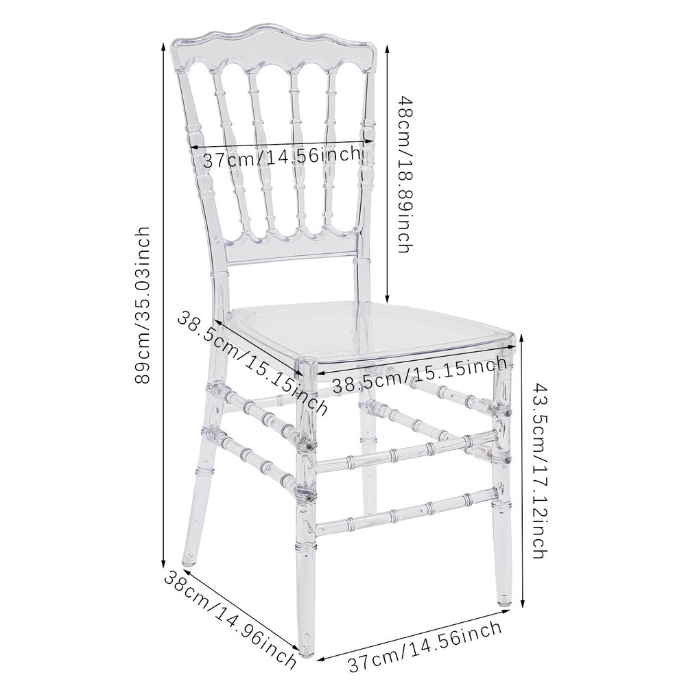 Specification Material: PC Color: Clear Process: Injection Molding Style: Modern Assembly Required: Yes Mounting Type: Free Standing Number of Pieces: 4 Product Overall Height: 89cm/35.04in Sitting Area: 38.5*38.5cm/15.16*15.16in Backrest Size(W*H): 48*37cm/18.9*14.57in Leg Height: 43.5cm/17.13in Footprint Size: 38*37cm/14.96*14.57in Package Size: 96*43*29cm/37.8*16.93*11.42in Each Load Capacity: About 200kg/440.92lbs Gross Weight: 21kg/46.3lbs Net Weight: 20kg/44.09lbs Package Included 4* Clear Dining Chairs Other Accessories for Assembly 4pcs Stacking Clear Dining Chairs Elegant Wedding Party Event Crystal Chairs Set Welcome to our store^-^ Description This crystal cl ear and translucent chair from us is a seat that blends modern design with artistic beauty. It combines high-quality PC material with exquisite injection molding technology, aiming to create a practical and visually appealing seat that will be a sight to behold, whether it is used in restaurants, banquets, wedding venues, or modern homes. Key Features Made to Last: This product is made of high-quality PC, treated with an injection molding process, which is highly flexible, with fewer bubbles, and has UV , heat acid, and alkali resistance to ensure a long service life. Strong Load-bearing Capacity: Thanks to the high-quality materials and the four-legged construction, the product has a weight capacity of up to 440.92lbs and high stability, so you can sit with confidence! Exquisite Appearance: The high transparency and gloss of the PC material give the chair a unique crystal texture, making it a striking focal point in any interior space, adding a modern and artistic touch. Ergonomic Design: The curved design of the back of the chair follows the principle of ergonomics to ensure that while providing an elegant appearance, it also gives the user a comfortable sitting feeling, suitable for long-time use. Easy to Clean & Maintain: Thanks to its smooth surface, it is not easy to adsorb dust and stains, so you just need to simply wipe it to keep it clean, reducing the difficulty of daily maintenance. High Spatial Adaptability: The clear color means it does not take up too much space visually, especially suitable for small households or environments that need to expand the visual effect, creating an open and bright atmosphere. Easy Assembly: Simple structure and complete accessories help you finish the installation quickly and use it in a short time. Ideal Gift: With good performance and a modern appearance, it can be used as an ideal housewarming gift for parents, friends, and lovers so that they can also enjoy a more exquisite life. Good Customer Service: We aim to provide quality products and services. If you have problems, please feel free to contact us. We will reply and solve the problem for you as soon as possible. Details Large Sitting Area: 15.16*15.16in seat area increases the force area and improves the comfort of the seat. Bamboo Joints Shape: This design improves the aesthetics of the seat and adds to its style. Application This product is suitable for family living rooms, banquet halls, dance halls, wedding halls, etc. Specification Material: PC Color: Clear Process: Injection Molding Style: Modern Assembly Required: Yes Mounting Type: Free Standing Number of Pieces: 4 Product Overall Height: 89cm/ 35.04in Sitting Area: 38.5*38.5cm/15.16*15.16in Backrest Size(W*H): 48*37cm/ 18.9*14.57in Leg Height: 43.5cm/17.13in Footprint Size: 38*37cm/14.96*14.57in Package Size: 96*43*29cm/37.8*16.93*11.42in Each Load Capacity: About 200kg/440.92lbs Gross Weight: 21kg/46.3lbs Net Weight: 20kg/44.09lbs Package Included 4* Clear Dining Chairs Other Accessories for Assembly Notes Please make sure to drive the screws all the way down to fix the legs and chair body securely together. After assembly, the chair may be a bit squeaky. Although may be a cause for concern, this is not a quality issue, but rather a result of the material type. The chair backs have some flex, but the legs are solid and stable. Please consider that some squeakiness should be expected to be tolerated before you buy. We also recommend manually screwing during assembly instead of using an electric drill, as the speed and excess power of electric drills may strip screws. Please allow the slight color difference caused by the shooting light and 1-3cm error due to manual measurement, and make sure you do not mind before Payment Delivery details Terms of sales About us Contact us Payment We accept ebay payment 。 Fees such as import duties, taxes are not included in the item price or shipping costs. These charges are the buyer's responsibility. Delivery details Shipping: 2-9 working days to: USA Terms of sales We maintain high standards of excellence and strive for hundred percent customer satisfaction. Feedback is very important to us. We hope that you contact us immediately before you give neutral or negative feedback, so that we can address your concerns. It is impossible to address issues if we do not know about them! About us Your satis faction is our ultimate goal. We work hard to earn your trust and future business. Our certified technicians have tested each item before shipping. The unit comes with 1 year limited warranty on all manufacturing defects. a) If you receive a defective item, you may return it or ask for a discount. Please contact us within 14 days after you receive the package. b) What you returned must be intact and in its original packaging as re? u. Customer is responsible for shipping costs of the returned item. c) We will cover the cost of shipping back t with the shipping rate indicated in the registration page. We will send you a new unit or refund the full payment you paid. Thank you. Contact us Business Hour Business Hour: Monday To Friday: 8:30 AM to 5:00 PM (Beijing China time) Due to time zones, our reply to your questions may not be immediately. But within above working time, we will reply your email within 24 hours. If it's non-workd