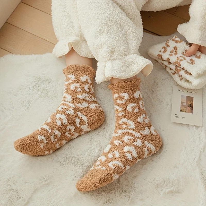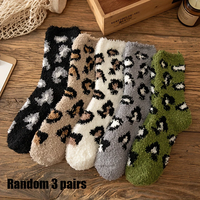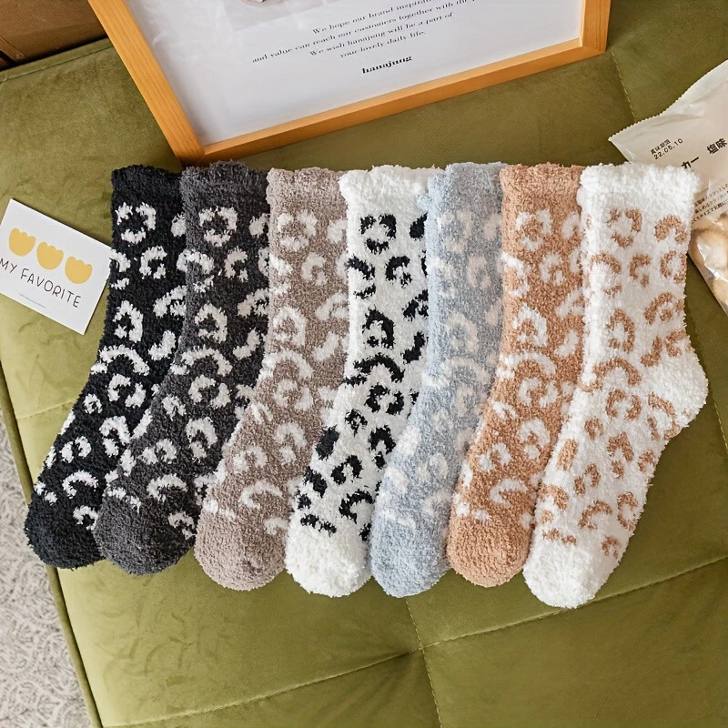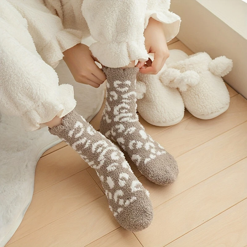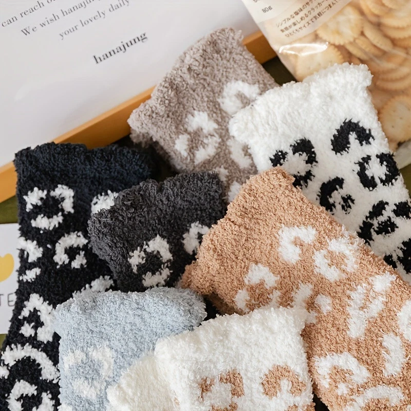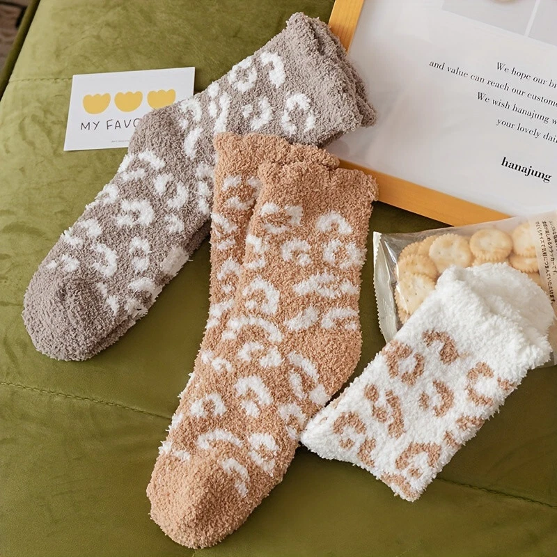 4pcs Thick Fuzzy Socks for Women - Cozy Leopard Print Mid-Calf Winter Sleeping