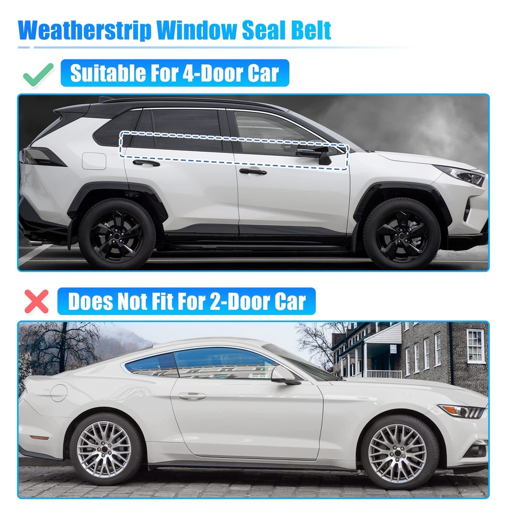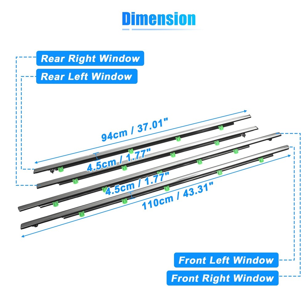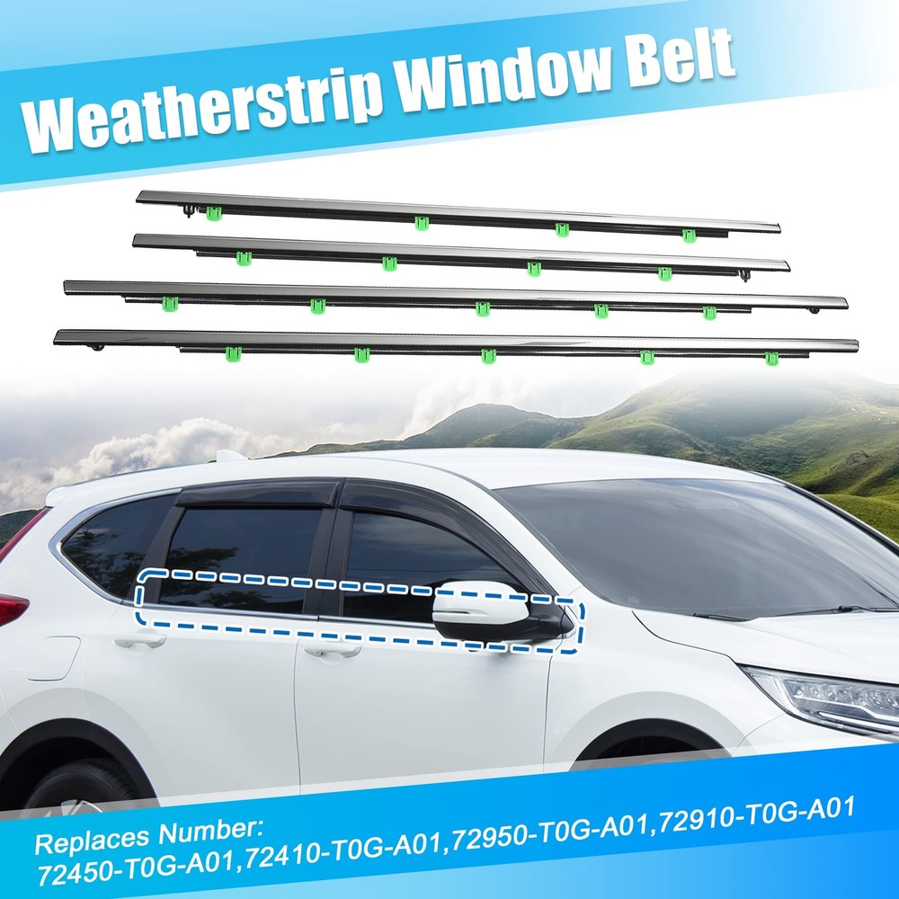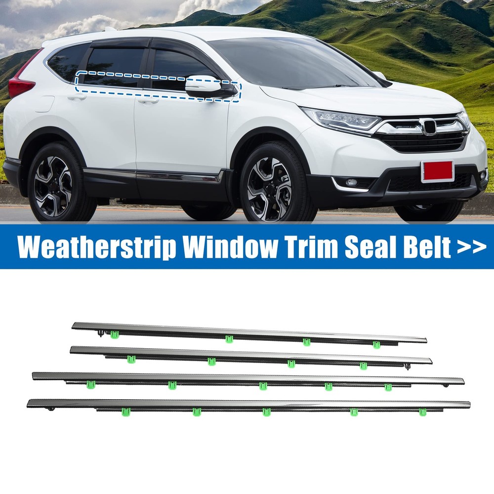 Replaces Number: 72450-T0G-A01, 72410-T0G-A01, 72950-T0G-A01, 72910-T0G-A01 72450T0GA01, 72410T0GA01, 72950T0GA01, 72910T0GA01 Fitment: for Honda CR-V 2012 for Honda CR-V 2013 for Honda CR-V 2014 for Honda CR-V 2015 for Honda CR-V 2016 Description: The window sealing belt can effectively solve the shaking sound of the window, and can also reduce the wind noise during high-speed driving, making the interior of the car quieter and more comfortable. The window weatherstrip has well waterproof performance, which can effectively solve the problem of window leaking Weatherstrip Window Seal Belt suitable for 4 door car, does not fit for 2-door car Easy to install, directly install with the buckle This is non-OEM product, accessory ONLY! Specification: Color: Silver Tone Material: ABS, Rubber Type: Door Window Belt Finish: Polished Chrome Attachment Type: Clip-On Features: Waterproof Placement on Vehicle: Front, Left, Rear, Right Front Window Weatherstrip Size: 110x4.5cm / 43.31"x1.77"(L*W) Rear Window Weatherstrip Size: 94x4.5cm / 37.01"x1.77"(L*W) How to Install the Window Seal Belt 1. Remove the deformed weatherstrip and clean it. 2. Align all the buckle holes to install it. 3. The installation is complete Note: Please carefully check your vehicle model year to ensure you get the correct part. Please allow slight dimension differences due to different manual measurements. Package Includes: 4 Pcs Window Weatherstrip (Front, Left, Rear, Right) FITMENT: Door Belt fit for Honda CR-V 2012 2013 2014 2015 2016. Weatherstrip Window Seal Belt suitable for 4 door car, does not fit for 2-door car REPLACE NUMBER: Door Window Belt OE number is 72450-T0G-A01, 72410-T0G-A01, 72950-T0G-A01, 72910-T0G-A01, 72450T0GA01, 72410T0GA01, 72950T0GA01, 72910T0GA01 FUNCTION: This window seal belt is durable, and scratch-resistant, which can effectively solve the shaking sound of the window, and can also reduce the wind noise during high-speed driving, isolate the road surface noise, make the car interior environment quieter and improve driving comfort. MATERIAL: Replacement for your broken door window belt. The door weather belts are made of rubber and plastic material, durable, and has good sealing performance, which is waterproof, soundproof, windproof, and dustproof. The window weatherstrip can effectively solve the problem of window leaking PACKAGE INCLUDED: 1 Pc Front Left Weatherstrip Door Belt, 1 Pc Front Right Weatherstrip Door Belt, 1 Pc Rear Left Weatherstrip Door Belt, 1 Pc Rear Right Weatherstrip Door Belt