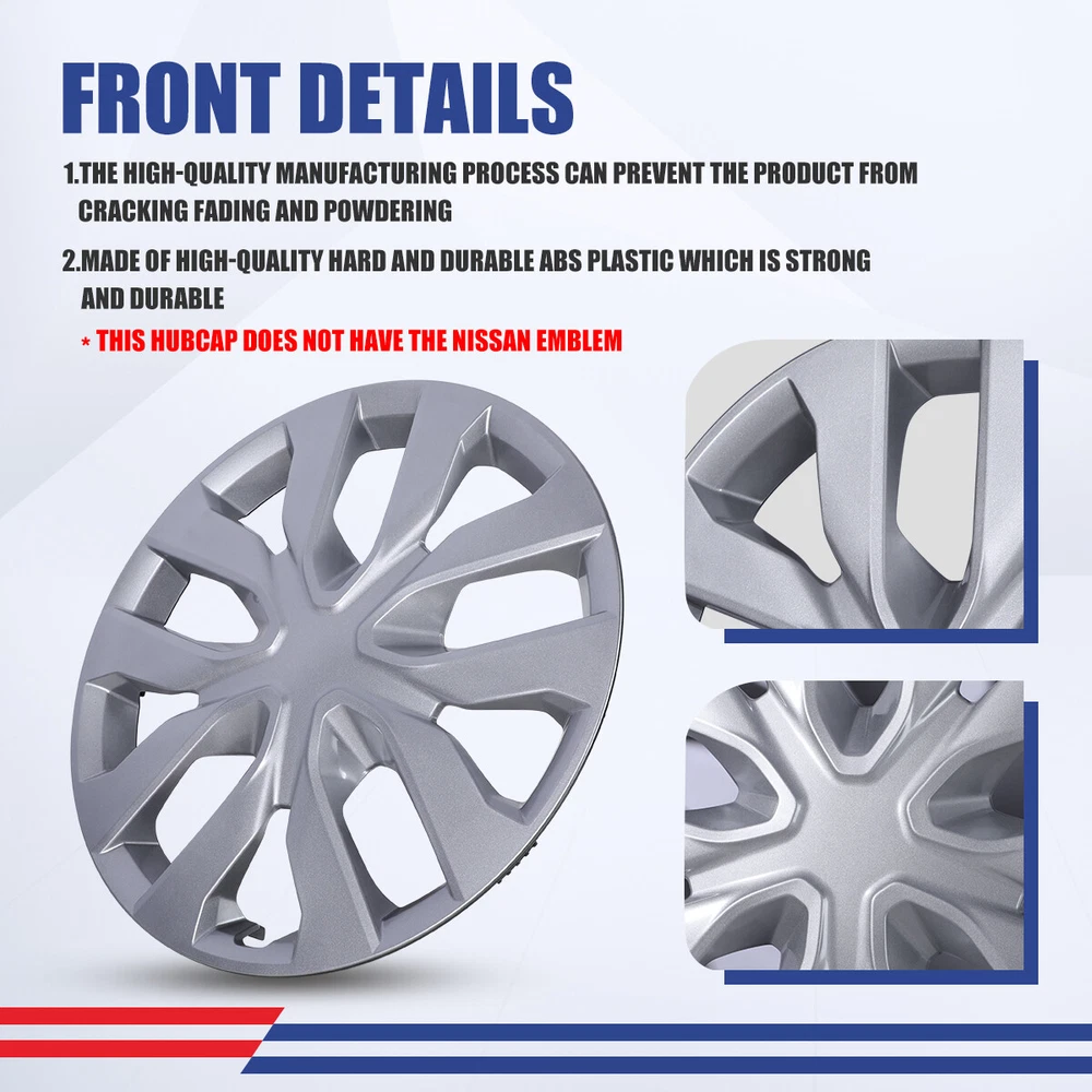 Head Lights Tail Lights Fog Lights Turn Signal Bumper Fender Flare Inner Fender Hubcaps Refrigerator Other Items for sale Head Lights Tail Lights Fog Lights Turn Signal Bumper Fender Flare Inner Fender Liners Portable Refrigerator 4pcs Wheel Covers Full Rim Snap On Hub Caps For 2014-2020 Nissan Rogue 17" Inch Compatibility : Fit For 2014-2020 Nissan Rogue 17" Wheel Specifications: High quality manufacturing process can prevent product cracking, fading and powdering. Made of high-quality flexible ABS & PC material, sturdy and durable, with adjustable buckle design. Wheel Rim Cover has a graded fixing ring and as long as the wheel hub cover is installed properly, it will not fall off during driving. Check the wheel rim size (diameter) of the tire and check the number after the letter "r" . Only suitable for iron wheels, not aluminum alloy wheels! Please check tire size before purchase! Material: ABS & PC Rim size: 17 inches Color: Sliver Packaging included: 1 set of 4 wheel hub covers Payment Shipping Return About us Contact us Payment Appreciated for the prompt payment, Contact us if bid by mistake, system open unpaid item automatically. Payment must be complete within 3 days from the date you purchase or after the end of auction. Items unpaid within 3 days of the auction end will be forfeited. We reserve the right of cancel the order and re-selling the items. Shipping All shipment will ship by UPS or USPS . All items will be ship within 1 working days , and we will ship out all orders as soon as possible after payment verified, please allow up to 1-4 business days for delivery. CANADA & International customers please note: your government might charge a duty tax (brokerage fees). We do not responsible for any custom duty or import tax. Why Choose the US Stock? 1. Us Local Shipping, No Extra Customs Cost to the US. 2. Fast Delivery: 1-4 Working days Delivery. 3. Best After-Sales Service!!! Return The buyer is responsible for all return shipping including a result of customer error or defective item. 1) If you received an incorrect, damaged, defective, or item not as described, contact us for full refund or replacement on our cost. 2) If you want to return the item, please contact us within 60 days after package received. Return products must also be in its original condition: including box, packaging and all other accessories. About us We are the best auto parts, we have been pursuing excellence, continuous exploration as the slogan, let customer satisfaction is our purpose! We adhere to the United States local delivery, one year warranty! Welcome! Contact us How Should You Contact us? Please Read The Item Description And See if The item Fits Your Vehicle Exactly. If You Found Any questions, Feel Free to email us by "Ask a question" Our Office Hours Are Monday - Friday 8:00am - 5:00pm PST / 11:00am - 8:000pm ET, We Do Not Answer Any E-Mails On Weekend, And We Will Reply All E-Mails In The Order It Was Receive. All E-Mail Take Us Around 24 Hours To Respond To Any E-Mail. We Are Close During The Weekends And We Do Not Answer Any E-Mails During That Time.