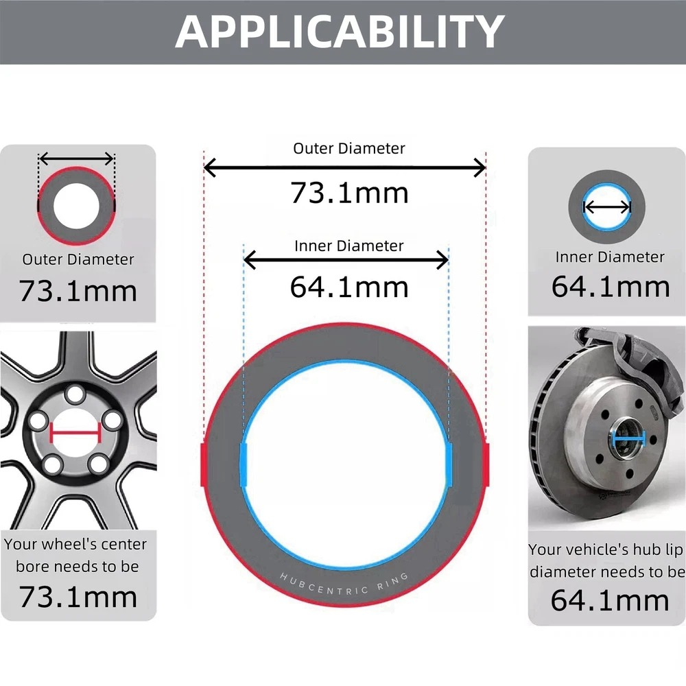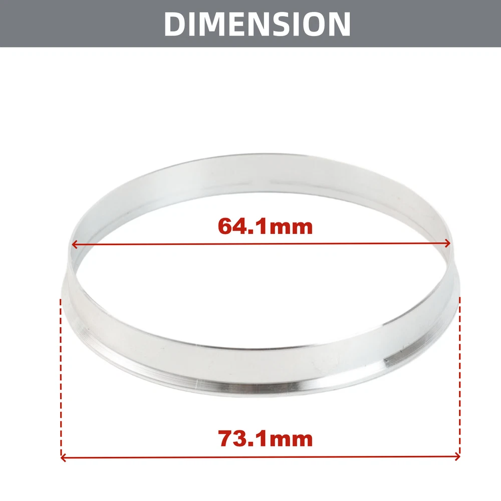 4pcs Wheel Hub Centric Rings Aluminum Alloy ID 2.52" 64.1mm OD 2.88" 73.1mm Please verify the wheel data of your car before buying! This device is installed between the vehicle's hub and the wheel.Ensure a precise fit between your wheel and the hub!!! Specification: Material: Alloy Aluminum Thickness : 0.39"(10mm) Inner Diameter(Vehicle Hub Size) : 2.52"(64.1mm).Your vehicle's hub lip diameter needs to be 64.1mm. Outer Diameter(Wheel Bore Size) : 2.88"(73.1mm).Your wheel's center bore needs to be 73.1mm. Quantity : 4Pcs Description: The hub ring fills the gap between the vehicle hub and the center bore of the wheel. These wheel hub rings are designed to prevent vibration and ensure a smooth and stable driving experience. The outer diameter of the socket ring should match the wheel center bore at the rear of the wheel. The inner diameter is the size of the wheel hub where you plan to install the wheels. If you have any questions, feel free to contact us.