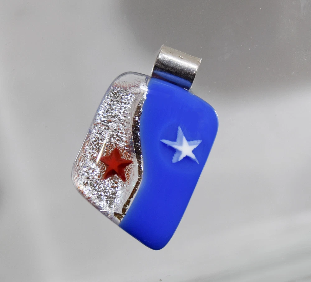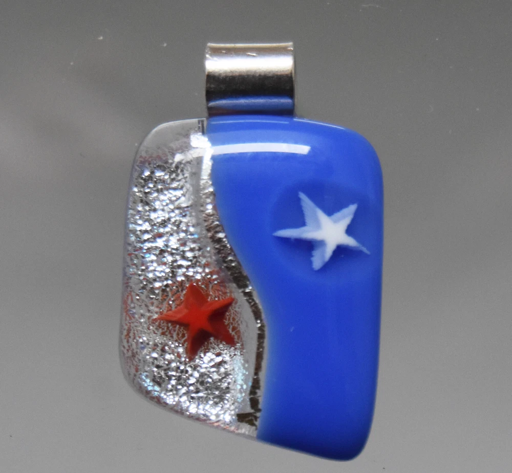 Blue with silver dichroic and 1 red murrini star and 1 white murrini star. The glass measures approx. 1" at the longest point. tags: United States, 4th of July, Independence Day, Memorial Day, USA, one of a kind PLEASE READ IMPORTANT COMBINED SHIPPING INFORMATION BELOW I COMBINE SHIPPING IF PAID IN ONE INVOICE ONLY. EACH ADDITIONAL ITEM ONLY .25 MORE. ADD ITEMS TO CART AND THE DISCOUNT WILL APPEAR. SHIPPING BY USPS FIRST CLASS MAIL. ITEMS ARE PACKAGED CAREFULLY AND NORMALLY SHIP WITHIN 1 BUSINESS DAY OF CLEARED PAYMENT. FIRST CLASS MAIL, WHICH INCLUDES TRACKING. SORRY, NO INTERNATIONAL SHIPPING. Sometimes there are small imperfections in fused glass, which add to the character of a hand made piece.Photos cannot possibly capture the beauty of glass. Please remember individual monitors may show a slightly different color, sometimes a flash is used. Dichroic glass changes color depending upon the light source.Although properly annealed for strength, proper care should be taken in handling. Please note some lots may contain pieces that could be considered slight seconds.