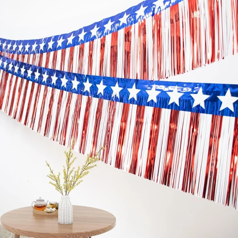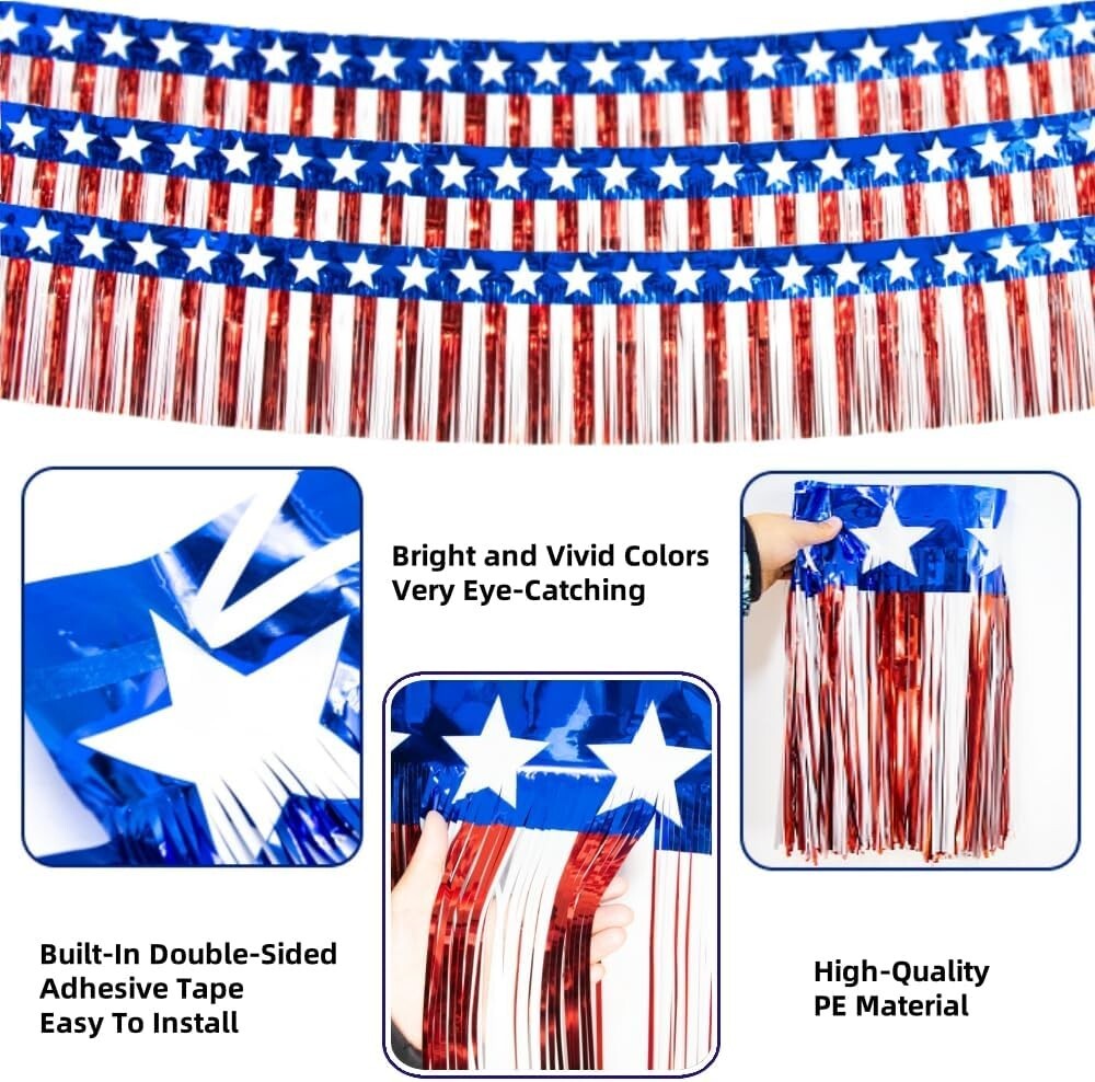 4th of July Decorations 4 Pack 40Ft Tinsel Foil Fringe Garland Streamers Hanging Red White Blue Fringe Backdrop Banner for Parade Floats Decor 4th of July America Patriotic Day Memorial Day About this item 4th of July Decorations 4 of July Independence Day Decor 4 Pack Total 40 Feet Tinsel Foil Fringe Garland Curtains Streamers Banner Wall Hanging Red White Blue Metallic Tinsel Fringe Garland Backdrop Banner for Party Decoration Parade Floats Decorations 4 of July Independence Day America Patriotic Day Memorial Day Labor Day Decor Package Include: The package contains 4 packs of tinsel foil fringe garland streamer banners ( 15 inch width and 10 feet length for each pack, totally 40 feet length) which is long enough for your decoration plan. Festival Customization Unique and Beautiful: This red, white and blue foil fringe garland decoration with the classic colors of the American flag as the theme, with the flowing rain effect, to create a unique and charming visual effect. When decorating places such as walls, doors, Windows or balconies, it can attract the eye and add a festive atmosphere. This decoration is especially suitable for the United States Independence Day and other related holidays, such as National Day, Memorial Day, America Patriotic Day, Labor Day etc. Choosing the classic colors of red, white and blue symbolizes patriotism and free will, and can convey the festive and grand sense to people. Easy to Install: Our red, white and blue tinsel foil fringe garland decoration is designed to be simple and easy to install, and can be easily hung on walls, doors and Windows or other suitable locations. Built-in double-sided tape, easy and convenient to paste. It does not require complex tools or professional skills, and it is convenient for consumers to decorate themselves