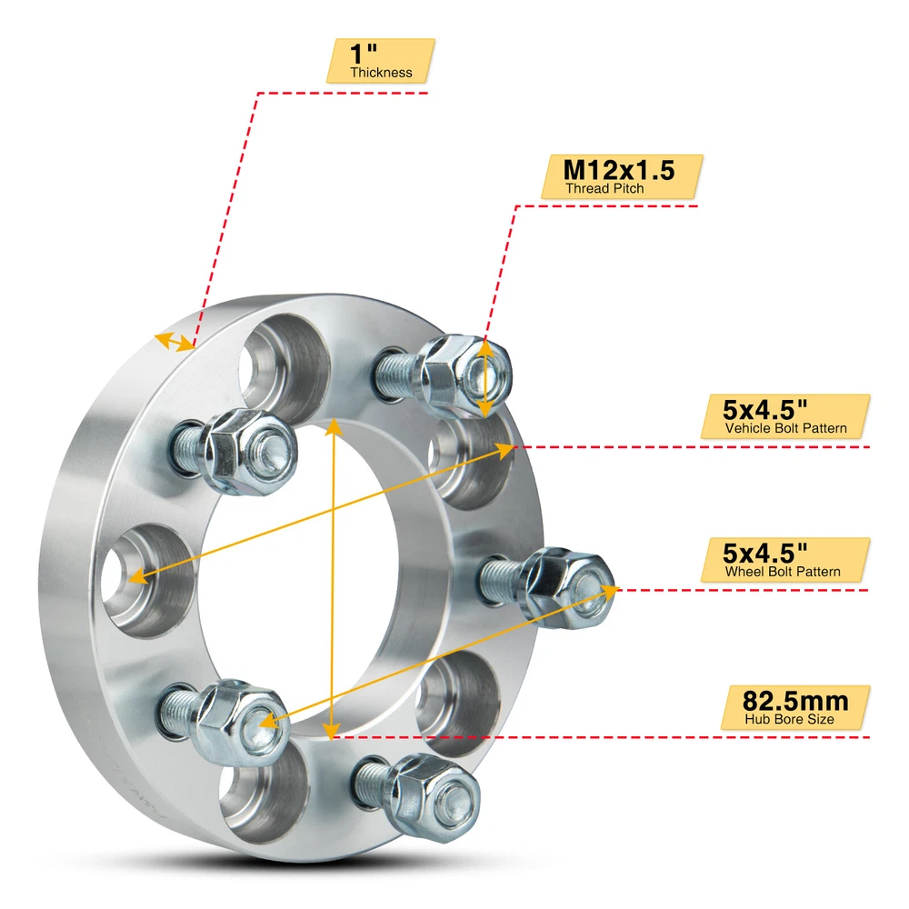 Benefit of wheel spacers: Imporve Better Handling and Increases the Traction,Solves the Adjustment Problems Our hub-centric design offers exceptional stability and safety, offer maximal protection during use Forged from 6061-T6 aircraft-grade aluminum,providing more aggressive and safe driving than casting wheel spacers 6061-T6 Aluminum for Maximum Hardening and Tensile Strength The design of hubcentric with lips more fit for the vehicle hub,reducing vibration at high speeds Good looking on your vehicle and move your wheels further out from the wheel hub allow for larger tire installation to the vehicle Wheel Spacers Details 5x4.5 Vehicle Bolt Pattern 5x4.5 Wheel Bolt Pattern 12x1.5 Open Ended Lugs Included Additional lugs may be required to install onto vehicle Each Spacer is 1" Thick 82.5mm Center Bore 6061 T6 Billet Aluminum CNC Machined Pressed-in 12x1.5 Studs Included Color: Silver Condition: new Quantity: 4pcs Installation Notes: 1. Installation should only be performed by a trained professional. 2. Make sure you get 5-7 FULL TURNS of the lug bolts before tightening. 3. Failure to follow proper procedures may cause your lug nuts to come undone while driving!!! 4. No returns or exchange once installed. 5.Buyers are REQUIRED to take proper measurements to make sure that by adding the spacer. BeneFit For s: 1. Improve Vehicle Stability. 2. Wheel spacers widen your vehicle wheel base, increasing stability, aggressive stance is a free bonus. 3. Increase Clearence. 4. Wheel spacers increase tire to frame clearence to allow installation of lift/lowring kits and wider/larger, high traction tires. 5. Hardened CR-Steel Studs. 6. Forged, heat-treated and hardened ISO/DIN 10.9 (SAE Grade 16) wheel bolts deliver strength and corrosion resistance. What should I pay attention to during installation? 1) Check to make sure that the wheel spacer fits perfectly with the hub/axle stub and the inner mounting surface of the wheel. 2) Make sure that the wheel bolts being used are of the appropriate length, not too long or too short. 3) DO NOT proceed if both of the wheel spacer do not fit. 4) Please be sure to clean the rust on the hub before starting the installation, otherwise it will affect the working life of the spacers. 5) Make sure that you get 5-7 FULL TURNS of the lugs when installing. Torque them down to the manufacturers specs (up to and not greater than 110ft lbs). 6) Avoid using an impact wrench because improper usage may cause the lug nuts/bolts to break or loosen while driving causing a potential injury or accident. 7) All lug nuts, bolts and torque must be checked after driving the first 50 miles after installation. Afterwards, please check all lug nuts and bolts every 3,000-5,000 miles. 8) Alignment is necessary after installation, this will prevent any wobble and vibration from occurring. How to measure the fender gap to choose suitable thickness? 1) Line up a straight edge ruler against the sidewall of the tire, use the measuring device to measure from the inside of the ruler to the inner fender lip. 2) Please take multiple measurements and use the smallest data point.(The most closest spot may be at the front or rear edge of the fender). The maximum recommended spacer thickness= the smallest gap - 3/8"(10mm) Tips & Steps 1. Before purchasing, please measure the hub size and flange thickness you need 2. Detailed installation instructions •Clean the rust stains on the back of the hub and the shaft head before installation to ensure the hub surface is smooth •Set the torque range of the torque wrench •Make sure the brake disc does not rotate when using a torque wrench, otherwise the pad installation may become unstable. •After installation, test whether the wheel hub steering will cause friction with the wheel eyebrow. If friction occurs, it means that the flange of this thickness is not suitable for your vehicle. Please replace it in time. •Regularly check the condition of the flange to see if it is loose 3. Risk warning: • Long-term use of the flange installed on the front wheel may cause oil leakage in the steering gear and damage to the wheel bearings and shaft heads. •Failure to install according to the instructions may cause the gasket to become unstable or even break during driving. 4. For some gaskets with a thickness less than 20mm, the original vehicle bolts cannot be used, which will cause incompatibility, and extended bolts must be used. Payment Shipping Return Policy Contact Us Important Points 1) we accepts all major credit cards via PayPal: MasterCard, Visa, American Express and Discover. 2) We will only ship to the confirmed PayPal shipping address given with the payment. Please make sure your PayPal and eBay address is correct. If not, please correct it before payment. Thank you. 3) If you want to ship to another address, please change your PayPal shipping address before you make payment. 4) To avoid initiating an unpaid item claim, please pay within 7 days. 5) Custom duties, taxes, or charges are not included in the cost you pay to us. We only ship this item to United States ! 1. We ship to your eBay address. Each package will be shipped by UPS or Fedex with tracking number. 2. Ship within 1 business day once payment completed. Orders placed on weekend will be shipped within 3 days. 4. Seriously promise: Refund or resend will be offered if item still not arrive in 7-10 business days. Just send us an email ,we will give you a satisfied solution as soon as possible. If you send us an e-mail, it will be answered within 48 hours during our working hours. Please feel free to contact us if you have any questions: Dear my friend,we appreciate your support.And our goal is service you well and give you a pleasant shopping time in our store. ✅Dear customer, when you want to return or exchange goods (Please contact us first, instead of directly initiating a dispute) 1: Contact the seller first 2: Send pictures: outer packaging&scanned labels&item itself&with comple