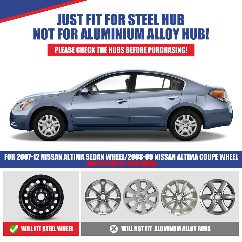 4x 16" Wheel Rim Cover for 2007-2012 Nissan Altima/2008-2009 Nissan Altima Coupe Fitement: For 2007-2012 Nissan Altima/2008-2009 Nissan Altima Coupe Description: π Fits: For 2007-2012 Nissan Altima/2008-2009 Nissan Altima Coupe. π Seamless OEM Fit: Precision-engineered to match the exact specifications of your vehicle's original hubcaps, ensuring a flawless fit that seamlessly integrates with your car's design. π Durable Construction: Crafted from high-quality materials for enhanced durability, our replacement hubcaps are built to withstand daily wear and tear, providing long-lasting performance and protection. π Enhanced Aesthetics: Restore the sleek, factory-fresh look of your vehicle with our OEM replacement hubcaps, designed to maintain the aesthetic appeal of your car while covering unsightly wheel components. π Cost-Effective Solution: Save on dealership prices without compromising on quality. Our hubcaps offer a budget-friendly alternative to OEM parts, giving you a reliable and affordable replacement option. Specification: Quantity: 4 PCS Material: ABS Color: Black Wheel Size: 16 inch Finish: Glossy Placement on VehicleοΌFront/Left/Rear/Right Package Included: 1 Set Hubcaps οΌ4Pcs/SetοΌ Payment Delivery details Terms of sales About us Contact us Payment π We accept PayPal (Recommended), credit card, VISA, Google Pay & Discover etc. π Please submit your payment within 7 days after your purchase. π If not, eBay will automatically open an Unpaid Item Dispute on our behalf if the item(s) are not paid within 7 days. Delivery details π Please double check your delivery address and contact information. π All items will be shipped within 1 business days after payment received. π Tracking numbers will be easily accessible ASAP they are created and processed. Terms of sales π Free 30 days Return, we will cover the return post fee. π If a defective product was received, please do not hesitate to message us via eBay message. π We will response in 24 hours in business to resolve the problem π We stand behind our products. Items can be returned for exchange or full refund within 30 days from the date you receive. About us π Wolfstorm has a huge warehouse and office located in the United States. π All US domestic 48 states customers are able to benefit from the FREE SHIPPING services. π Our experienced, professional customer service representatives offers prompt and courteous service. π Best quality products, outstanding services and professional experience keep our customers. Contact us π Please feel free to contact us if you have any problems. π Emails will be replied within 24 hours in working days. π After hours emails will be replied on the next business day. On Jan 8, 2025 at 02:19:08 PST, seller added the following information: