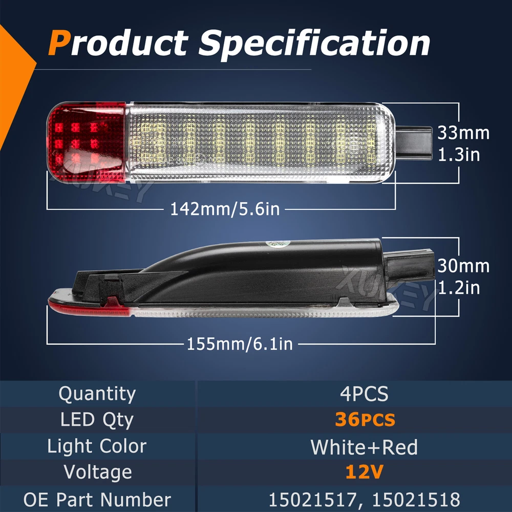4x Car Interior Door Panel Courtesy LED Light For Chevy Silverado 95-07 DOT SAE 4x Red White 36 LED Interior Door Panel Courtesy Light Features: - 36 pcs LED chips. Super bright light output maximizes. - Plug and Play, Error free, no On-board computer error, no FM interference. - DOT SAE E24 approved. - Ultrasonically sealed, IP67 waterproof. Specification: - Lens Color: Clear - Light Color: Red+White - Light Source: LED - LED Count: 36 PCS - Quantity: 4x - Placement: Front Left & Right or Rear Left & Right - Voltage: 12V - Replace OE part number: 15021517, 15021518 Fitment: For Chevrolet & GMC C/K 1500 | 2500 | 3500 Pickup (1997-2000) For Chevrolet & GMC C/K 1500 | 2500 Suburban (1996-2000) For Cadillac Escalade (1999-2006) For Chevrolet Tahoe (1995-2006) For Chevrolet Suburban 1500 | 2500 (2000-2006) For GMC Yukon (1995-2006) For GMC Yukon XL 1500 | 2500 (2000-2006) For Hummer H2 (2003-2009) Package Included: 4 x LED Door Panel Courtesy Lights We accept Paypal and majoy credit cards payment When you place an order, please choose a shipping method and pay for the order including the shipping fee within 48 hours. And please make sure your current address correct after your payment within 1-2 days! About Shipping 1. Receiving time = Processing time + Shipping time 2. Processing Time: Around 1-3 Days 3. Shipping Time: 15-26 Days By Air Mail 3-10 Working Days By Express We do not guarantee delivery time on all international shipments due to differences in customs clearing times in individual countries, which may affect how quickly your product is inspected! Important Notice >Transit Time Is Best Estimated But NOT Guaranteed As Transit Time Varies >Orders may be subject to import taxes, customs duties and fees levied by the destination country.Additional charges for customs clearance must be fulfilled by the recipient; We no control over these charges, nor can we predict what they may be. 100% Customer Satisfaction Is Our Top Priority For Any Reasons You Are Not Satisfied With The Products Within 30 Days Of Purchase, Return Or Exchange Can Be Issued, Customers Are Responsible For The Return Shipping Cost And Subsequent Replacement Shipping Cost For An Exchange Item. Replacement Item Will Be Processed And Shipped Upon Return And Inspection Of The Original Item. Return Items Must Be In Their Original Packaging And Unused Condition, Or They Will Be Rejected And Sent Back To You. Due To The Nature Of The Products We Sell, We Carefully Inspect All Packages Prior To Shipping. All Of Our Products Are Sold As Brand New, All Damaged Products Are Considered Damaged During Transit. If You Received A Damaged Or Broken Item, Please Save All Packaging Material And Paperwork And Contact Us Immediately So We Can Help You With The Damage Claim With The Shipping Carrier. No Claims Will Be Honored After 14 Days Upon Item Receive. Digital Photos Will Be Required For All Cases. All Products Come With A 60 Days Limited Warranty Against Manufacturer’s Defects. No Exchange Will Be Issued On Products That Have Been Damaged In Any Way. Warranty Does Not Applied To Improper Installation, Water / Fire Damage, Modification, Or Any Acts Of Nature . If you have any question or concern, please feel free to contact us via eBay massage directly, we will get back to you as soon as we are available ATTENTION : We do not answer any emails over the weekend Please send message to us.We will reply your message in 24 hours, Our working time: 9:00 AM-22:30 PM (GMT+ 08:00 Beijing) 1:00 AM -14:30 PM (GMT+ 00:00 London) 19:00 PM-08:30 AM (GMT- 06:00 USA/Canada) Why Choose us? 1. A tremendous variety of products-- With over 200,000 items in stock, we are one of the world's largest online stores in automotive aftermarket product sector. You'll have more choices than what you can ever imagine. What's more, we're updating with over 100 new arrivals per month! 2. Affordable prices -- we are offering the latest car parts and accessories for almost 20 years, we're always keeping up with the newest trends, while most importantly, making the prices as low as we can. 3. Free worldwide shipping -- Yep, you won't believe that you'll enjoy free worldwide shipping with us (unless stated otherwise),it's not a joke,but an absolute truth. 4. No-question refund and return-- Anything wrong issuing quality and breakage can be returned or refundable. 4x Red White 36 LED Interior Door Panel Courtesy Light Features: - 36 pcs LED chips. Super bright light output maximizes. - Plug and Play, Error free, no On-board computer error, no FM interference. - DOT SAE E24 approved. - Ultrasonically sealed, IP67 waterproof. Specification: - Lens Color: Clear - Light Color: Red+White - Light Source: LED - LED Count: 36 PCS - Quantity: 4x - Placement: Front Left & Right or Rear Left & Right - Voltage: 12V - Replace OE part number: 15021517, 15021518 Fitment: For Chevrolet & GMC C/K 1500 | 2500 | 3500 Pickup (1997-2000) For Chevrolet & GMC C/K 1500 | 2500 Suburban (1996-2000) For Cadillac Escalade (1999-2006) For Chevrolet Tahoe (1995-2006) For Chevrolet Suburban 1500 | 2500 (2000-2006) For GMC Yukon (1995-2006) For GMC Yukon XL 1500 | 2500 (2000-2006) For Hummer H2 (2003-2009) Package Included: 4 x LED Door Panel Courtesy Lights PAYMENT We accept Paypal and majoy credit cards payment When you place an order, please choose a shipping method and pay for the order including the shipping fee within 48 hours. And please make sure your current address correct after your payment within 1-2 days! SHIPPING About Shipping 1. Receiving time = Processing time + Shipping time 2. Processing Time: Around 1-3 Days 3. Shipping Time: 15-26 Days By Air Mail 3-10 Working Days By Express We do not guarantee delivery time on all international shipments due to differences in customs clearing times in individual countries, which may affect how quickly your product is inspected! Important Notice >Transit Time Is Best Estimated But NOT Guaranteed As Transit Time Varies >Orders may be subject to 