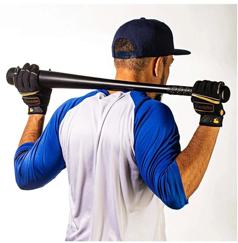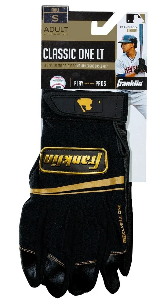 Step up your baseball game with these Franklin Sport Classic One LT MLB Baseball Batting Gloves. Designed for adult small hands, these gloves come in a sleek black and gold color combination. Made with a combination of nylon and leather materials, these gloves are durable and perfect for any baseball player. Featuring an adjustable wrist strap and a 5 finger design, these gloves provide maximum comfort and protection during any baseball game. Sold in pairs, these gloves are perfect for any batter looking to up their game. Hand wash only for best care and maintenance.
