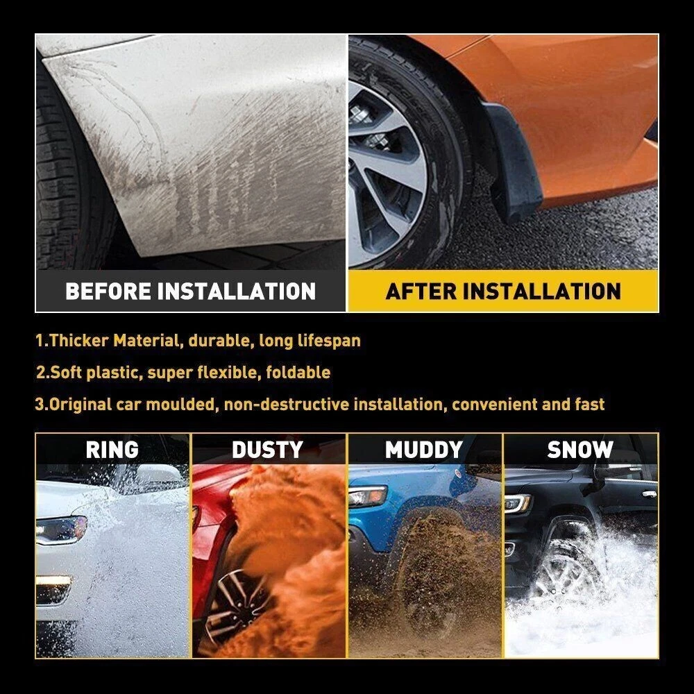 Description This listing is for 4 pieces of Splash Guards for T oyota Camry Sedan 2012-2014 These splash guards will help to deflect mud, snow and ice away from lower body panels. Can effectively protect the paint of your vehicle. Made with high quality automotive grade PVC plastic material, odorless. It is durable and long lasting under any weather situation. Feature 100% Brand new 4 pieces splash guards. Includes all mounting hardware for installation. A perfect, guaranteed-fit for your vehicle. No-drill installation. Heavy-duty black PVC plastic construction resists cracking. Contoured design complements vehicle lines and gives excellent protection. Performance tested for extreme weather conditions, cold, heat, vibration and impact. By reusing existing factory body holes the installation doesn't break the factory applied corrosion package. Packing 1 Complete Set of 4 piece(2 Front and 2 Rear) Mud Splash Guard Shown In Pictures On Feb 10, 2025 at 02:24:09 PST, seller added the following information:
