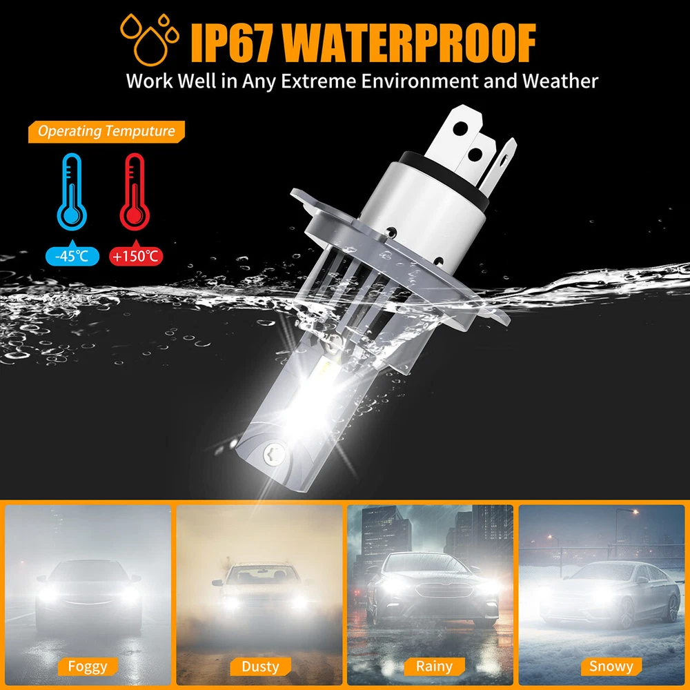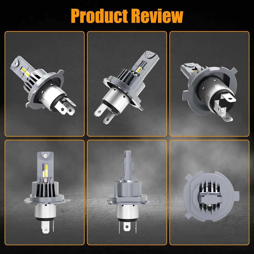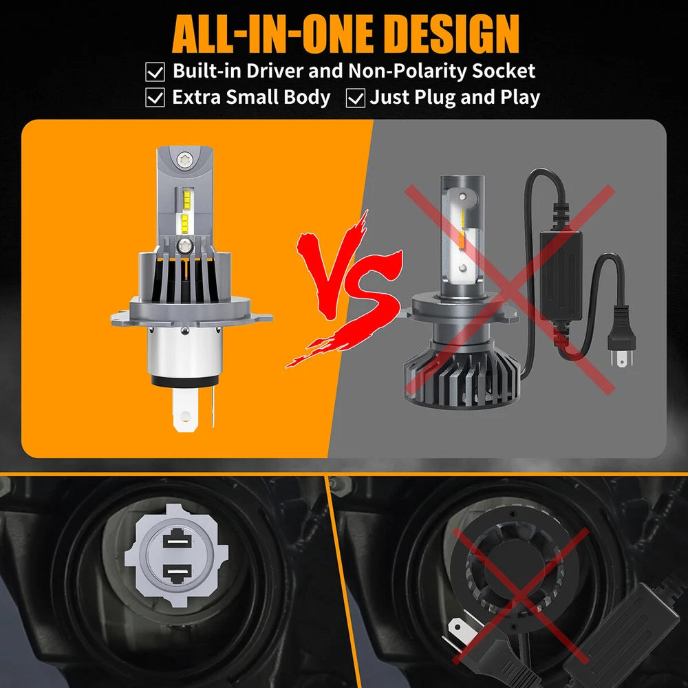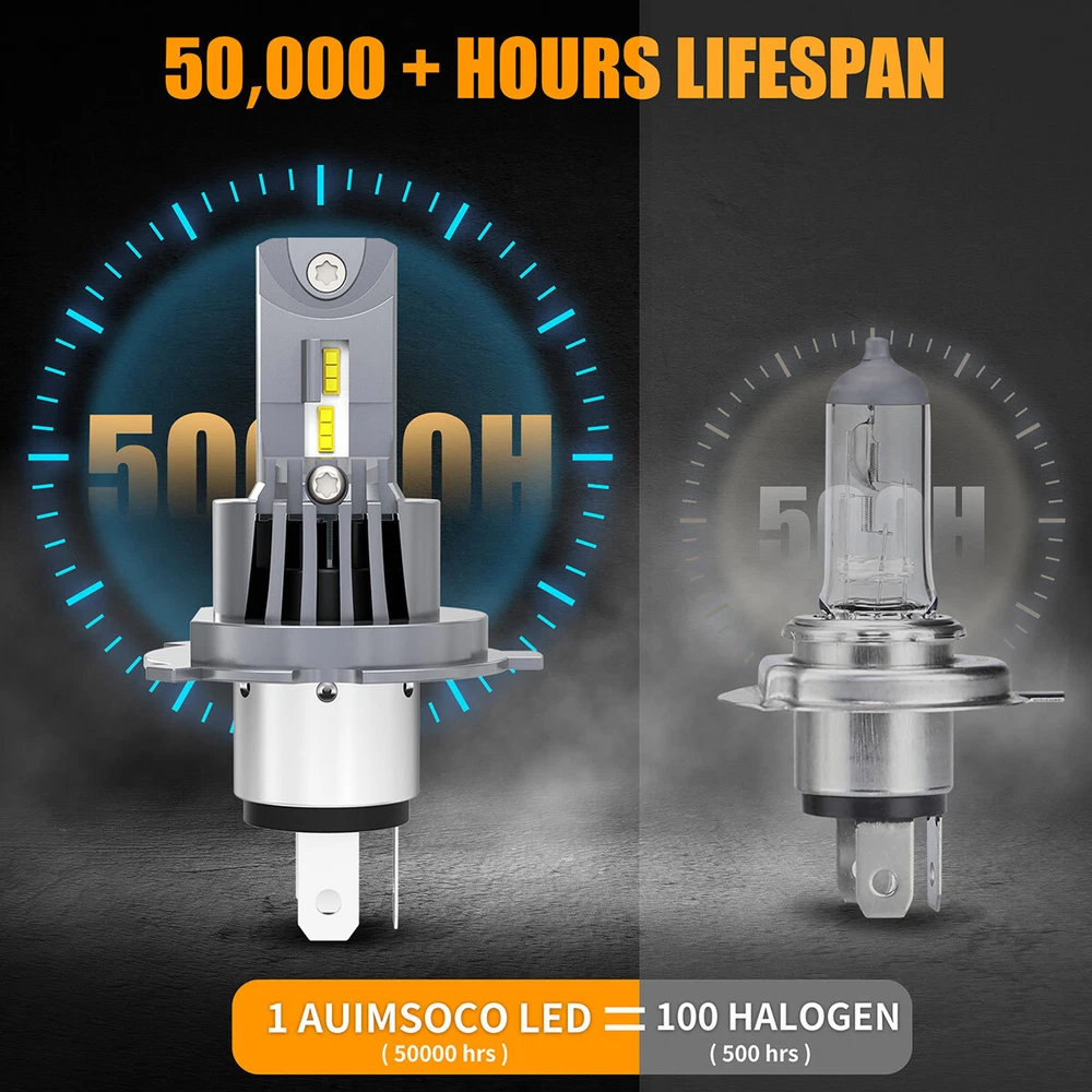 Feature Super Bright: Truly 40W, 4000LM, 6500K White per pair with a better intense and focused light output, 300% brighter as orignal H4 halogen bulb, make you see more clearer at driving in the dark/night. *Optimum Beam Pattern: 1:1 filament design same as halogen bulbs, AUIMSOCO customzied led chips, same output as halogen bulb with a clear cut off line. No blind oncoming traffic. *5 Minutes Installation: No Polarity, Wireless design, same structure design as halogen bulb, just Plug & Play. *Efficient Cooling System: Copper plate cooling + built-in high-efficiency fan + Whole aviation aluminum body, Intelligent IC make sure the LED conversion kits last longer. *Warranty: Money back guarantee and 5 years warranty. Product Details: Model: 9003/H4 H11 Usage: Headlight + Fog Light Voltage: DC 11-30V Power: 40W Lumen: 4000LM Color Temperature: 6500K LED Chips: AUIMSOCO customized LED chips Material: Aviation 6063 aluminum profile Fanless: Built-in integrated fan Lifespan: 30,000 hours Waterproof Rate: IP67 Operating Temperature: -45℃~+150℃ Warranty: 5 years warranty Package: 4x led bulbs Fitment system may not be 100% accurate, if you are not sure which bulb size you need, please check vehicle manual or stock bulb model. Why Choose AUIMSOCO A51plus H4 LED Headlight Bulbs? Our AUIMSOCO H4 led bulb with excellent heat dissipation design with intelligent temperature control chip, power up to 40W, 1:1 halogen lamp design, Built-in fan for cooling, no need for specific adapter, built-in smart IC driver, make most vehicles no error warning or Radio interference, but some sensitive models may require a canbus decoder. The upgraded H4 solves installation problems and post-installation flickering on most models.