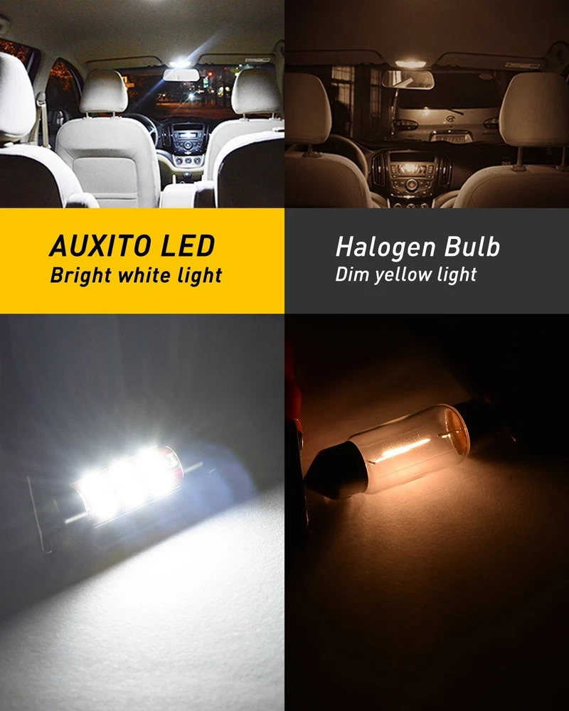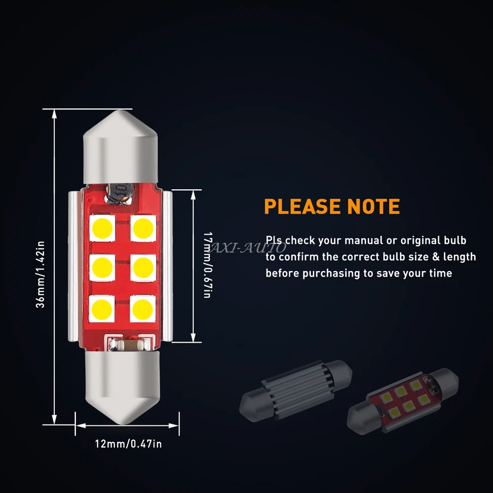 Features: Working voltage: 10-30V DC,(under 12v:0.17A,Power:1.8W/PC), Color:6000K Xenon White, SIZE: AS photos showed. Cross Reference Number:6411 6413 6418 DE3423 DE3425 etc Each bulb has 6 pcs 3030 LED chips on it, 3030 SMD led chip provides the highest luminous efficiency compare to the other SMD led chips in the market. Ideal for people who are looking for extremely bright led bulbs Built-in intelligent constant current IC driver for quality performance,CANBUS error free and no polarity design,aluminum body design for better heat dissipation,low temperature,low power consumption,longer lifespan up to 50,000 Hours 4x White 6418 36MM 6411 LED Interior Bulbs Dome Map Trunk License Plate Light EX Features: Working voltage: 10-30V DC,(under 12v:0.17A,Power:1.8W/PC), Color:6000K Xenon White, SIZE: AS photos showed. Cross Reference Number:6411 6413 6418 DE3423 DE3425 etc Each bulb has 6 pcs 3030 LED chips on it, 3030 SMD led chip provides the highest luminous efficiency compare to the other SMD led chips in the market. Ideal for people who are looking for extremely bright led bulbs Built-in intelligent constant current IC driver for quality performance,CANBUS error free and no polarity design,aluminum body design for better heat dissipation,low temperature,low power consumption,longer lifespan up to 50,000 Hours Wide application: The led bulbs can be used for license plate tag light, interior map lights, dome light, trunk cargo room lights, side door courtesy light, dash board light, instrument lamp door light, reading lights, glove box lights, parking lights etc Package includes 4pcs Led bulbs . We offer 12 months warranty on item(s) damaged during the shipping or confirmed to be a manufacturer defect. Friendly customer service responses within 24 hours on business days Item Specifics Manufacturer Part Number 6k 36mm Error free led lamps kit Brand AUXITO Voltage 12V To Fit License Plate Light Interior Map Dome Bulb Fitment Code 36mm Number of Bulbs 4 Light Color Clear Color Temperature 6000K Type Light Strip Wattage 6W Placement on Vehicle Front Rear Interior Manufacturer Warranty 1 Year Fitment Type Direct Replacement Fitment Type Direct Replacement Payment We only accept PayPal payment, should be received within 3 days from the date of purchase. Please keep the consistency of Paypal address and ebay address. Payment should be made within 4 days once you won a item ,or ebay will launch Unpaid Reminder agaist you and there will be bad record on your ebay account . Buyers are responsible for import duties, custom fees and taxes.Please check with your country's custom office to determine the additional costs before you finally make the purchase Shipping All items will be shipped in 48 hours after receiving your payment . We ship this item to US only via USPS first class mail. It usually takes 3-6 working days to deliver. Returns We offer 30 days return policy. Please contact us within 30 days t from the date you receive your order if you have any issues with the product or want return .Refund will be send after we got your resend package. All returned items should be in the original packaging , return tracking information should be provided .. Buyer is responsible for return shipping cost due to the problem not caused by item quality itself . Contact Us Our office hours are MONDAY - FRIDAY 9:00PM - 6:00PM PST, but we will response you once we get your message .There will be some delay on response if you send message or E-Mail on weekend. FAQ Q1: Will this bulb fit my vehicle? A: We can match almost any vehicle to one of our bulb sizes. eBay only lets us include partial vehicle fitments per listing, but if your vehicle does not show up on the compatibility table at the top of our listings, welcome you to contact us for free consulation before purchasing a product. Q2: My item has not arrived, what's taking so long? A: Sometimes items take longer than expected, especially if it’s going far or to rural area. Check with your post office to see if your item has been held up. Sometimes USPS will not update a tracking number until it has arrived at its destination. If your item still has not arrived after a few days, let us know so we can double check for you and help solve it asap. Q3: Do I need to mention the Year, Make and Model in the notes when place order? A: YES. Please include the Year, Make, and Model in the notes section during checkout to ensure you receive everything needed for your kit! Q4: My bulbs won't fit, help! A: Special bulb holder may be required. See if you can take the holder from the stock bulb. If not, let us know. The bulb size may be wrong, double check the item you received with the item you ordered. Do you have an aftermarket lighting housing? These may not be perfectly fitted for aftermarket bulbs and will require some manual modifications. Q5: Neither side lighting up? Both sides flicker, flash, or work inconsistantly. A:Check the headlight fuses, and then check the ballast plugs to insure correct installation. If this doesn't work, there may be a voltage problem with the vehicle. You probably just need a relay or capacitor. Q6: WARNING ABOUT POLARITY Unlike halogen bulbs, LED are polarity sensitive. BEFORE you start your LED kit installation, verify the polarity on your vehicle by simply plugging the LED bulb into your vehicle socket. - if your light turns on, please proceed to install both bulbs onto your vehicle. - if your light DOES NOT turn on, disconnect the bulb and flip the socket in order to reverse the polarity (this will not damage your vehicle electrical system in any way). Once you made sure the LED bulb turns on, please proceed to install both bulbs onto your vehicle. Note: There is no convention when it comes to polarity. Different car manufactures have different polarity setup, even within the car model the polarity setup on your low beams and high beams might be different. DESCRIPTION PAYMENT SHIPPING RETURN POLICY CONTACT US Shop Category Store Hom