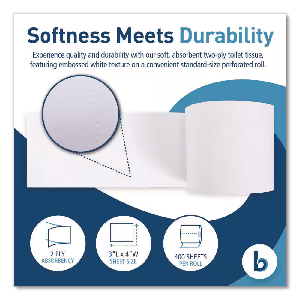 Fast Shipping On All Items 30 Days Money Guarantee Customer Support Excellent Service 100% Satisfaction Satisfaction Guaranteed 4 In. X 3 In. White Septic Safe 2-Ply Toilet Paper, 400-Sheets per Roll, (9-Rolls/Carton) Specification Color White Color Family White Commercial/Residential Commercial Features Made of Recycled Materials Number of Ply 2 Ply Number of Rolls in Pack 96 rolls Number of Sheets 38400 Number of sheets per roll 400 Pack Size 96 Recycled Materials (%) 100 Returnable 90-Day Certifications and Listings No Certifications or Listings Roll Diameter (in) 4.25 Roll Length (ft) 100 ft 100.0 ft. Item Description Made of 2-ply, textured tissue for superior absorbency Includes 9 rolls with 400 sheets per roll Septic-safe toilet paper ensures reliable use Quality, durable toilet tissue that's soft and absorbent, yet available at an economical price. Two-ply, durable, embossed white tissue on a standard size perforated roll. Individually wrapped for maximum cleanliness and safety. Ideal for use in any industrial, office, restaurant, or retail bathroom where standard size rolls are used. Fits within standard size toilet-roll paper holder or dispenser. Soft, two-ply, textured, perforated paper. Embossed, standard size roll. Economical and reliable. Quality, durable, and absorbent toilet tissue. Individually wrapped. Septic safe. About us We offer the best prices around on high quality products. Our E-store includes media such as books, movies, music and games while offering electronics, toys, sporting apparel, clothing, tools, general home, garden items and more. Shipping We are always working hard to ensure your package arrives as soon as possible. Please understand that some factors like weather, high postal traffic, and the performance of shipping companies are outside of our control. We offer free shipping to the lower 48 states and ship within 2-3 business days of payment, usually sooner. We do not accept P.O. Boxes. Please provide a physical address. For shipping outside of the continental USA, we only use eBay's Global Shipping Program.The item is shipped to KY and then sent to the rest of the world. International customers are responsible for all duties and taxes. Continue to check out to calculate costs for shipping the item to your country. Messages regarding eBay's Global Shipping Program MUST be directed at eBay EXCLUSIVELY. Returns We offer a 30-Day Return Policy on items in which you are not completely satisfied with. You have the option of a full-refund or an exchange of the item. No returns are available on items shipped outside of the USA Satisfaction We try over very best to make sure every customer is completely satisfied. If there's a problem, message us! We're happy to help. Payment Options Shop With Confidence