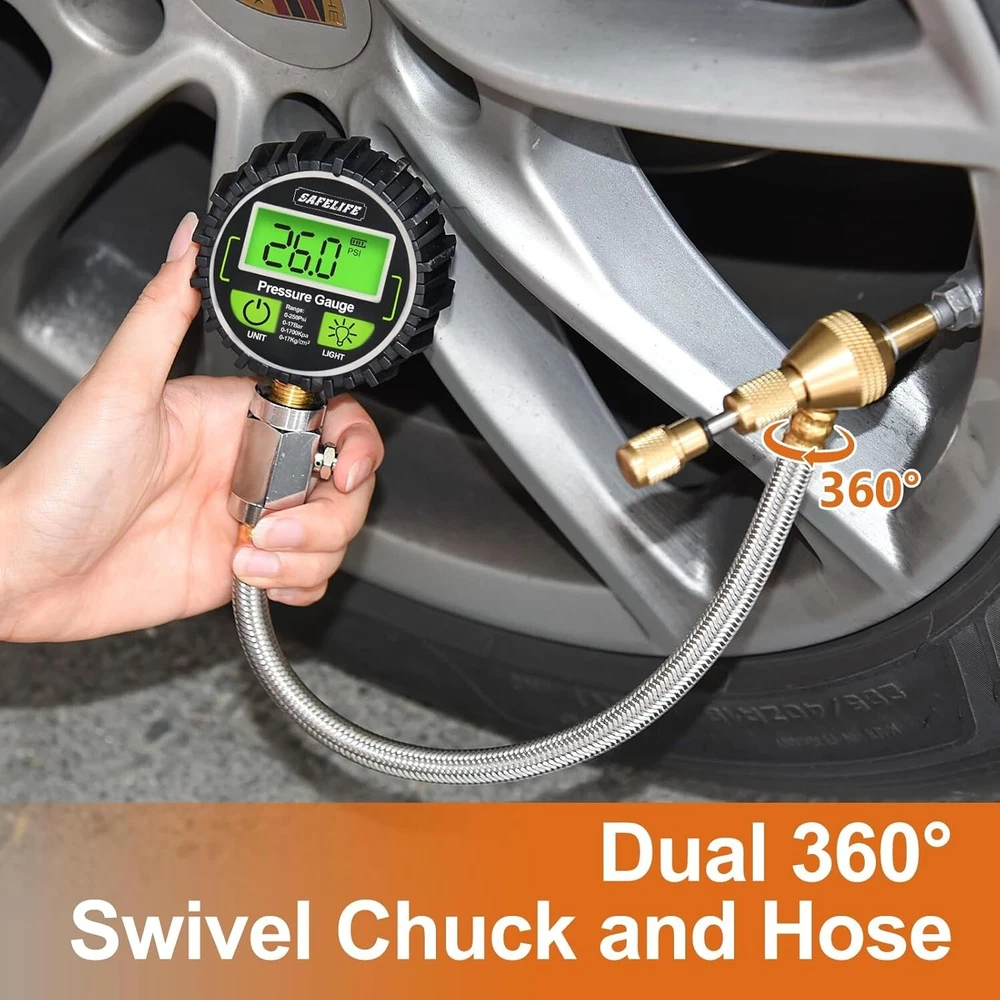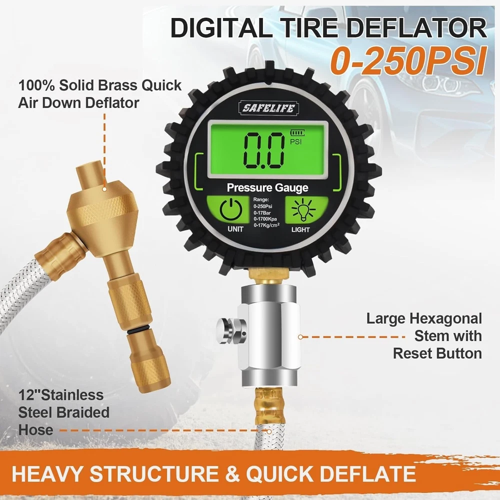 4x4 Digital Tire Deflator kit๏ผProfessional Tire Pressure Gauge 250PSI, Rapid Air Description : ๐๐๐ ๐๐๐๐ ๐ ๐๐๐ & ๐๐๐๐๐๐๐๐ : SAFELIFE heavy-duty 4x4 tire deflator is a precisely designed, all-in-one system that removes the valve core for fastest deflation and allows you to stay in control to accurately attain your desired tire pressure for certain tire traction. Simply just slide the Deflator and you could switch from Instant-Pressure-Reading and Keep-On-Deflating. ๐๐๐๐๐๐๐๐ & ๐๐๐๐๐๐๐ : The digital tire deflator features a bright LCD backlit screen for perfect visibility anytime. Displays large numbers in 4 units by PSI, KPA, Bar, and Kg/cmยฒ. Accurately measures a range from 0-250 PSI (0-17Bar; 0-1700Kpa; 0-17kg/cmยฒ). ๐๐๐๐๐๐ ๐๐ ๐๐๐๐๐๐๐ : The slide of tire deflator operates smoothly without any binding. Simply just slide the collar in to read pressure, slide the collar back out to keep deflating. ๐๐๐๐๐ ๐๐๐๐๐๐๐๐๐ & ๐๐๐๐๐๐๐ : This Air Down Tire Deflator is made of 12-inch braided steel hose, premium brass components and large hexagonal stem. This robust and durable precision tire deflator tool is also surrounded by a rubber bump guard to protect against drop damage and is easy to grip. ๐๐๐๐๐๐ ๐๐๐๐๐๐๐๐๐๐๐ : Our tire deflator is compatible with various vehicles, including motorcycles, bikes, trucks, SUVs, and off-road vehicles. It is a must-have accessory for all overland adventure and off-road trips, ensuring optimal tire pressure for improved traction and overall performance in various terrains.
