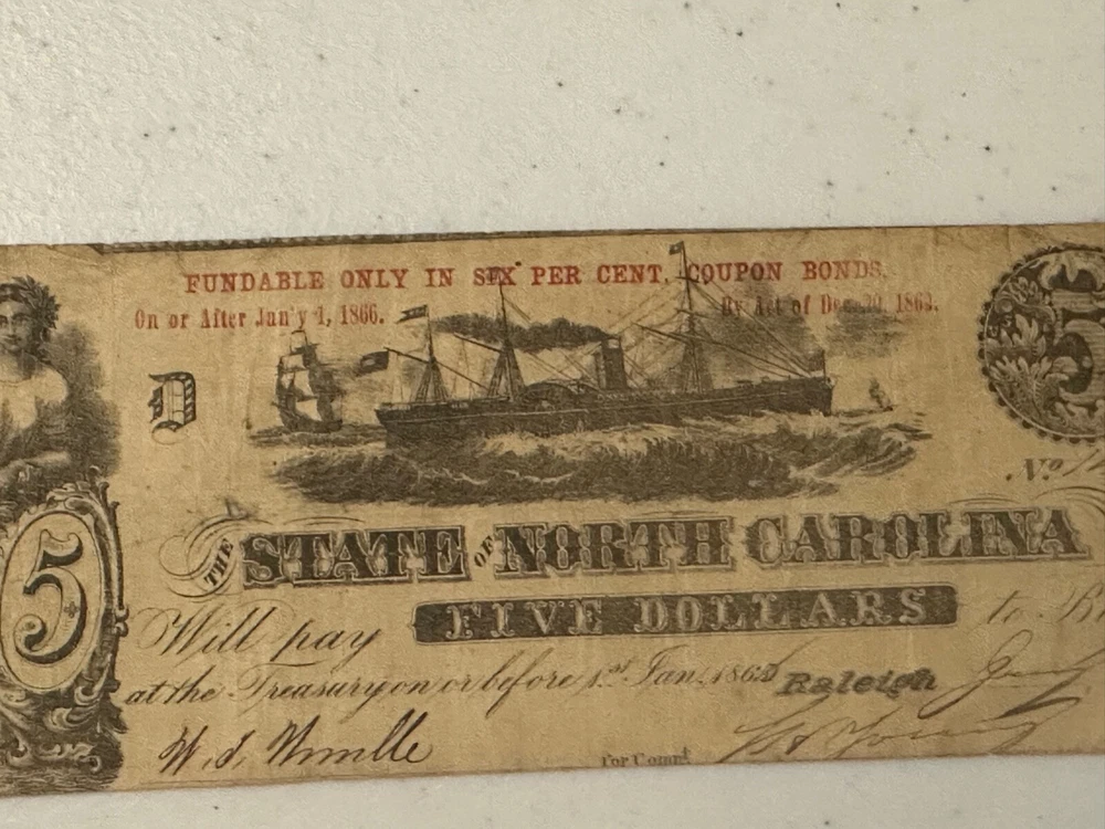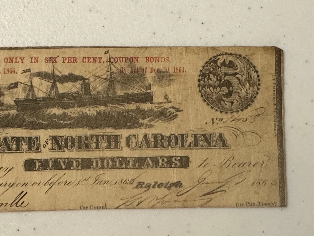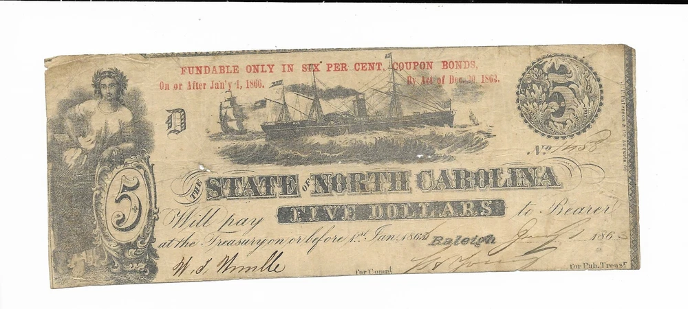 This State of North Carolina Red "Fundable ONLY IN SIX PER CENT. COUPON BONDS" Obsolete Bank $5 Note is issued. Note is in Fine condition with a serial number 1458. The Normal Overprint is Fundable in six per cent bonds. This note has the word "Only" added to the clause. See Shull Obsolete Book. R8 Look at the Photos Carefully! This is a one-of-a-kind note! What you see is what you get! 100% Customer Satisfaction with a 30 Day Money Back Guarantee--No Questions Asked! We Pride Ourselves on Our Customer Service and Our 100% Positive Feedback. We Try Harder to be the Best Seller on eBay!! Contact us if you have any questions at all. We appreciate you as a customer! Check out my other items ! Be sure to add me to your favorites list ! Sign up for my email newsletters by adding my eBay Store to your Favorites DSS-SDD Great Gift !!