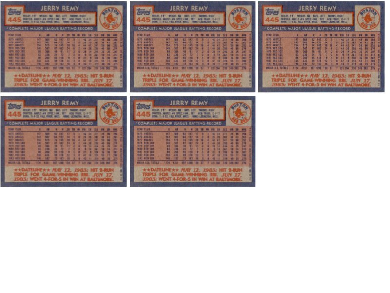 (5) 1984 Topps #445 Jerry Remy Boston Red Sox Card Lot Condition: NM-MT