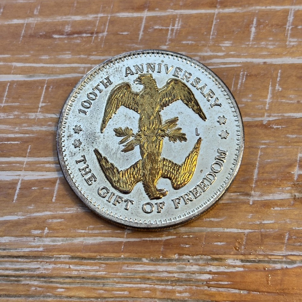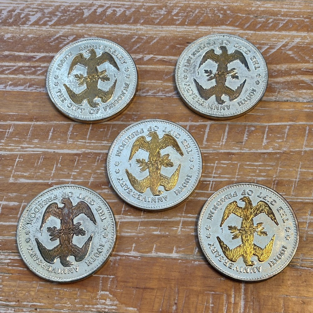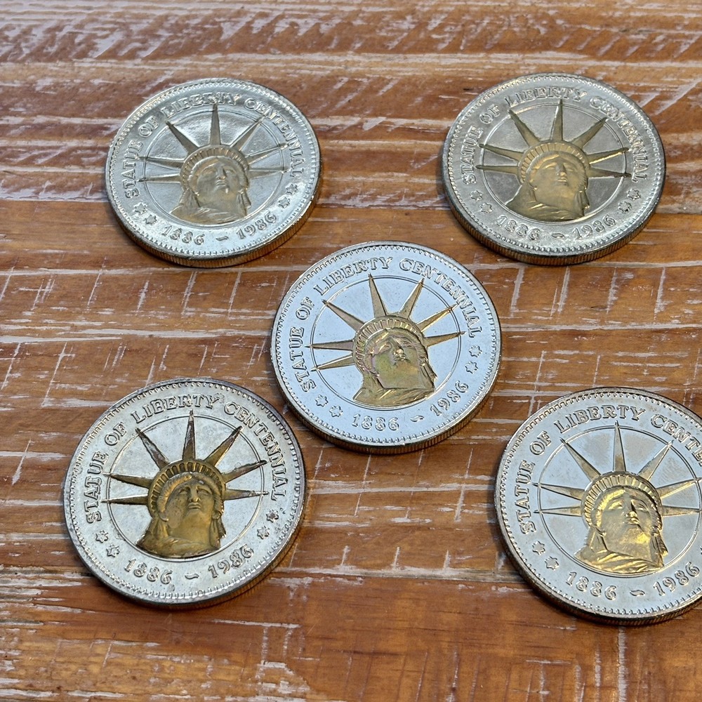 The product is for (5) 1986 Statue of Liberty 39mm Centennial Token/Medal/Coins commemorating the 100th anniversary of the statue. Made of nickel and copper with a fineness of 0.999, the token/medal/coins were minted in the United States. They area a circulated piece that holds historical significance as a commemorative item celebrating a significant anniversary of the iconic Statue of Liberty.