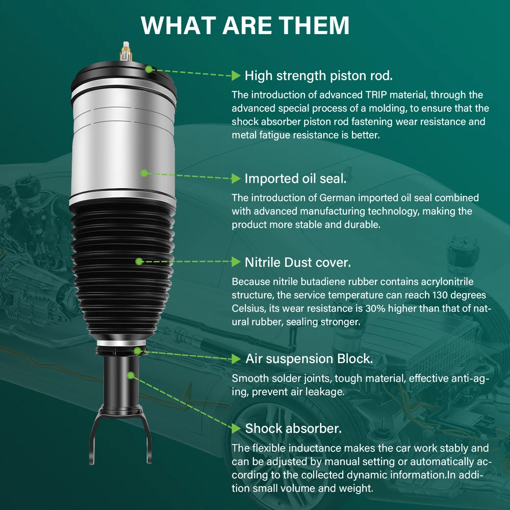 *Compatibility Chart 1, You can distinguish specific model of an automobile by VIN(Vehicle Identification Number). 2, VIN(Vehicle Identification Number) consists of total 17 English letters and arabic digits. 3, VIN does not include the letters I (i), O (o), and Q (q) (to avoid confusion with numerals 1 and 0). Dodge RAM 1500 2013-2018 *OEM Part Number: Front Air Suspension Strut: 04877147AF,04877147AC,04877147AG,04877147AD,04877147AB Rear Air Suspension Spring:4877136AA,4877136AB,04877136AA,04877136AB,68248948AA 5 Air Suspension Spring Shock Compressor Assembly Fits Ram 1500 13-19 Cab Pickup *Compatibility Chart 1, You can distinguish specific model of an automobile by VIN(Vehicle Identification Number). 2, VIN(Vehicle Identification Number) consists of total 17 English letters and arabic digits. 3, VIN does not include the letters I (i), O (o), and Q (q) (to avoid confusion with numerals 1 and 0). Dodge RAM 1500 2013-2018 *OEM Part Number: Front Air Suspension Strut: 04877147AF,04877147AC, 04877147AG,04877147AD, 04877147AB Rear Air Suspension Spring: 4877136AA,4877136AB,04877136AA,04877136AB,68248948AA Air Suspension Compressor: 68041137, 68204730, 68041137AF, 68041137AC, 68041137AD, 68041137AE, 68041137AF, 68041137AG, 68204730AB, 68204730AC, 68204730AD, 68204730AE, 68204730AF, 68204730AG, 68232648AA *Item Specifications: Key Words: 5 PCS Front Air Suspension Shock Strut & Rear Air Suspension Spring Compressor For Dodge Ram 1500 Limited Rebel 2013-2019 Package Includes: 2 PCS Front Air Suspension Shock Strut & 2 PCS Rear Air Suspension Spring & Air Suspension Compressor Notes : Please double confirm the compatibility as well as the OEM number before purchasing. Instruction is not included. Professional installation is recommended. * Generation & Evolution: Dodge Ram Pickup First generation(1981-1993) D/W Second generation(1994-2002) BR/BE Third generation(2002-2009) DR/DH/D1/DC/DM Fourth generation(2009-present) DS/DJ/D2 Fifth generation(2019-present) DT *Removal Guideline: Caution: Damage to the vehicle and air suspension system can be incurred if work is carried out in a manner other than specified in the instructions or in a different sequence. To avoid the possibility of short circuits while working with electric components consult your owner's manual on how to disconnect your battery. Consult your vehicle owner's manual, service manual, or car dealer for the correct jacking points on your vehicle and for additional care, safety and maintenance instructions. Under no circumstances should any work be completed underneath the vehicle if it is not adequately supported, as serious injuries and death can occur. 1.Set steering to straight ahead. 2.Raise vehicle. 3.Remove applicable front wheel.(picture 1) 4.Loosen and remove the tie rod end nut.(picture 2) 5.Loose and remove the two sway bar end link nuts.(picture 3,4) 6.Loosen and remove the upper control arm nut.(picture 5) 7.Loosen and remove the nut and bolt from the bottom strut fork.(picture 6) 8.Loosen and remove the air fitting from the top of the strut.(picture 7) 9.Loosen and remove the three top strut mounting nuts.(picture 8) 10.Remove the strut.(picture 9) 11.Removal complete. *Installation Guideline: 12.Install the new strut into the vehicle.(picture 10) 13.Install the three top strut mounting nuts and tighten to manufacturer's specifications.(picture 11) 14.Remove the white shipping pin from the air strut and discard.(picture 12) 15.Remove the existing air line elbow, and then install the new elbow onto the air line.(pictures 13,14) 16.Install the air line until fully seated, pulling outward slightly to confirm engagement.(pictures 15,16) 17.Install the upper control arm nut and tighten to manufacturer's specifications.(picture 17) 18.Reinstall the strut's bottom nut and bolt and tighten to manufacturer's specifications. 19.Reinstall and tighten the two sway bar end link nuts to manufacturer's specifications. 20.Reinstall the tie rod end nut and tighten to manufacturer's specifications. 21.Re-install applicable front wheel. 22.Lower vehicle. 23.Installation complete. * Frequently Asked Questions : How to prevent the damage of air springs/How to extend the service life of air springs/struts etc.? An air strut with separable air springs If your vehicle offers a separable air suspension (Audi Allroad A6 C5, Mercedes-Benz W164, BMW X5, etc.), you should regularly (about once a week) lift the car to the maximum position, and remove dirt with a high-pressure cleaner (keep the cleaner at a distance to the air spring about 30 cm/12 inches, otherwise water pressure can damage the air spring). The highest position may vary depending on your model and regulation options. Therefore, please test this by trying the different modes available to you (Sport, comfort, dynamic, off-road) and choose the one that sets your vehicle to the highest position. The dirt will most likely be found under the fold of the pneumatic chambers. If you find a frozen layer of bitumen on the piston guide (the part of a strut on which the air spring is installed), it is recommended to clean it as well. Whenever possible, avoid riding on fresh asphalt, as fresh bitumen mixed with sand immediately results in a build-up of abrasives on the piston and in turn contributes to accelerated wear and tear of the air spring. A complete air suspension shock Many cars such as Mercedes W220 or W211 are set up with a complete air strut - shock absorber and air spring visually form a complete spare part. In many cases, you can easily recognize these by the metal cups with which the air spring is tightly mounted. To best avoid any damage, we highly recommend to regularly check the condition of the dust protection seals of the air strut. What is the difference between an air spring and an air strut? The air spring is a part of the air strut. Some vehicles (e.g. Mercedes ML) allow you to change the air spring separately. At our online shop you have the opportunity to buy either t