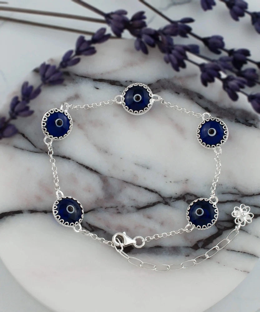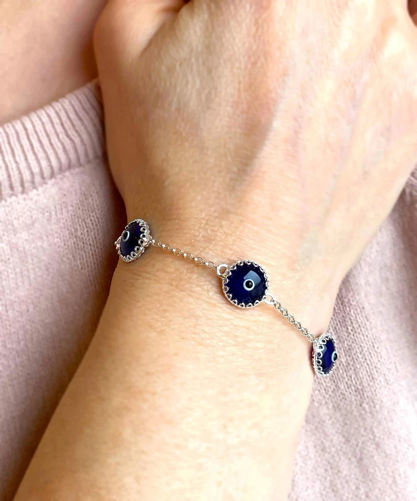 Sterling Silver Dark Blue Evil Eye Women Link Bracelet Designed by our artisan, strong rolo chain, each 5 bead is wrapped by silver 17 prongs from front and back side. The Evil Eye is a powerful amulet that has been used for centuries. It wards off the "Evil Eye" and protects you from bad luck, envy, and gossip. Measure for all bracelets is approximately 0.45" width, the length is 7.00" and it has 2.00" extension. Total length is 9.00". Easy adjustable for your wrist. Bracelet weight is 4.40 gr / 0.15 oz. Secured with lobster claw clasp. Comes with a free velvet pouch and a gift box.