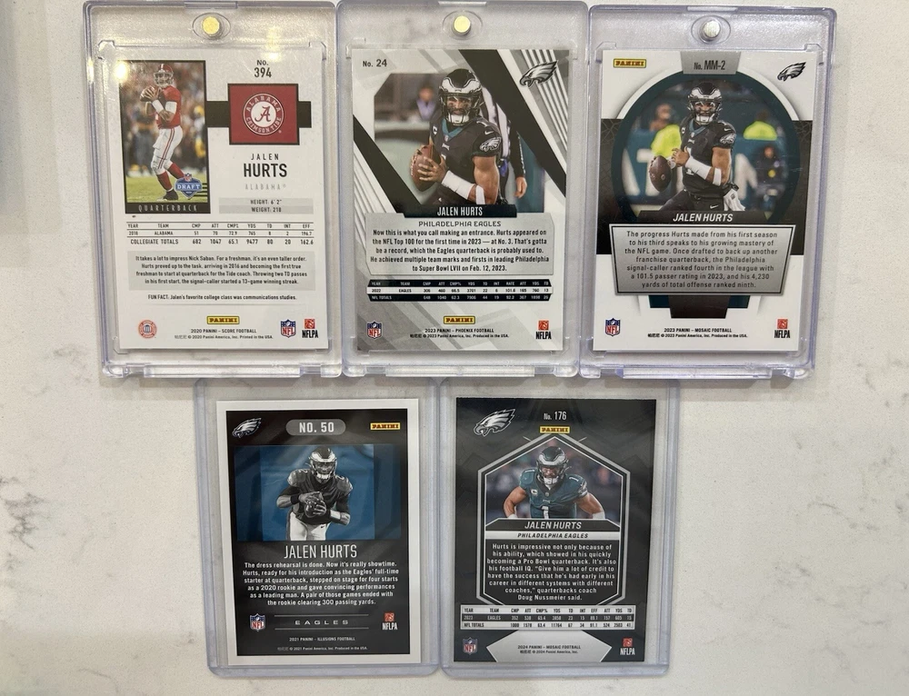 Sport:FootballType:Sports Trading CardNumber of Cards:5Card Name:Jalen HurtsManufacturer:PaniniTeam:Philadelphia EaglesSeason:2023League:National Football League (NFL)Player/Athlete:Jalen HurtsFeatures:Rookie, Insert, Parallel, Base SetEvent/Tournament:Super Bowl