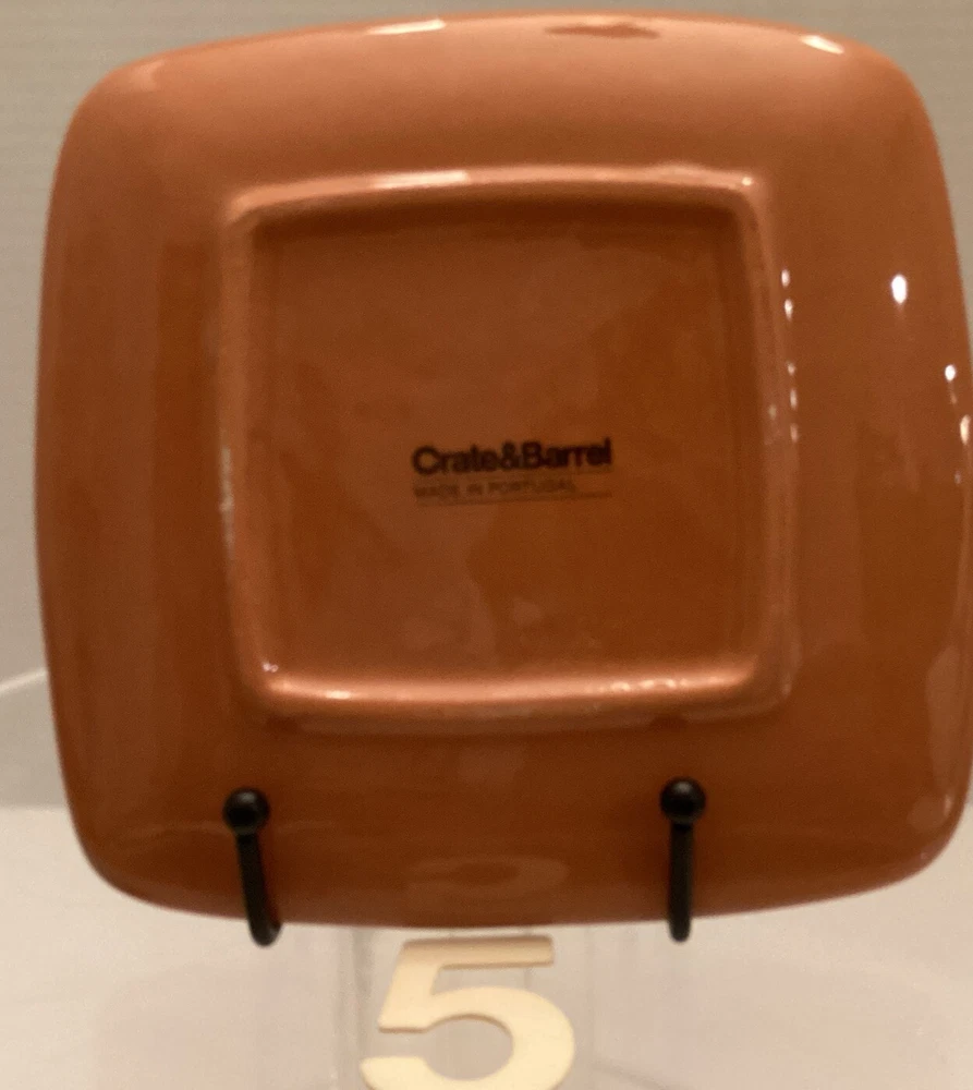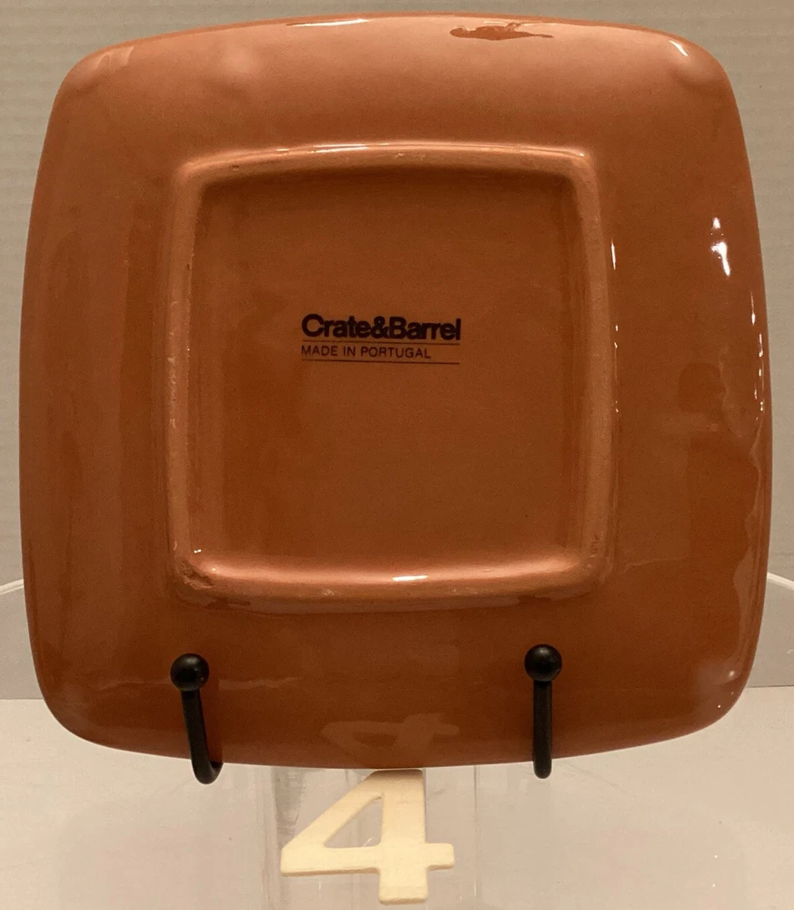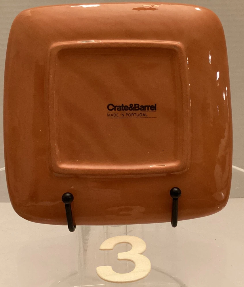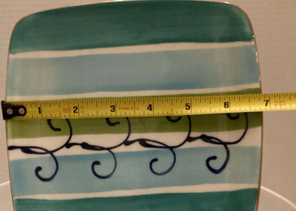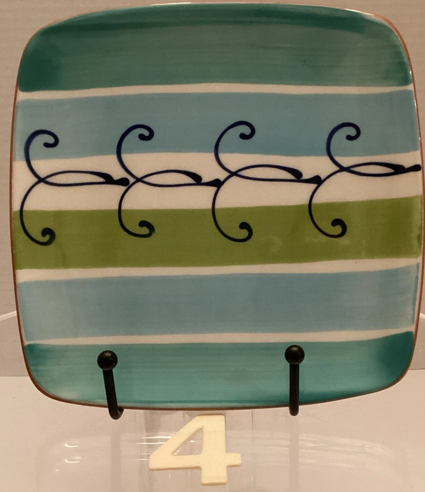 They are all in excellent condition, there are no chips, cracks, crazing, breaks or stains. We ship with TLC Fast shipping Enhance your dining experience with this set of five Crate and Barrel Lago Appetizer Plates. Each plate measures 6.75 inches and features a striking square shape with blue-green stripes. These plates are perfect for serving a variety of dishes, including bread and butter, appetizers, desserts, or salads, making them a versatile addition to any occasion. Crafted from high-quality stoneware, these plates are sure to impress your guests. The set includes five salad plates, each with a printed backstamp indicating their authenticity. Made in Portugal, these plates are a great addition to any kitchen.