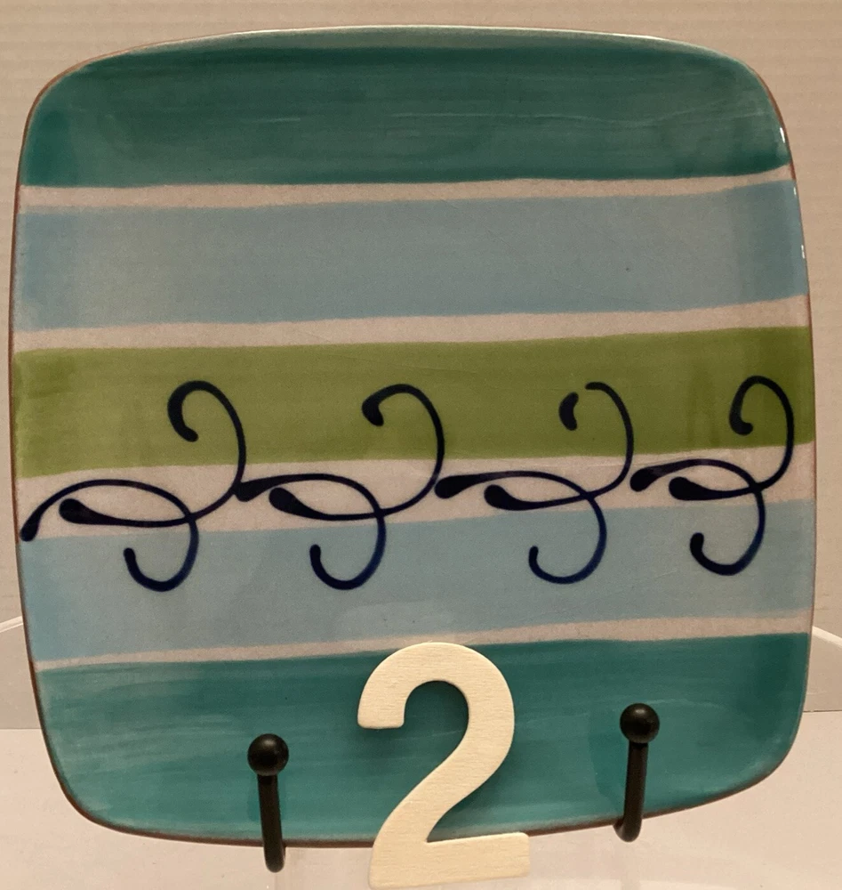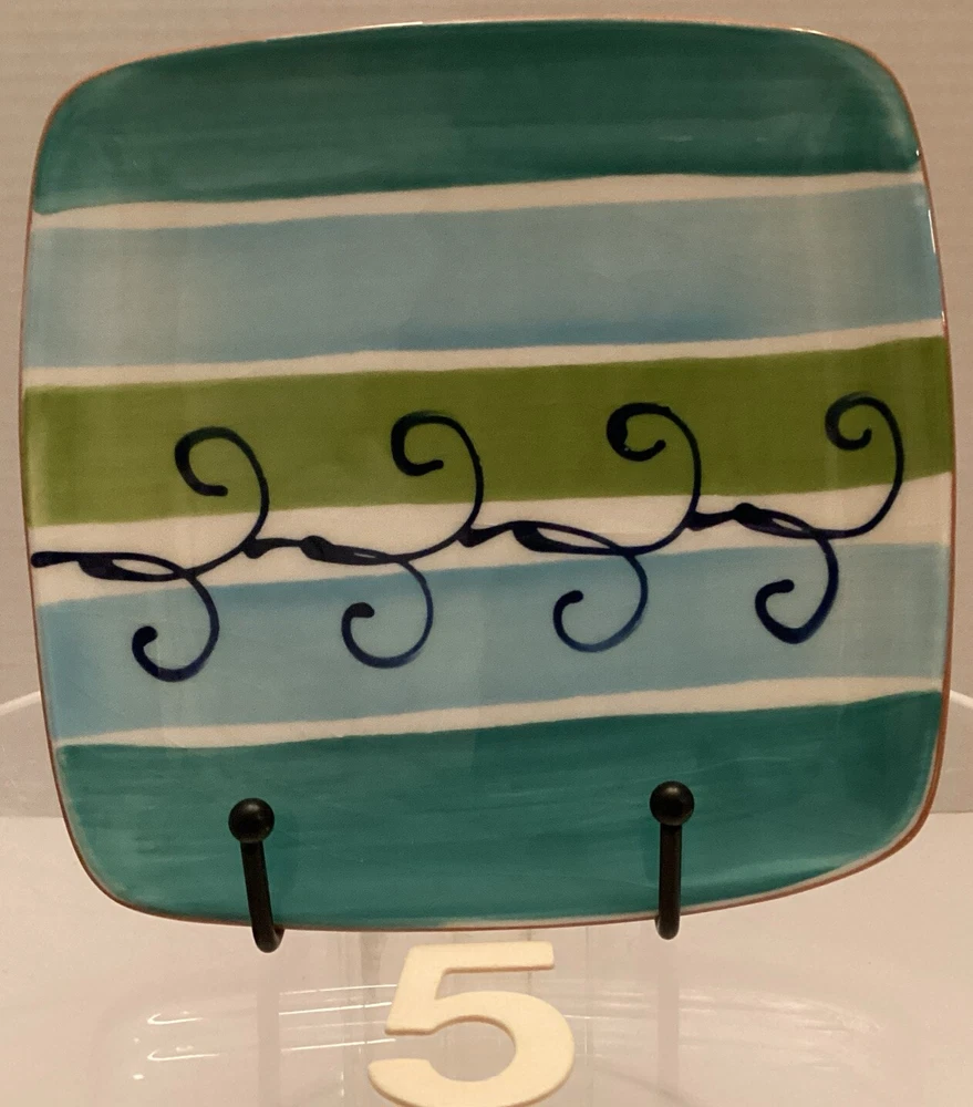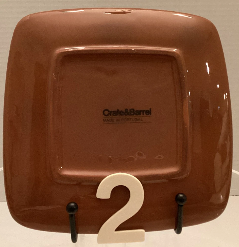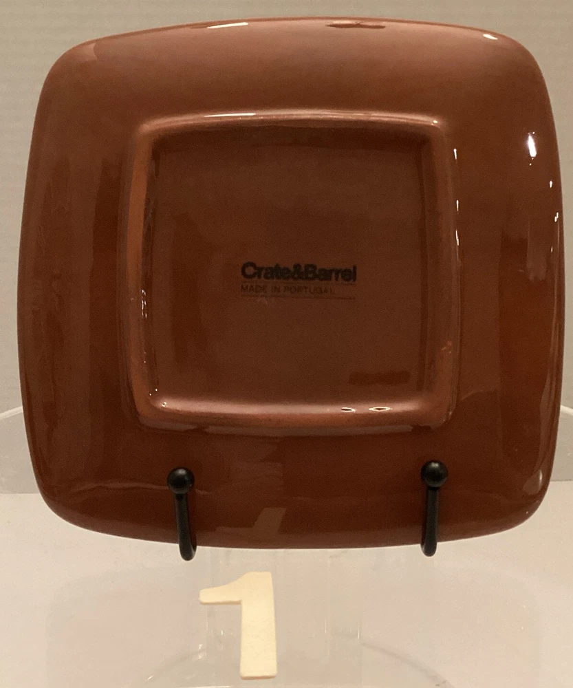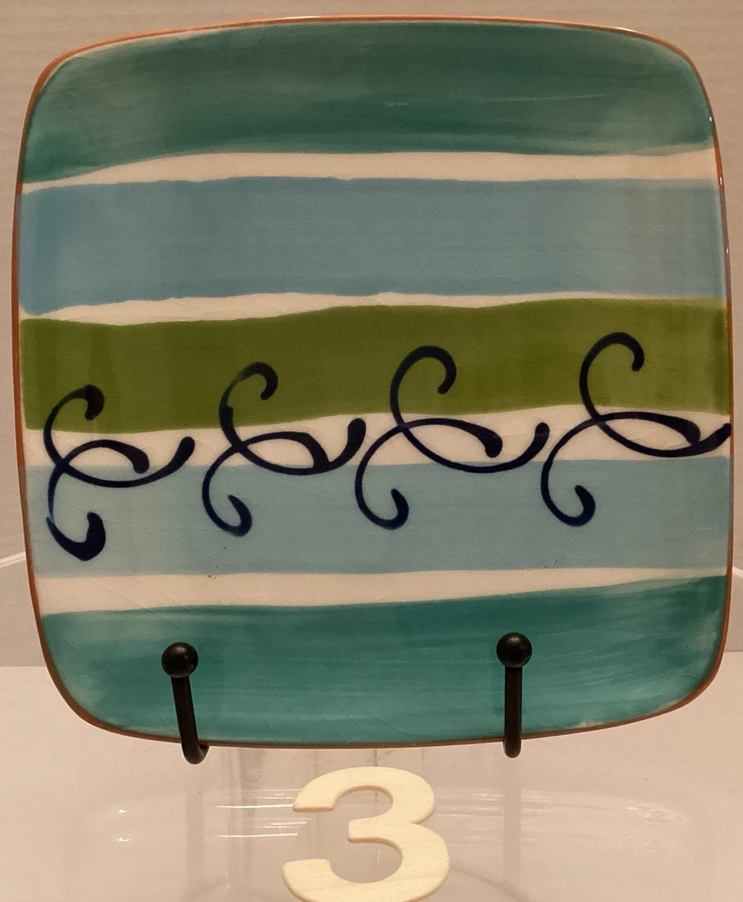 They are all in excellent condition, there are no chips, cracks, crazing, breaks or stains. We ship with TLC Fast shipping Enhance your dining experience with this set of five Crate and Barrel Lago Appetizer Plates. Each plate measures 6.75 inches and features a striking square shape with blue-green stripes. These plates are perfect for serving a variety of dishes, including bread and butter, appetizers, desserts, or salads, making them a versatile addition to any occasion. Crafted from high-quality stoneware, these plates are sure to impress your guests. The set includes five salad plates, each with a printed backstamp indicating their authenticity. Made in Portugal, these plates are a great addition to any kitchen.