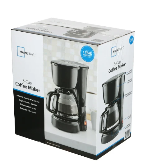 NOTE: WE don't send item to Stock address (address of other shipping company for send item to international buyer) and PO box address. All order use Stock address and PO box address will be cancel. Please don't make order. Thanks ! 5 Cup Auto keep Warm Function Coffee Maker With Removable Filter Basket, Black • This new Mainstays Black 5-Cup Drip Coffee Maker is the perfect selection to make a delicious cup of joe in the morning • Medium 5-cup capacity is ideal for everyday use or for entertaining friends and family • Expertly engineered carafe is specifically designed to accommodate high temperatures • Water level window allows you to see the fullness level with ease • Removable filter basket makes clean-up and regular maintenance easy • Simple power on/off button is easy to operate