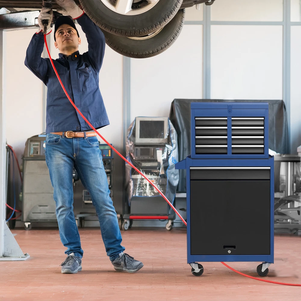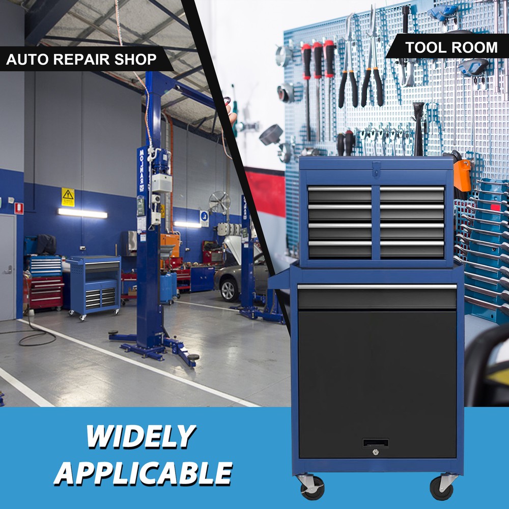 Product Features The mobile workshop trolley impresses with plenty of storage space and an attachable and mobile case attachment for your tools and workshop accessories that you always have to hand. The tool trolley is equipped with a total of 5 drawers and a large storage space with a tool box. The tool box is also lockable and can be used as a removable, attachable and mobile case attachment. The opening and closing of the drawers of the tool cabinet is very gentle thanks to the ball-bearing drawers. The storage surface provides additional space for storing and arranging tools you often need UNIVERSAL & LOCKABLE WHEELS. 4 universal wheels make it easy to move the rolling tool chest around. What's more, 2 of the wheels are lockable to ensure that the tool box stays in place.