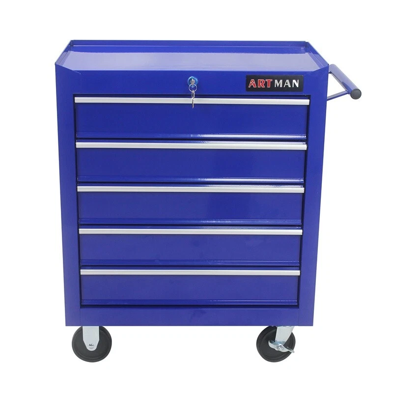 About this item : The ARTMAN tool trolley is equipped with a total of 5 drawers . The tool box is also lockable and can be used as a removable, attachable and mobile case attachment The opening and closing of the drawers of the tool cabinet is very gentle thanks to the ball-bearing drawers. The robust and powder-coated steel construction is used for high wear resistance. This assembly trolley has 4 steering wheels, 2 of which with parking brakes, so you can move the trolley freely in the garage, but also stop in one place Specification: Color: Blue Material: Cold Rolled Steel Surface Finish: Powder Coating Casters: 4" Casters (2PCS with brake and 2PCS without brake) Size :24.25*12.99*29.33 5 Drawers Dimension: 20.11*12*3.3 Weight (lbs.): 48.50