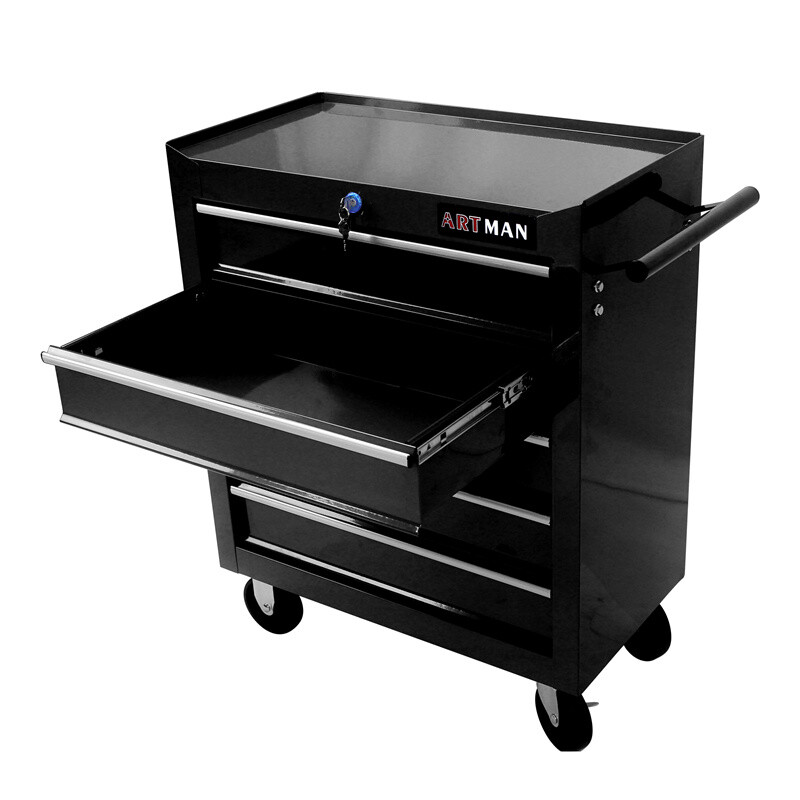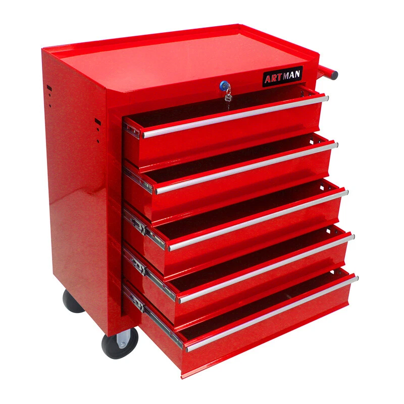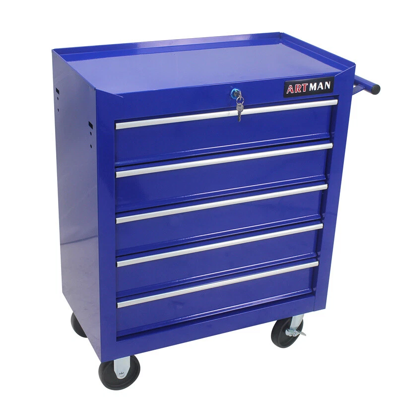 5 Drawers Rolling Tool Chest Tool Storage Cabinet Garage Cart Workshop w/ Wheels About this item : The ARTMAN tool trolley is equipped with a total of 5 drawers . The tool box is also lockable and can be used as a removable, attachable and mobile case attachment The opening and closing of the drawers of the tool cabinet is very gentle thanks to the ball-bearing drawers. The robust and powder-coated steel construction is used for high wear resistance. This assembly trolley has 4 steering wheels, 2 of which with parking brakes, so you can move the trolley freely in the garage, but also stop in one place Specification: Color: RED/BLACK/BLUE Metrial: Cold Rolled Steel Surface Finish: Powder Coating Casters: 4" Casters (2PCS with brake and 2PCS without brake) Size : L616mm(24.25inch)*W330mm(13inch)*H745mm(29.33inch) 5 drawers Dimension L511mm(20.11inch)*W305mm(12inch)*H85mm(3.3inch) Net Weight: 22KGS/48.5LBS