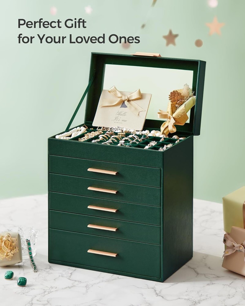 Product Description Jewelry Box with Glass Lid, 6-Layer Jewelry Organizer, 5 Drawers, for Sunglasses, Big Jewelry, Jewelry Storage, Modern Style, Forest Green and Gold Color UJBC171C01 [Storage, 6 Layers] Keep all your jewelry organized in this jewelry box—small pieces of jewelry go in the various slots of the top 5 layers, and sunglasses and watches go in the big bottom drawer [Clear Glass Lid] The see-through glass lid of this jewelry organizer allows you to see and find your favorite jewels at a glance while protecting them from dust, keeping your jewelry ready to wear and clean [Chic & Durable] Elegant green and gold colors, shiny metal handles, soft velvet lining, neat stitching, quality PU, and sturdy MDF—all these elements combined make this jewelry case stylish and durable enough for your ever-growing jewelry collection [Perfect Gift Idea] Gift this original design jewelry box to your loved ones for their birthday or anniversary to surprise them! Or, treat yourself to this fancy jewelry box—you deserve it! [Versatile Use] This modern jewelry holder looks nice whether displayed on the dresser of your bedroom or your cloakroom to organize your pins, necklaces, rings, bracelets, and other accessories About Us We are a reputable seller with many years of experience selling on eBay. Our goal is to provide high-quality products and excellent customer service. Shipping Items will be shipped within 1-3 business days when we received payment. (Orders are not processed on weekends & holidays) Tracking information will be sent once item is shipped. Delivery time depends on destination and other factors Item is shipped to ebay address. Leaving correct address can minimize delay. For international shipping and shipping to Guam, Hawaii and Alaska, Please contact us before placing the order. International buyers please note: Import duties, taxes and charges are not included in the item price or shipping charges. These charges are buyer’s responsibility. We will try our best to reduce the risk of the custom duties. Local pick-up is unavailable at the moment. Contact Us We reply any email messages within 1 business / working days(off-duty at weekend). If you do not get a response from us, then please check your junk or spam mailbox. Our Business hours: Mon-Fri 9:00-18:00, UTC/GMT +8 hours. Please contact us either by clicking "contact seller" in the "purchase history" section or simply click "ask a question" at the bottom of this page. If you are unsatisfied with our item or service, please contact us before leaving any feedback. We are committed to resolve all issues in a friendly and satisfactory manner.