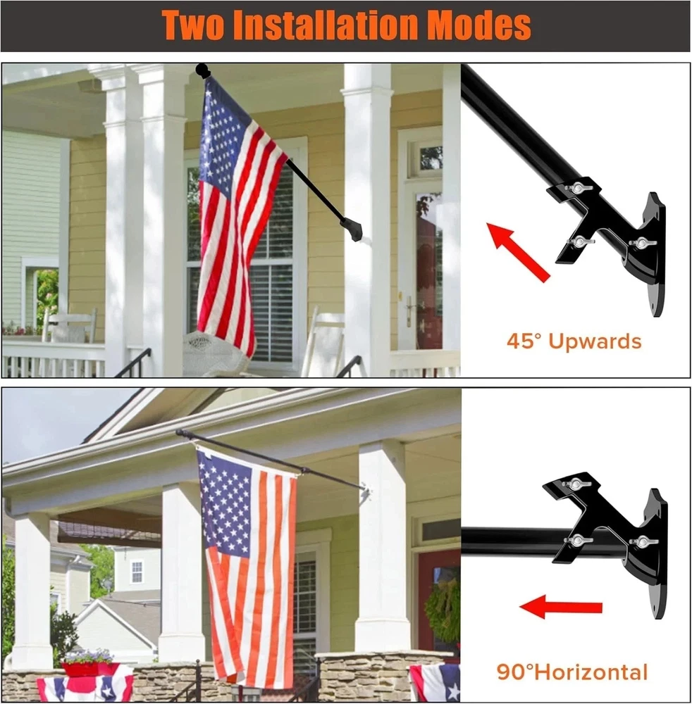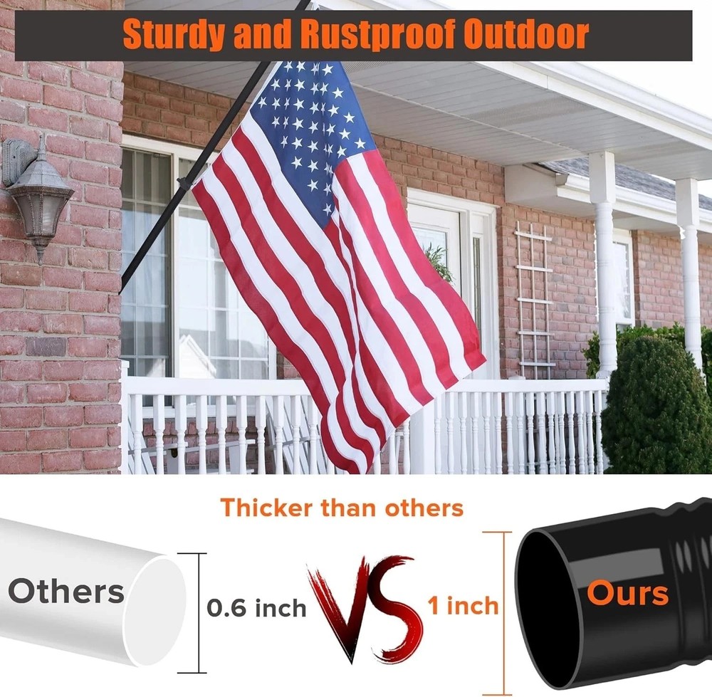 About this item: Tangle Free Design: With 360° free rotating anti-wrap rings for this spinning flag pole, allow your flags fly freely in the direction of the wind, makes it spinning without wrap around. Easy to Use , Fit Flags of Various Sizes: It is flag pole without bracket, please choose the flag pole with bracket if you want the bracket. The 5-section flag pole can be freely combined, and the length can be adjusted between 1.2 feet and 6 feet, the flag pole for house is equipped with two rotating flag mounting rings, the flag pole with adjustable length can be according to the size of your flag to install flag freely. this outdoor flag pole suitable for 2X3,3x5,4X6 flags. Rugged and Sturdy: 6 feet outdoor flag pole is made of high quality stainless steel, which is more sturdy and will not bend, break or warp. In case of breakage and bending, you can inform us immediately and we will deal with it for you in time. Widely Applications: 6Ft Flagpole kit is suitable for residential, commercial, as well as home, business, school, residential and other outside occasions, as wall mount flag pole, or as handheld flag pole for outdoor activities or sports competitions. The spinning flagpole with bracket can be installed on your house yard garden wall, porch, roofs, fences, wooden posts or truck, boat