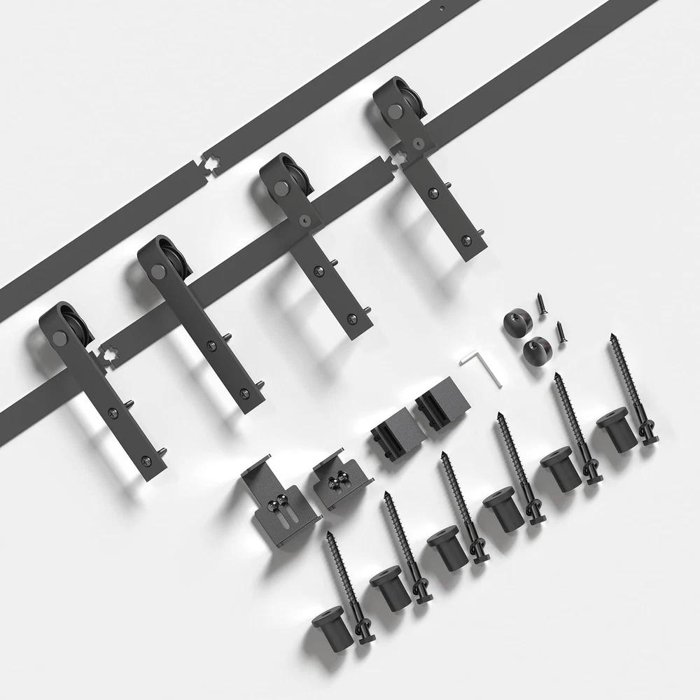 ใ€๐—›๐—ฒ๐—ฎ๐˜ƒ๐˜† ๐——๐˜‚๐˜๐˜† ๐—›๐—ฎ๐—ฟ๐—ฑ๐˜„๐—ฎ๐—ฟ๐—ฒใ€‘ pick up the best quality of the carbon steel and coating fine black powder to make it years of beauty and longevity.Also,we selected premium nylon to make the roller slide smoothly and quietly,tested beyond 100,000 rolls. ใ€๐—˜๐—ฎ๐˜€๐˜† ๐—œ๐—ป๐˜€๐˜๐—ฎ๐—น๐—นใ€‘ We provide step-by-step installation manual in fractions according to US measurement standards,you can also get soft online copy and professional installation guide from our online service.You are going to have a pleasant experience of installing. ใ€๐— ๐—ถ๐—ป๐—ถ ๐—•๐˜†๐—ฝ๐—ฎ๐˜€๐˜€ ๐—›๐—ฎ๐—ฟ๐—ฑ๐˜„๐—ฎ๐—ฟ๐—ฒ ๐—”๐—ฝ๐—ฝ๐—น๐˜† ๐—ง๐—ผ ๐—ฉ๐—ฎ๐—ฟ๐—ถ๐—ฒ๐˜๐˜† ๐—ผ๐—ณ ๐—ฆ๐—ฐ๐—ฒ๐—ป๐—ฒใ€‘ The 7inch height roller allows to fit almost anywhere you want to install a small barn door hardware system,such as TV stand,vanity,cabinet,pet's kennel,bookshelf closet,window and so on! ใ€๐—ฅ๐—ฒ๐—บ๐—ถ๐—ป๐—ฑ๐˜€ใ€‘ Fit Door Thickness: 11/16" ~ 1-1/8",Door Weight Capacity 120lbs. Package Includes: 60โ€ณRail (5 sections of rail splicing),4x Roller,6x Spacer,2x Door Stopper,2x Door Guide.CABINET NOT INCLUDED ใ€๐—ง๐—ผ๐—ฝ ๐—Ÿ๐—ฒ๐˜ƒ๐—ฒ๐—น ๐—”๐—ณ๐˜๐—ฒ๐—ฟ-๐—ฆ๐—ฒ๐—น๐—น๐—ถ๐—ป๐—ด ๐—ฆ๐—ฒ๐—ฟ๐˜ƒ๐—ถ๐—ฐ๐—ฒใ€‘ specialize in sliding door and hardware many years,if there anything missed or broken,pls let us know,we are whole day online to solve your problem.