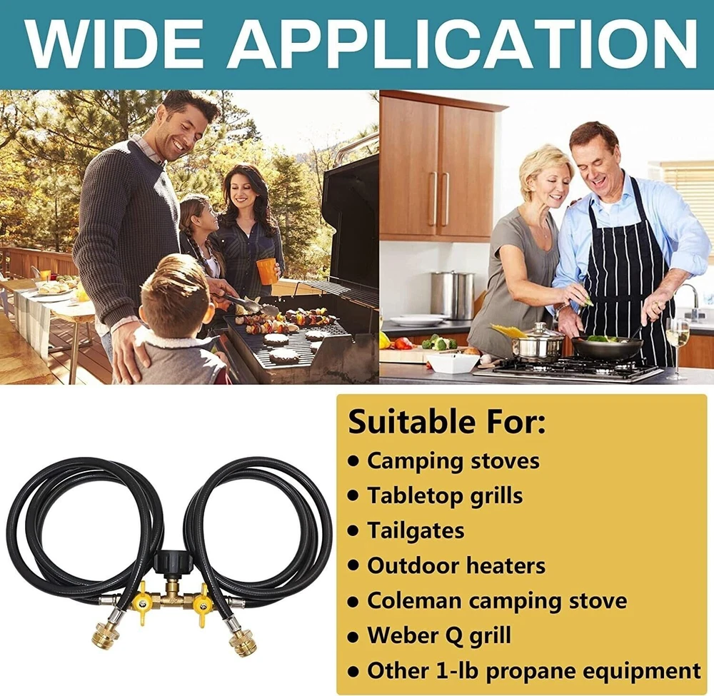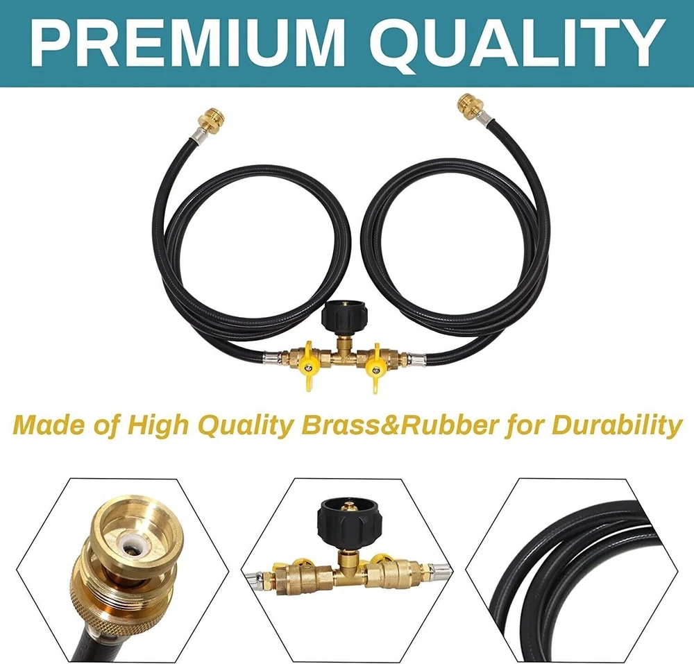 Feature 【BETTER COMPATIBILITY】 Specially designed to gain better compatibility and to enable easier connection, 5FT braided propane hoses with propane adapter 1lb to 20lb are ideal for 1lb propane camp stoves, tabletop/portable grills, Weber Q grills, Blackstone desktop grills, Buddy heater, Coleman portable grills. A good solution to connect 1lb portable appliances to 20lb tanks. Pls make sure your 1lb propane appliance can be connected to CGA600 connector before your purchase; 【ADVANCED HOSE CONSTRUCTION】 Hose, its 3-layer hoses of flame-retardant PVC , enhancing the propane hose adapter’s resistance to wear, tear, weather . Combining advantages of 3 different materials (flame-retardant PVC, stainless steel and high-tensile cotton), the braided propane hose with propane tank adapter is stronger and boasts better flexibility, sturdiness and durability; 【CONSISTENT GAS FLOW & CONVENIENT DESIGN】 With an elaborate inner propane tank hose structure & a maximum working pressure of 350 PSI, PatioGem 5ft braided propane hoses guarantee a consistent & smooth gas flow to grill mouth-watering roast meat. Moreover, the lp gas hose is 5-feet long, a convenient length to connect your 1lb lp appliances to 5-40lb propane tanks at any desired distance;Two hoses with independent switch. Two devices can be made to work simultaneously or individually. 【EASY INSTALLATION & MONEY SAVER】 Acting as a perfect propane adapter 1lb to 20lb, the propane hose extension can connect your lp appliances to 5-40lb propane tanks in a blink, saving your money on 1lb propane tanks; 【We Not Only Provide Propane Hoses】 All propane hoses are under 1-Year Warranty. As we value every customer’s voice and experience with our products as well as with our service, we provide 24hrs/7days non-stop customer support to you. Pls feel free to contact us whenever you are concerned about the product or after-sales service. 100% Brass Connectors For 1lb LP Appliances,all PatioGem propane hoses' fittings are constructed from high-quality brass,ensuring a satisfying service life. Two independent switch Efficiency and convenient experience,two devices can be made to work simultaneously or individually. Standardized Fittings Accurately designed & tested, this 5-feet propane hose can seamlessly connect most 1lb portable lp appliances to 5-20lb propane tanks. Durable Hose Structure Hose adopts strength 5 times materials;strength of rubber braid, the flexibility of high-tensile cotton and the sturdiness of flame-retardant PVC.