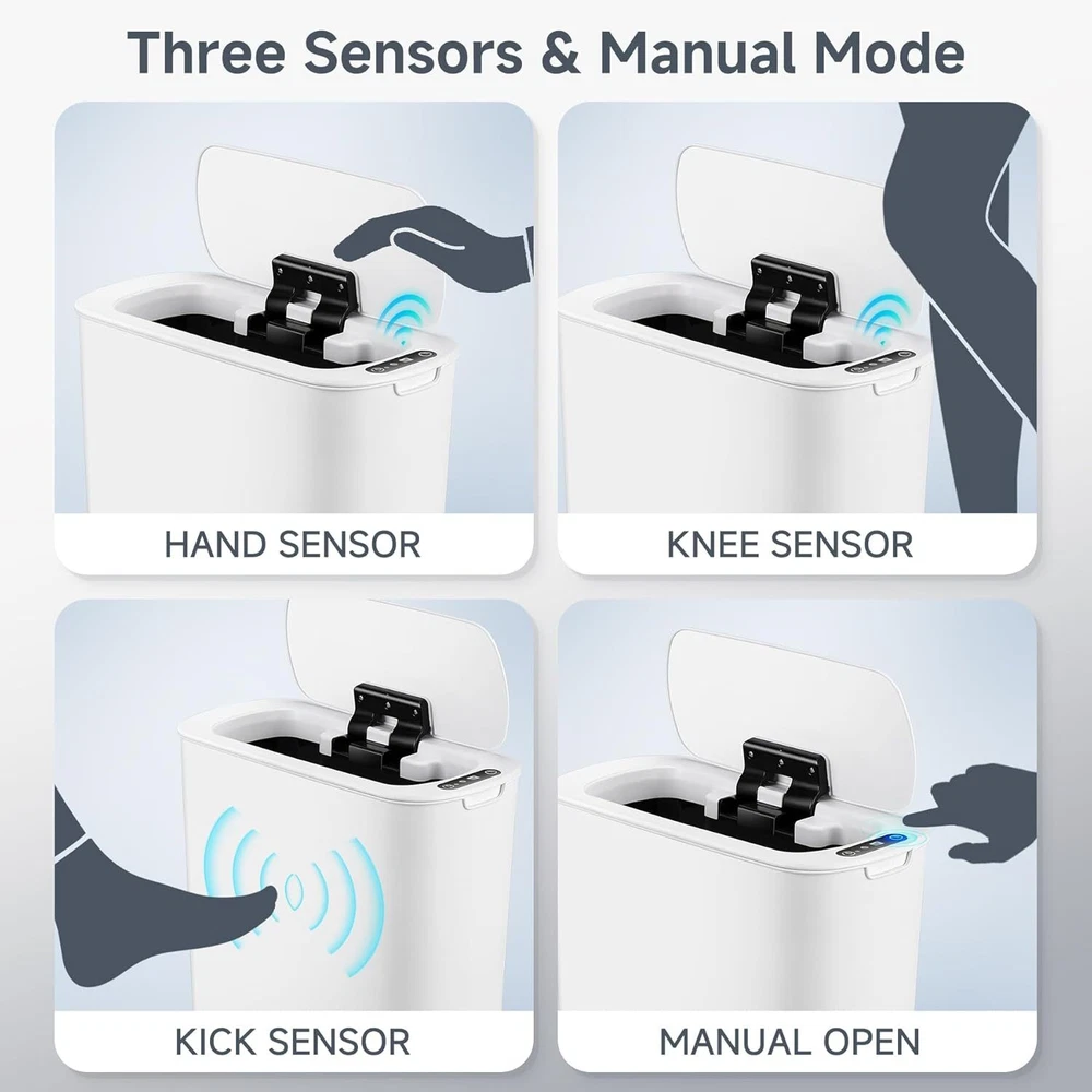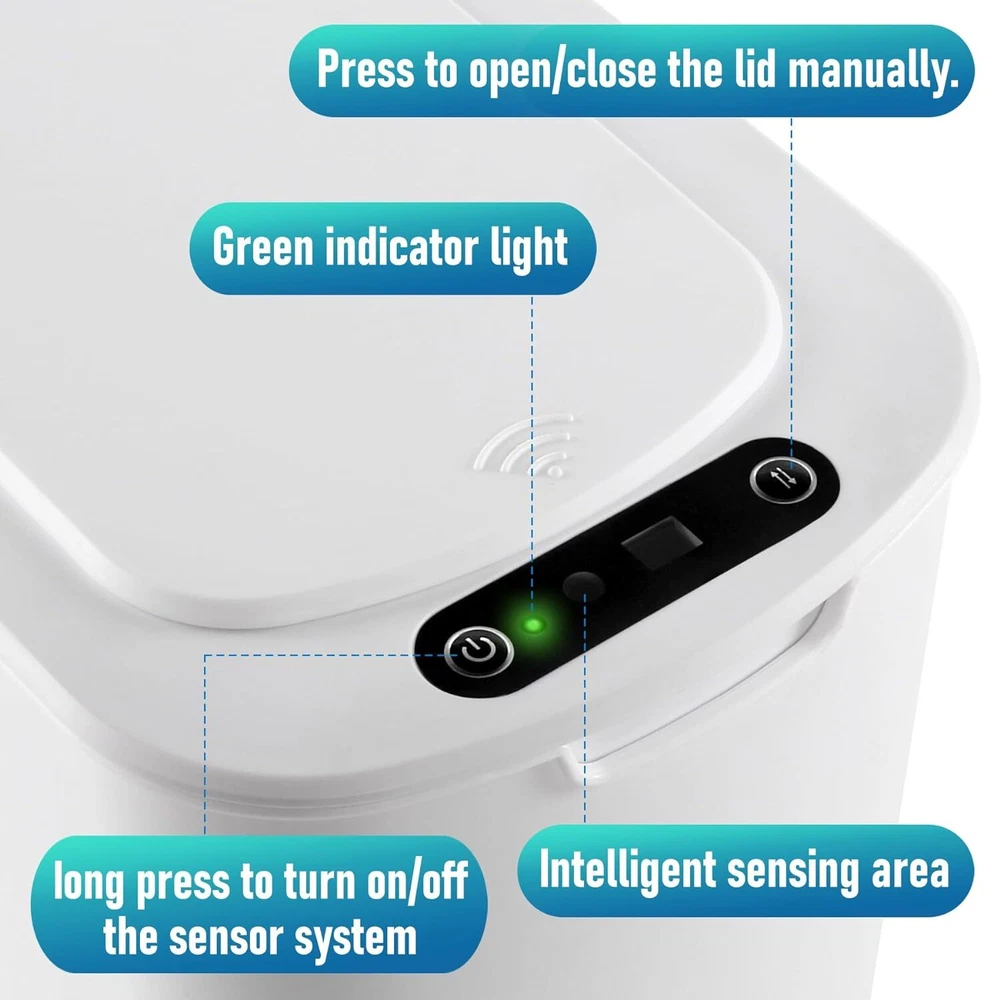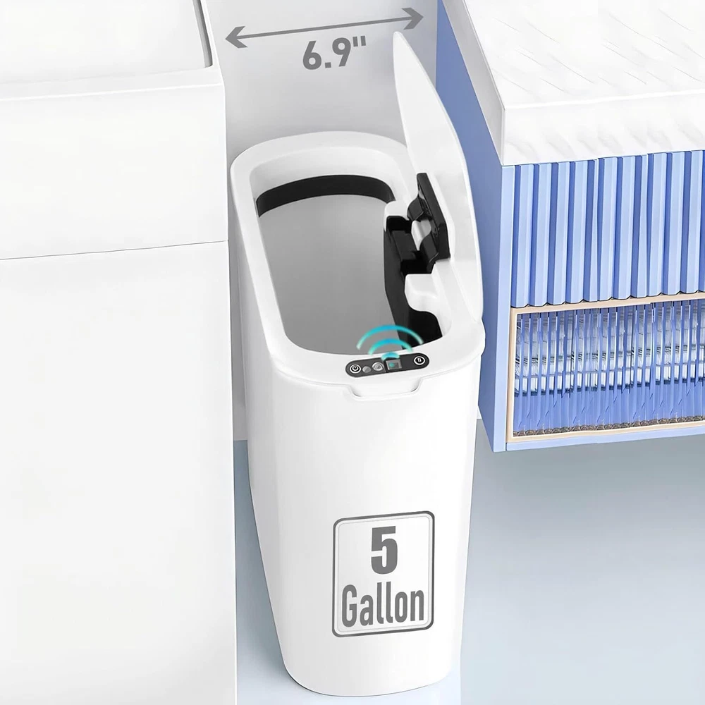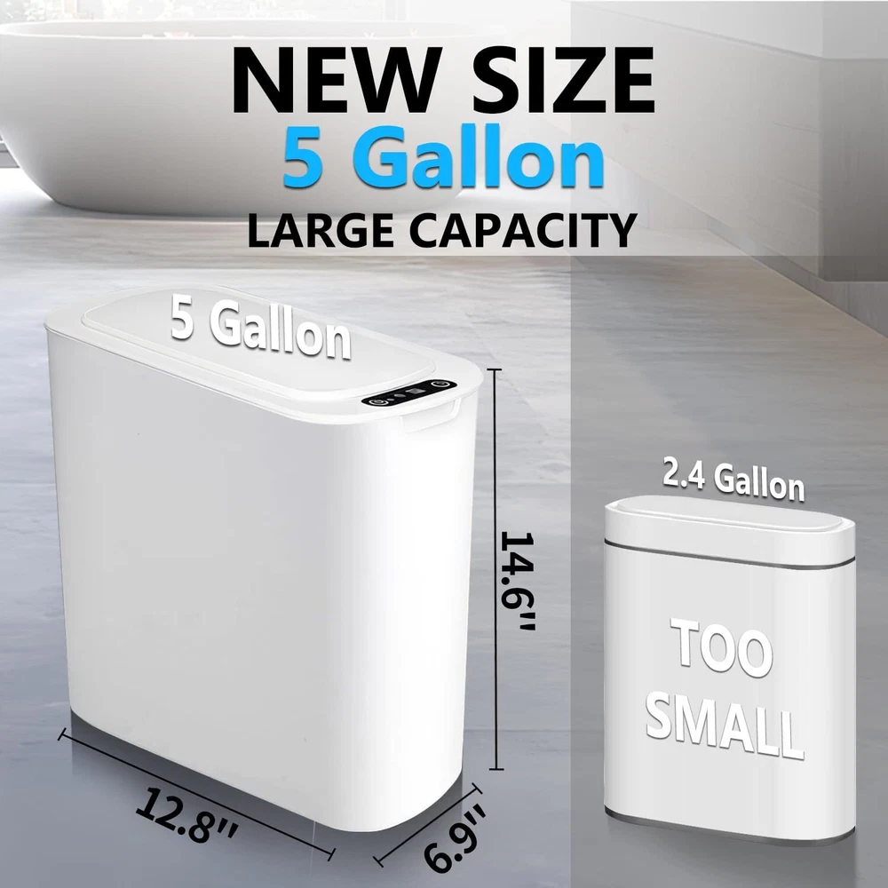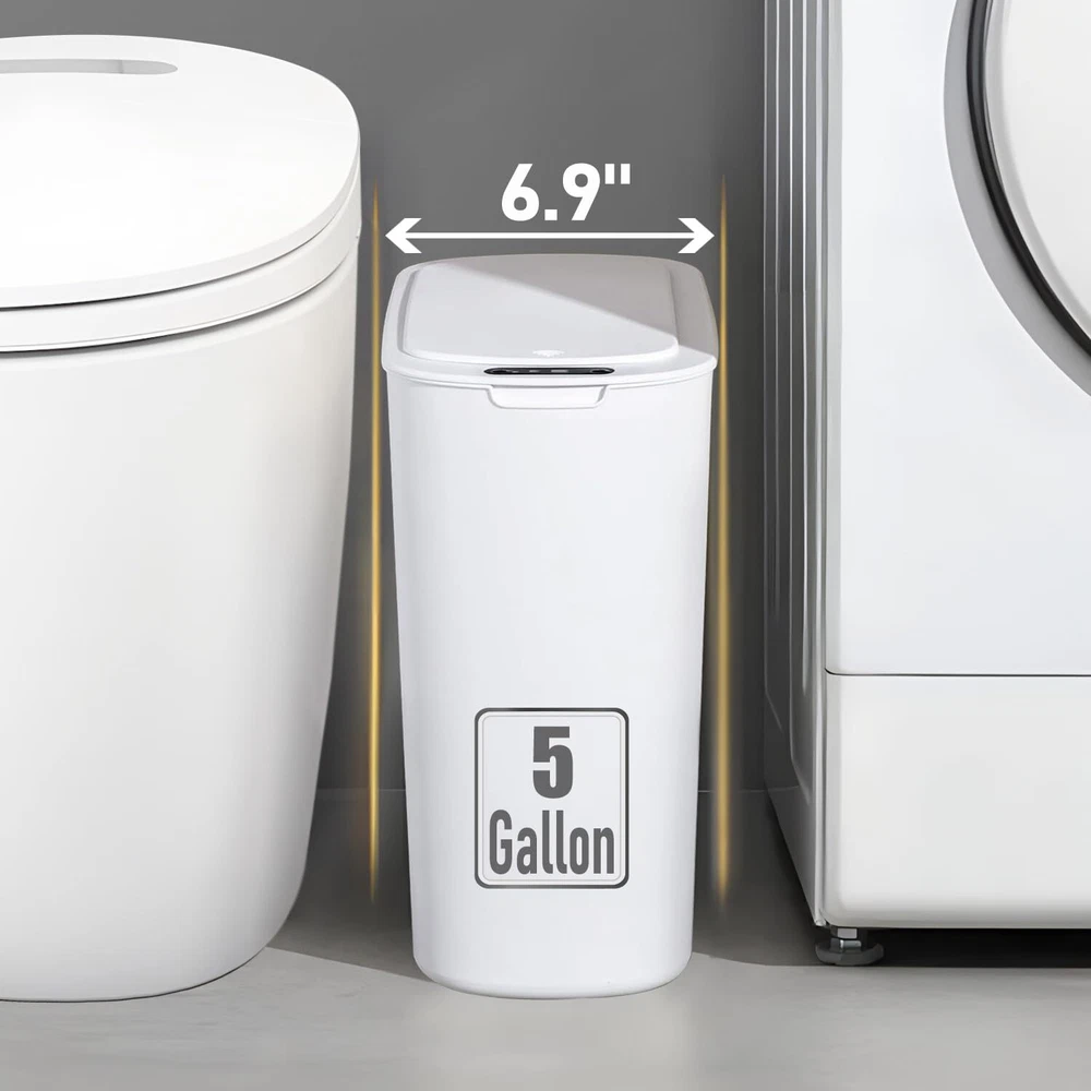 5 Gallon Motion Senor Bathroom Trash Can with Lid, Automatic Garbage White Product Details Product Dimensions : 12.8 x 6.9 x 14.6 inches; 2.93 Pounds Item model number : MSTC-5gal Manufacturer : TIPGO Brand: TIPGO Capacity: 5 Gallons Color: White Opening Mechanism: Motion-Sensor Material: Plastic Recommended Uses For Product: Bathroom Room Type: Bathroom, Bedroom, Living Room, Home Office Special Feature: Removable Lid, Motion Sensor, Odor Seal Shape: Round Finish Type: Polished 【Touchless Convenience】Simply place your hand above the infrared motion sensor, the lid will stay open, and will automatically close if no object movement is detected within 5 seconds. Requires 2 AA batteries (not included) 【Slim Design & Large Capacity】Genius space saving functionality, this 5-gallon slim can come with perfect size designed to fit in any small spots 【Odor Sealing Ability】The well-fitting lid creates a sealed enclosure that effectively isolates odors from garbage, maintaining a fresh and pleasant indoor environment 【Removable Bag Fix Ring】The Removable inner fix ring help hold garbage bag in place and prevents bag from overhanging the trash can, maintaining a neat appearance, and easy to put in and take out 【TIPGO Support】Contact us with a few details and we'll offer the best solution