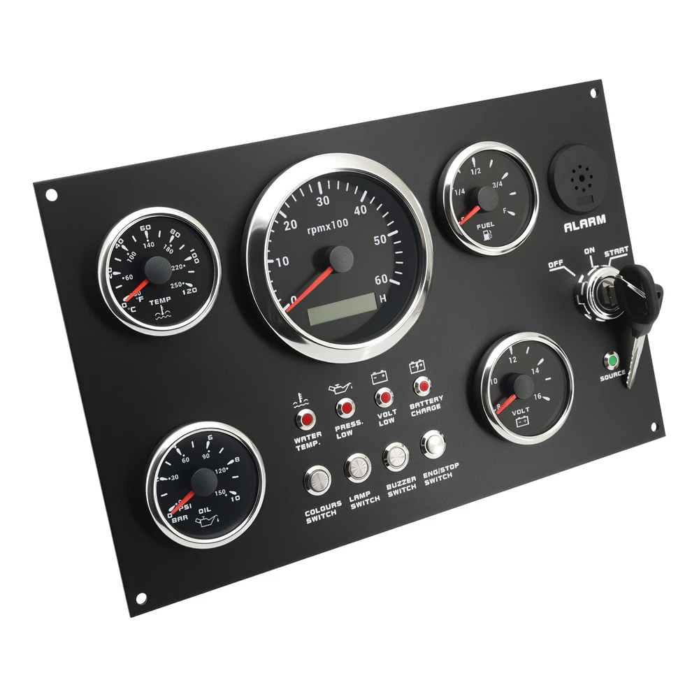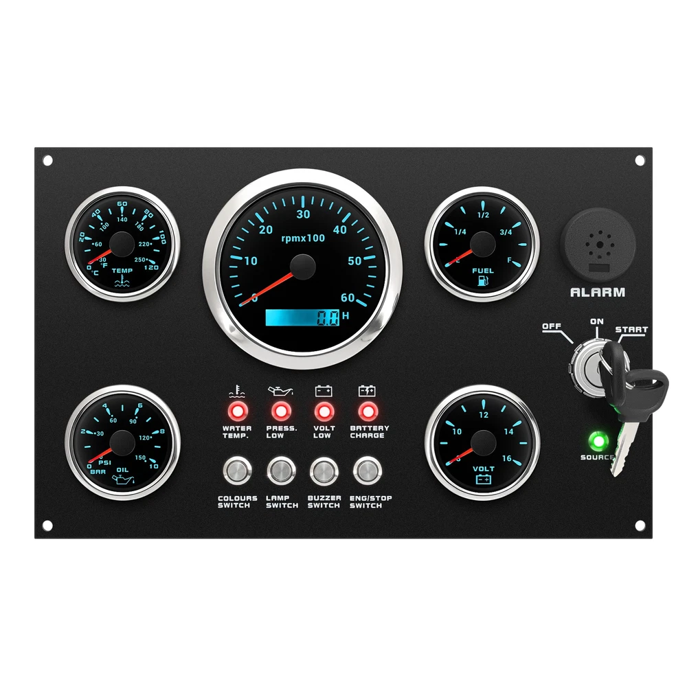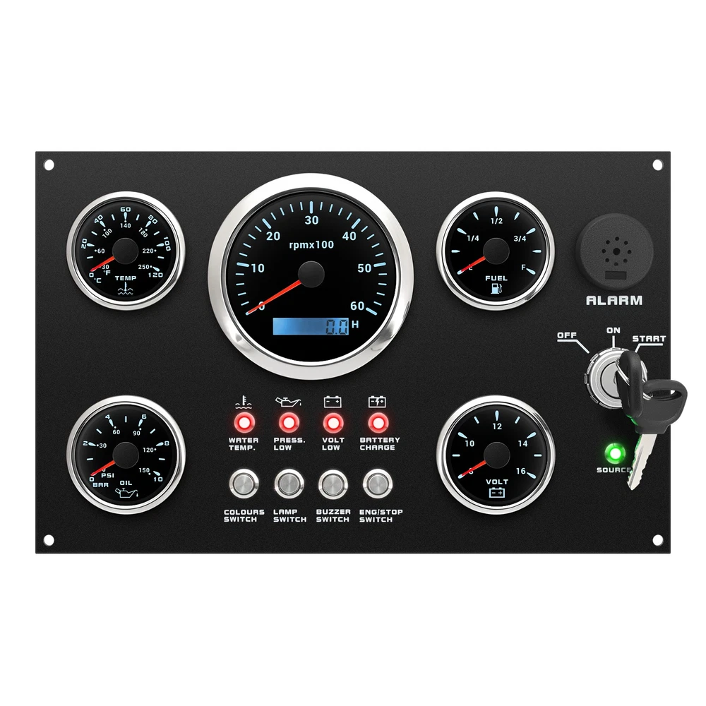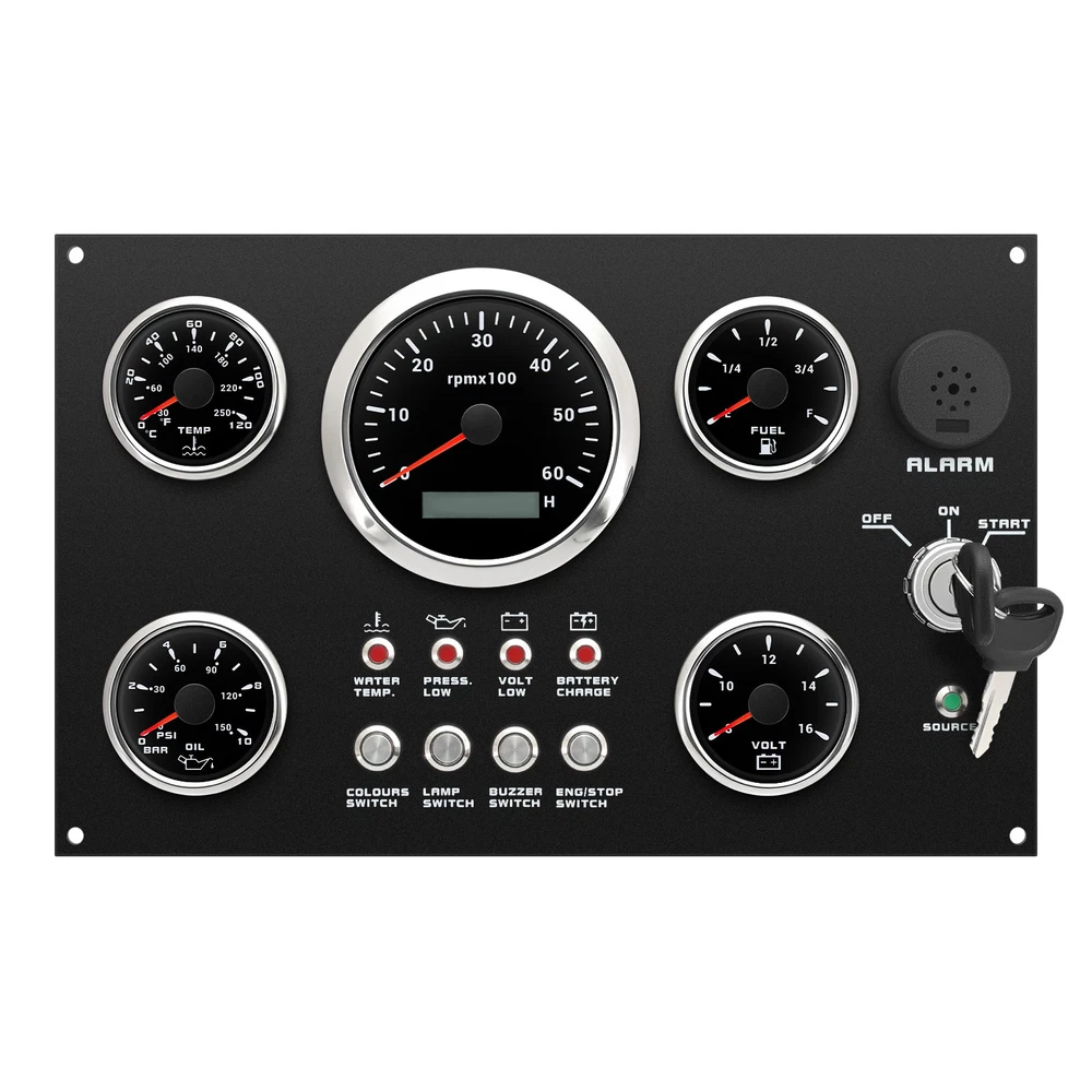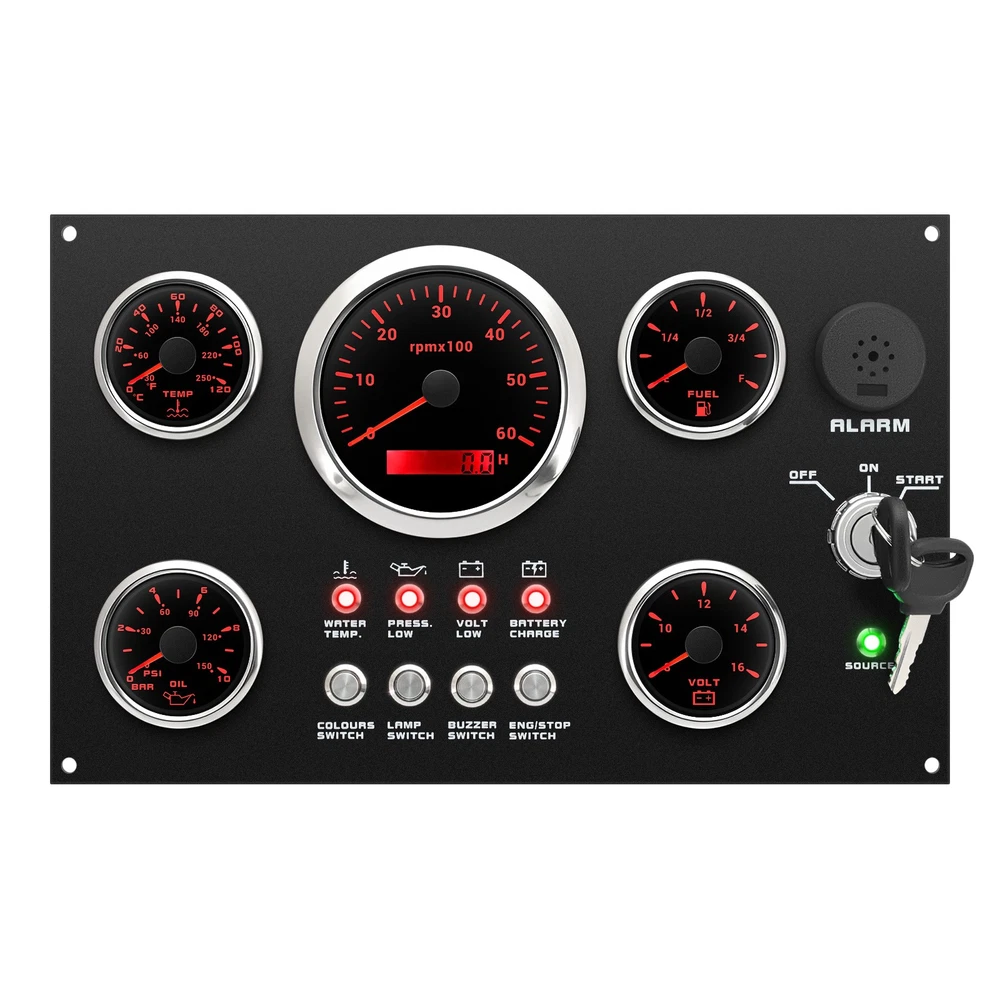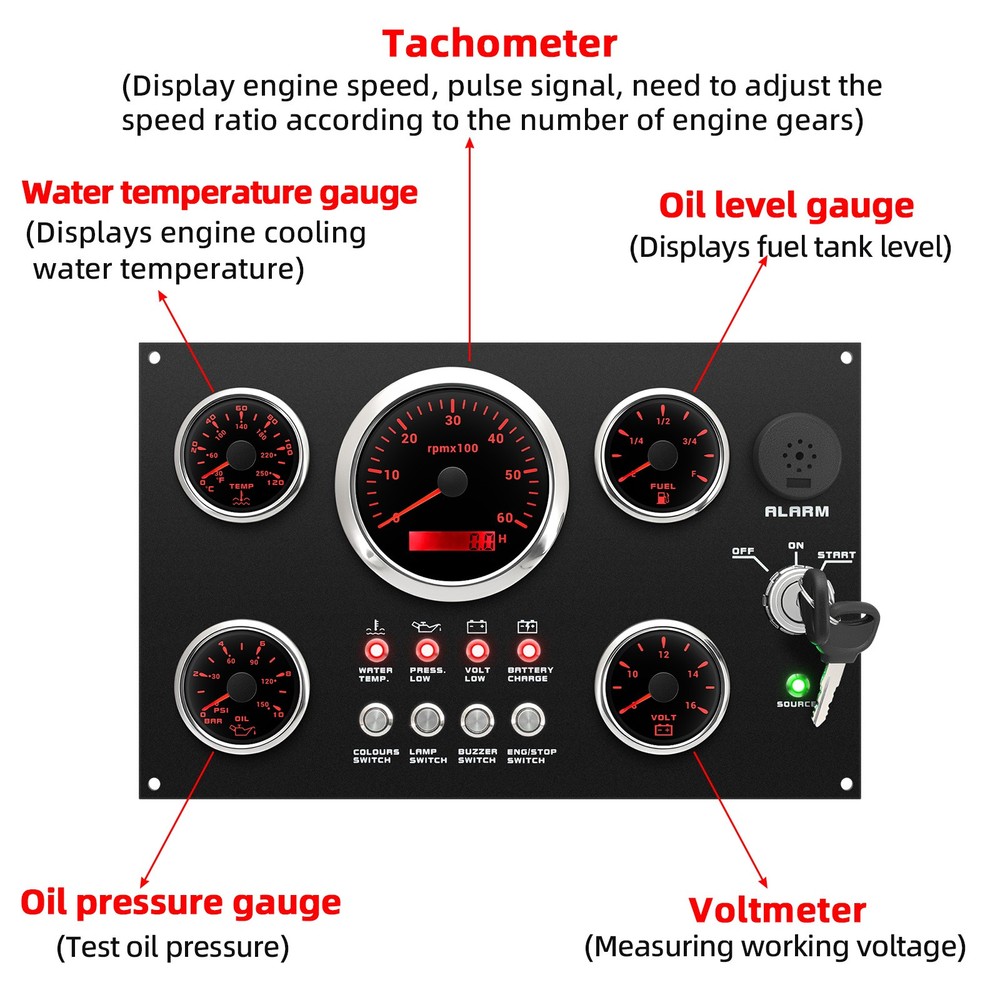 5 Gauge Set with Instrument Panel 0-6000 RPM Tachometer For Marine Boat Yacht 5 Gauge Set with Instrument Panel 0-6000 RPM 7Colors LED For Marine Boat Yacht Feature: Analog Display Tachometer & Digital Display Hour Meter. Clear Lens, 316 Stainless Steel Bezel with ABS Plastic Housing. Black Faceplate, Red Needle with 7 colors LED Illumination. With IP67 Waterproof, Rustproof, Anti-Fog & UV-Resistant. Hour Meter Records to 99999.9 Hours & Automatic Roll Over Resolution 0.1 Hour. Volt Gauge, Fuel Level Gauge, Water Temperature Gauge & Oil Pressure Gauge with Warning Function. Gauge Set (Except Volt Gauge) Requires 12 / 24 Volt Negative Ground Systems. Volt Gauge Requires 12 Volt Negative Ground Systems. One Year Limited Warranty for Non-Human Factor Damage & Free Lifetime Technical Support. Tachometer Install Diameter: Φ85mm or 3-3/8" Engine hours: 0.0-99999.9H Backlight :7 Color backlight Indicating Range: 0~6000RPM Signal: Pulse For Tachometer, you can substitute for different unit, please contact us before / after purchase or note on the order. Tachometer: 0-4000rpm/0-3000RPM/7000RPM/8000RPM Fuel Level Gauge Sizes: 52 mm (2-1/16") Measuring Range: Empty - Full Resistance: 240 (E) - 33 (F) ohms Backlight: 7 Colors Water Temperature Gauge Install diameter: Φ52mm Indication range: 0~120℃/30-250℉ Input signal: 287.4~22.4 ohms Storage temperature: -40~+85℃ Backlight: 7 Colors Oil Pressure Gauge Install diameter:Φ52mm or 2-1/16" Indication range:0~10bar / 0-150 PSI Operating temperature:-30~+75℃ Storage temperature:-40~+85℃ Backlight: 7 Colors Volt Gauge Sizes: 52 mm (2-1/16") Measuring Range: 8 - 16 (V) Backlight: 7 Colors PACKAGED 1x Tachometer 1x Water Temperature Gauge 1x Oil Pressure Gauge 1x Fuel Level Gauge 1x Voltmeter 1x Fuel level sensor 1x Tacho sensor 1x 1/8NPT Water temp sensor 1x 1/8NPT Oil pressure sensor 5x Wire Harness 1x Instrument Panel 1xInstallation Manual