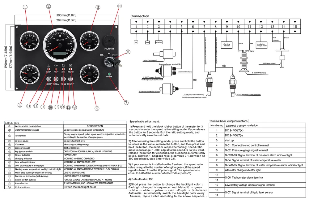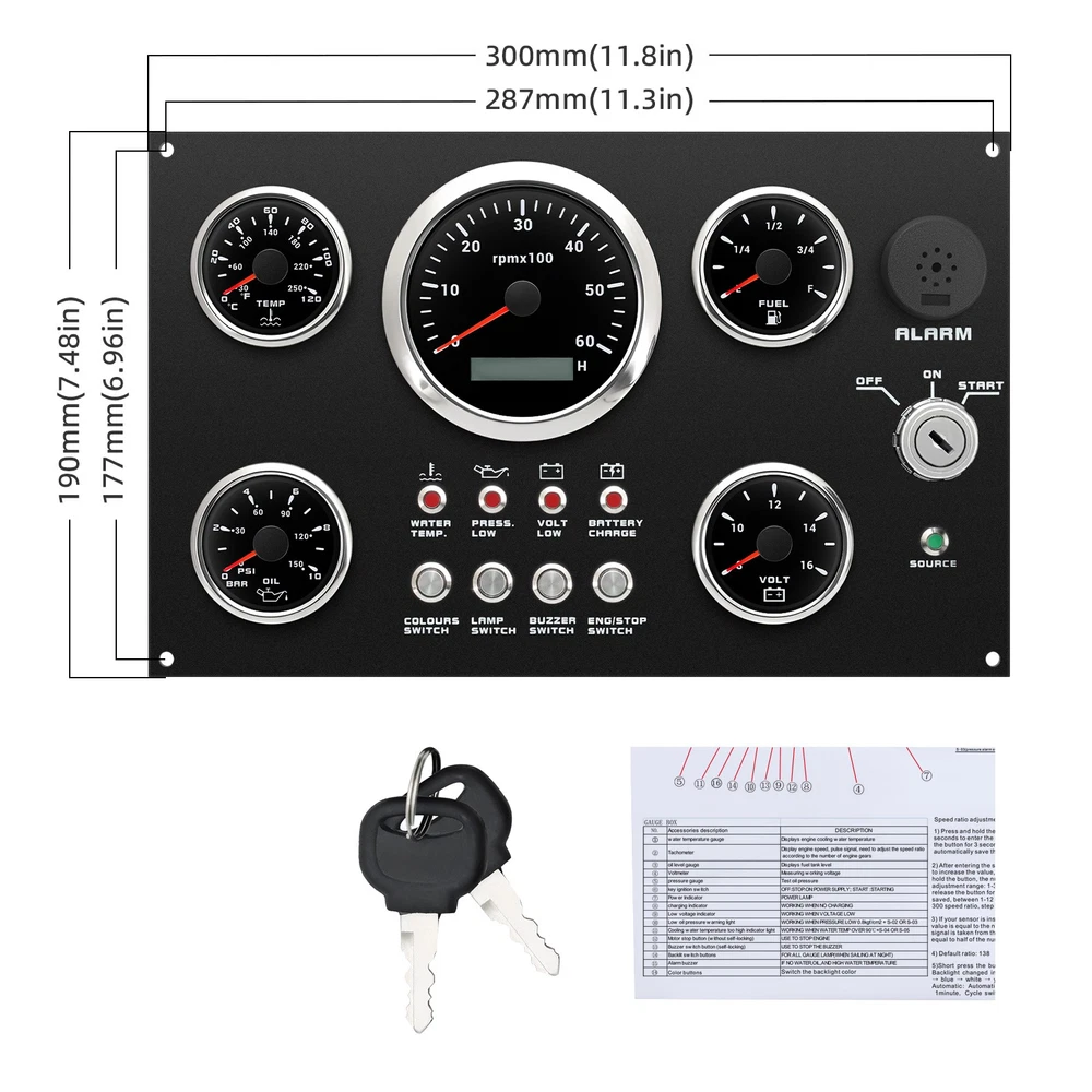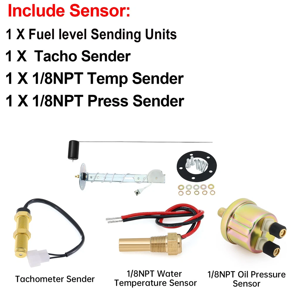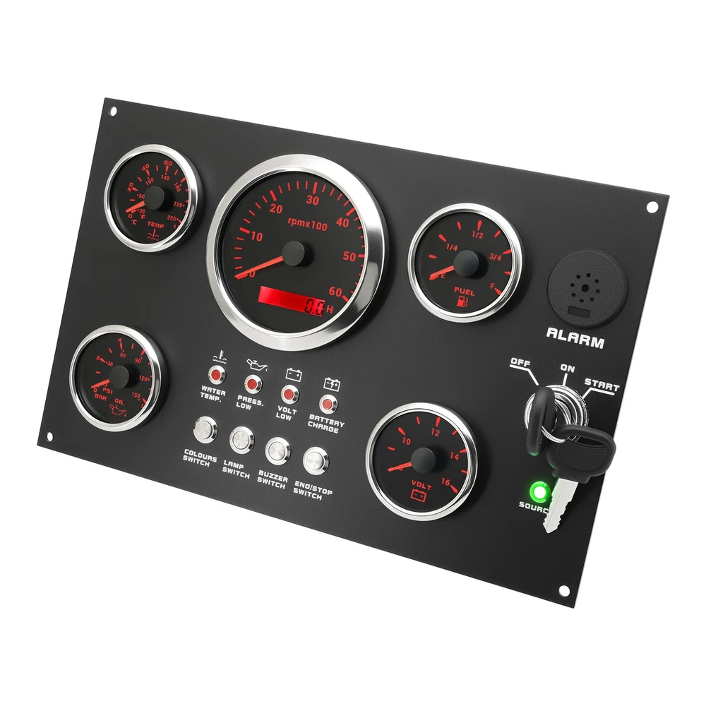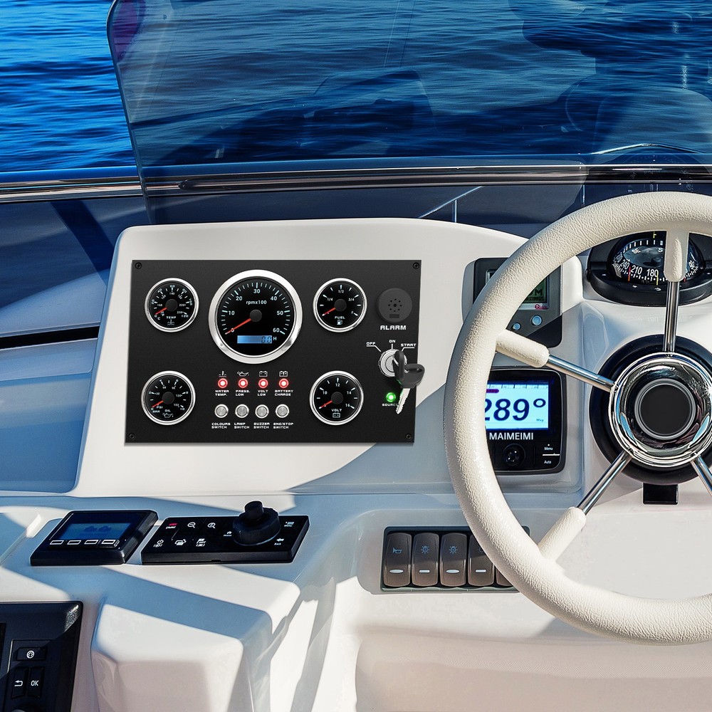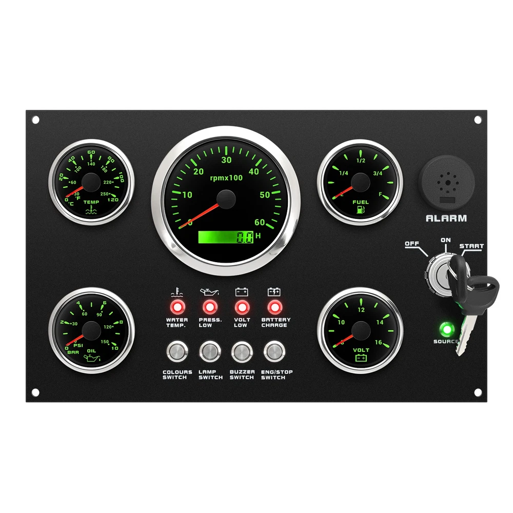 5 Gauge Set with Instrument Panel 0-6000 RPM Tachometer For Marine Boat Yacht 5 Gauge Set with Instrument Panel 0-6000 RPM 7Colors LED For Marine Boat Yacht Feature: Analog Display Tachometer & Digital Display Hour Meter. Clear Lens, 316 Stainless Steel Bezel with ABS Plastic Housing. Black Faceplate, Red Needle with 7 colors LED Illumination. With IP67 Waterproof, Rustproof, Anti-Fog & UV-Resistant. Hour Meter Records to 99999.9 Hours & Automatic Roll Over Resolution 0.1 Hour. Volt Gauge, Fuel Level Gauge, Water Temperature Gauge & Oil Pressure Gauge with Warning Function. Gauge Set (Except Volt Gauge) Requires 12 / 24 Volt Negative Ground Systems. Volt Gauge Requires 12 Volt Negative Ground Systems. One Year Limited Warranty for Non-Human Factor Damage & Free Lifetime Technical Support. Tachometer Install Diameter: Φ85mm or 3-3/8" Engine hours: 0.0-99999.9H Backlight :7 Color backlight Indicating Range: 0~6000RPM Signal: Pulse For Tachometer, you can substitute for different unit, please contact us before / after purchase or note on the order. Tachometer: 0-4000rpm/0-3000RPM/7000RPM/8000RPM Fuel Level Gauge Sizes: 52 mm (2-1/16") Measuring Range: Empty - Full Resistance: 240 (E) - 33 (F) ohms Backlight: 7 Colors Water Temperature Gauge Install diameter: Φ52mm Indication range: 0~120℃/30-250℉ Input signal: 287.4~22.4 ohms Storage temperature: -40~+85℃ Backlight: 7 Colors Oil Pressure Gauge Install diameter:Φ52mm or 2-1/16" Indication range:0~10bar / 0-150 PSI Operating temperature:-30~+75℃ Storage temperature:-40~+85℃ Backlight: 7 Colors Volt Gauge Sizes: 52 mm (2-1/16") Measuring Range: 8 - 16 (V) Backlight: 7 Colors PACKAGED 1x Tachometer 1x Water Temperature Gauge 1x Oil Pressure Gauge 1x Fuel Level Gauge 1x Voltmeter 1x Fuel level sensor 1x Tacho sensor 1x 1/8NPT Water temp sensor 1x 1/8NPT Oil pressure sensor 5x Wire Harness 1x Instrument Panel 1xInstallation Manual