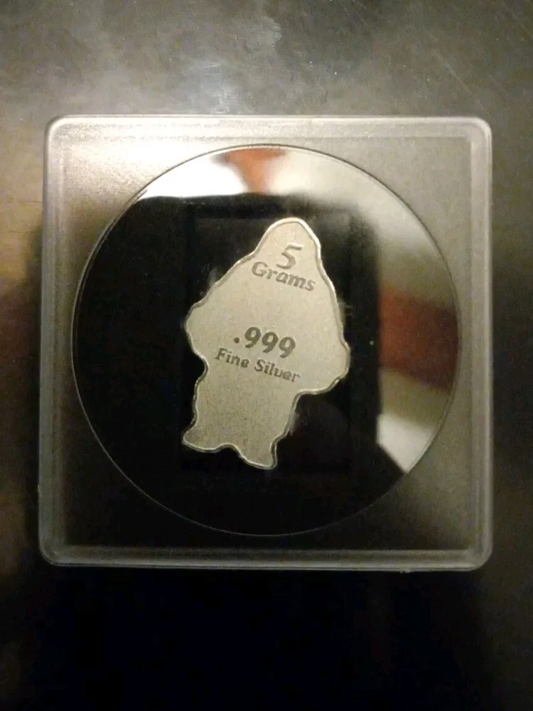 The product is a 5 gram silver round with a fineness of 0.999, featuring a design known as "Bad Santa" and minted by Pan Silver Company. The round does not come with a box. The silver content per unit is 5 grams, making it a small but valuable addition to any precious metals collection. The round's design, composition, and high level of fineness make it a sought-after piece for both collectors and investors looking to add unique silver pieces to their portfolios.