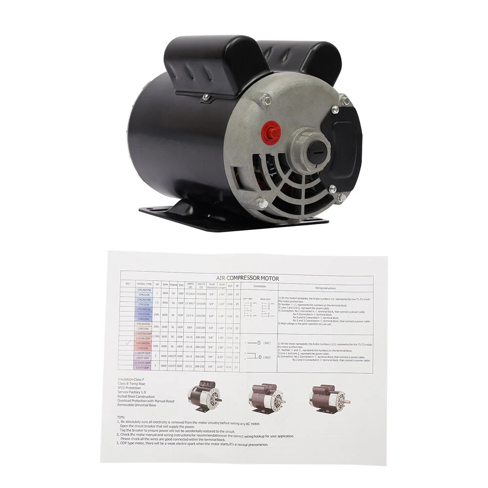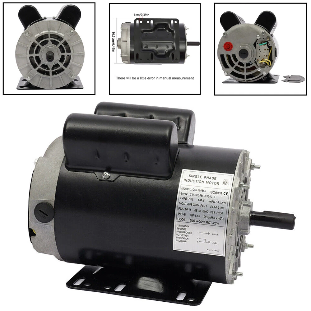 NOTE Copper wires are more durable than aluminum wires Specification: Horsepower: 5 SPL HP Amperage: 16 fl amps at 230v Phase: One / Single Phase Voltage: 208-230 ( 208 volt is the lowest voltage this motor will handle) RPM: 3450 Frame: 56 Shaft Diameter: 5/8" Keyed shaft Frequency: 60hz SF: 1 Protection Full Load amps: 15.0 Overload: Yes / Manual reset button Additional Product information: Rigid Base - CL B Insulation 40 C / 104 F Ambient Temp Condition: New Motor:CCW Suitable For: Air Compressor Applications Package includes: 1*Air Compressor 5 HP SPL 5/8" Shaft Air Compressor Duty Electric Motor 3450 RPM Single Phase 5 HP SPL Air Compressor 3450 RPM 60 Hz Electric Motor Single Phase 56 Frame 15A NOTE Copper wires are more durable than aluminum wires Specification Horsepower: 5 SPL HP Amperage: 16 fl amps at 230v Phase: One / Single Phase Voltage: 208-230 ( 208 volt is the lowest voltage this motor will handle) RPM: 3450 Frame: 56 Shaft Diameter: 5/8" Keyed shaft Frequency: 60hz SF: 1 Protection Full Load amps: 15.0 Overload: Yes / Manual reset button Additional Product information: Rigid Base - CL B Insulation 40 C / 104 F Ambient Temp Condition: New Motor:CCW Suitable For: Air Compressor Applications Package includes 1*Air Compressor If you have any question , please contact us , and we will reply you as soon as possible. Note: The horsepower of this product is 5HP SPL, which is different from 5HP. Before purchasing, please note whether the horsepower of your original product is 5HP SPL, otherwise it will not fit. Payment Delivery details Terms of sales About us Contact us Payment We accept ebay payment 。 Fees such as import duties, taxes are not included in the item price or shipping costs. These charges are the buyer's responsibility. Delivery details Shipping: 2-9 working days to: USA Terms of sales We maintain high standards of excellence and strive for hundred percent customer satisfaction. Feedback is very important to us. We hope that you contact us immediately before you give neutral or negative feedback, so that we can address your concerns. It is impossible to address issues if we do not know about them! About us Your satis faction is our ultimate goal. We work hard to earn your trust and future business. Our certified technicians have tested each item before shipping. The unit comes with 1 year limited warranty on all manufacturing defects. a) If you receive a defective item, you may return it or ask for a discount. Please contact us within 14 days after you receive the package. b) What you returned must be intact and in its original packaging as re? u. Customer is responsible for shipping costs of the returned item. c) We will cover the cost of shipping back t with the shipping rate indicated in the registration page. We will send you a new unit or refund the full payment you paid. Thank you. Contact us Business Hour Business Hour: Monday To Friday: 8:30 AM to 5:00 PM (Beijing China time) Due to time zones, our reply to your questions may not be immediately. But within above working time, we will reply your email within 24 hours. If it's non-workdays, please kindly be patient and wait till Monday. Please contact us with ebay message. Please feel free to contact us if you have any questions. Monday To Friday: 8:30 AM to 5:00 PM (Beijing China time) Due to time zones, our reply to your questions may not be immediately. But within above working time, we will reply your email within 24 hours. If it's non-workdays, please kindly be patient and wait till Monday. Please contact us with ebay message. Please feel free to contact us if you have any questions. On Dec 1, 2024 at 23:06:36 PST, seller added the following information: