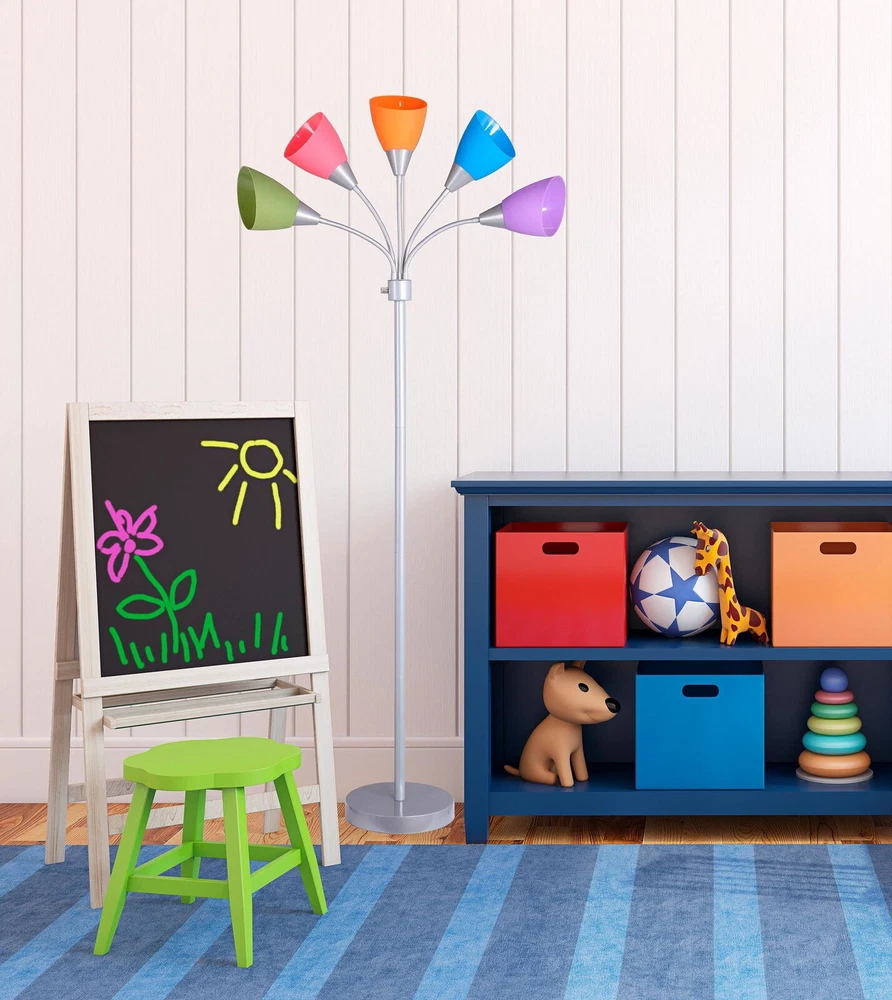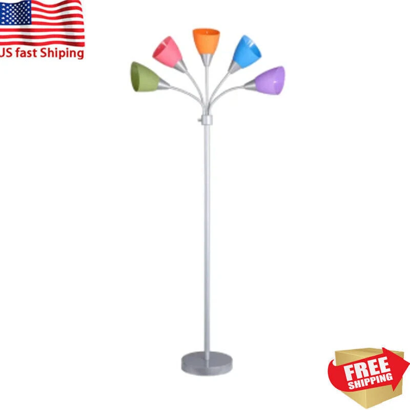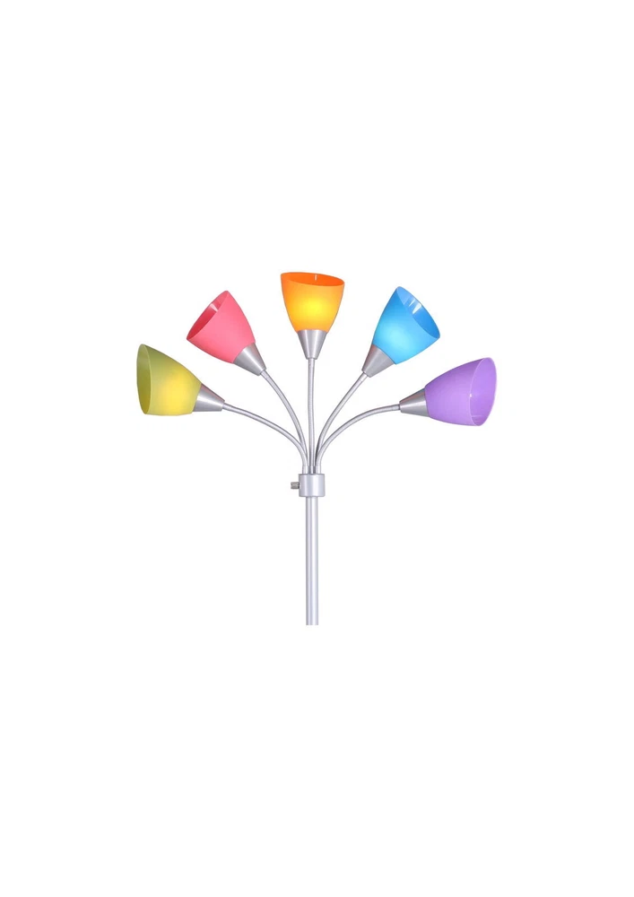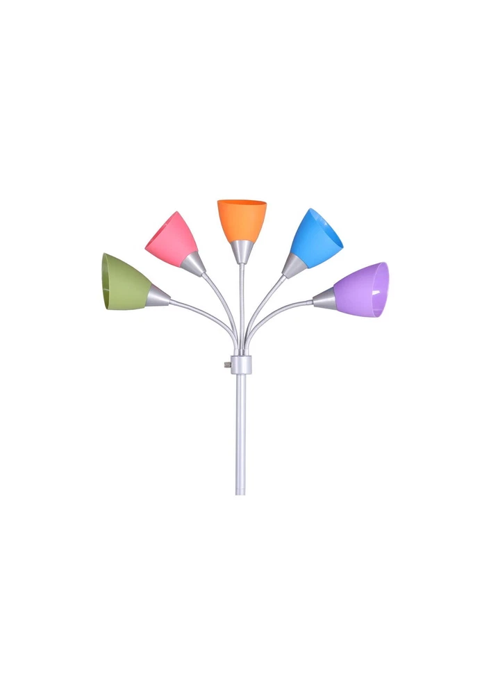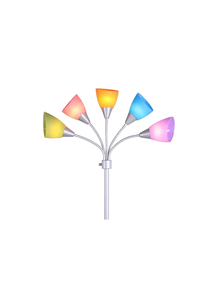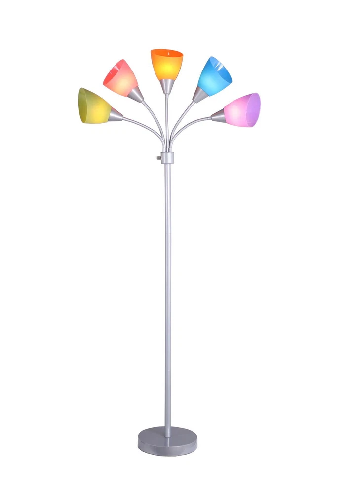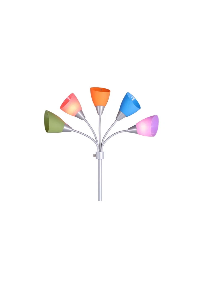 The 5-Head Silver Floor Lamp, model JK 1671-FL-SLV with multi-color pastel plastic shades, is perfect to use in kids bedroom, playroom, living room or office to add fun. Standing at a height of 67 inches, this freestanding floor lamp has a slender tubular body atop a round plastic base. It has five plastic cone shades attached to the top with flexible gooseneck arms to focus light where you need it, and a variable multi-head setting to allow versatile lighting options to illuminate all the lights or just a few at a time. It requires 5x60W or 9W LED bulbs (sold separately). Add this fun and vibrant 5-head floor lamp to your home for a unique look next to a sofa or a rm-chair to add versatile adjustable lighting to your living room, den, dorm, office, kids bedroom or playroom. This lamp is easy to maintain and easy to assemble. Adult use. Overall height 67" Classic Modern Styling Silver finish with multi-color plastic shades Teen or adult use Easy 4-way turn knob switch Sturdy metal base 5 plastic shades - multi color On Nov 16, 2024 at 04:35:08 PST, seller added the following information:
