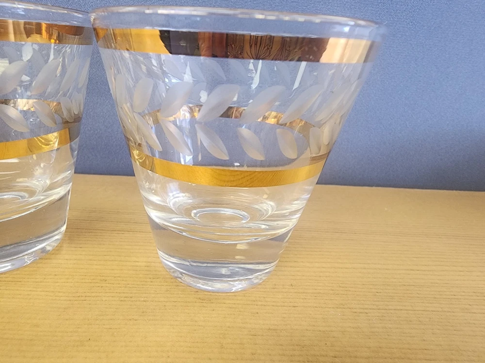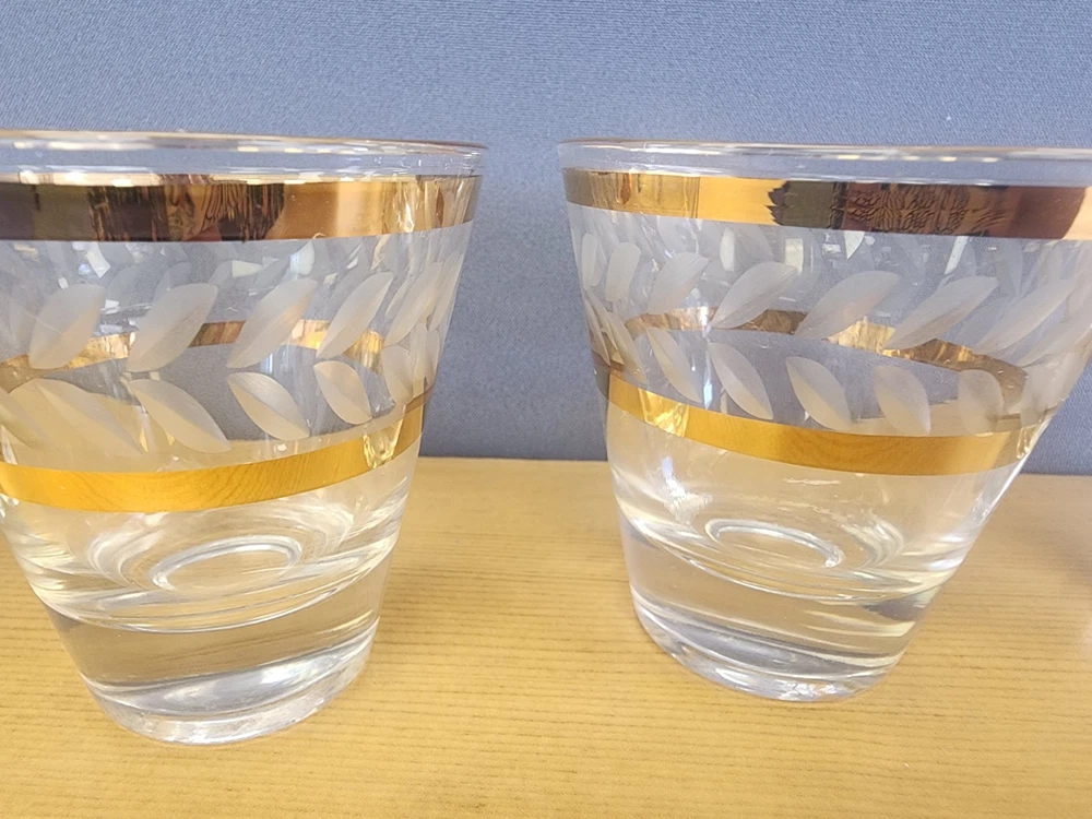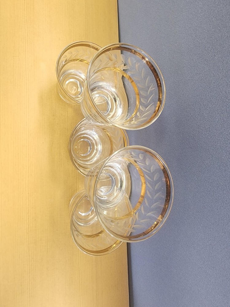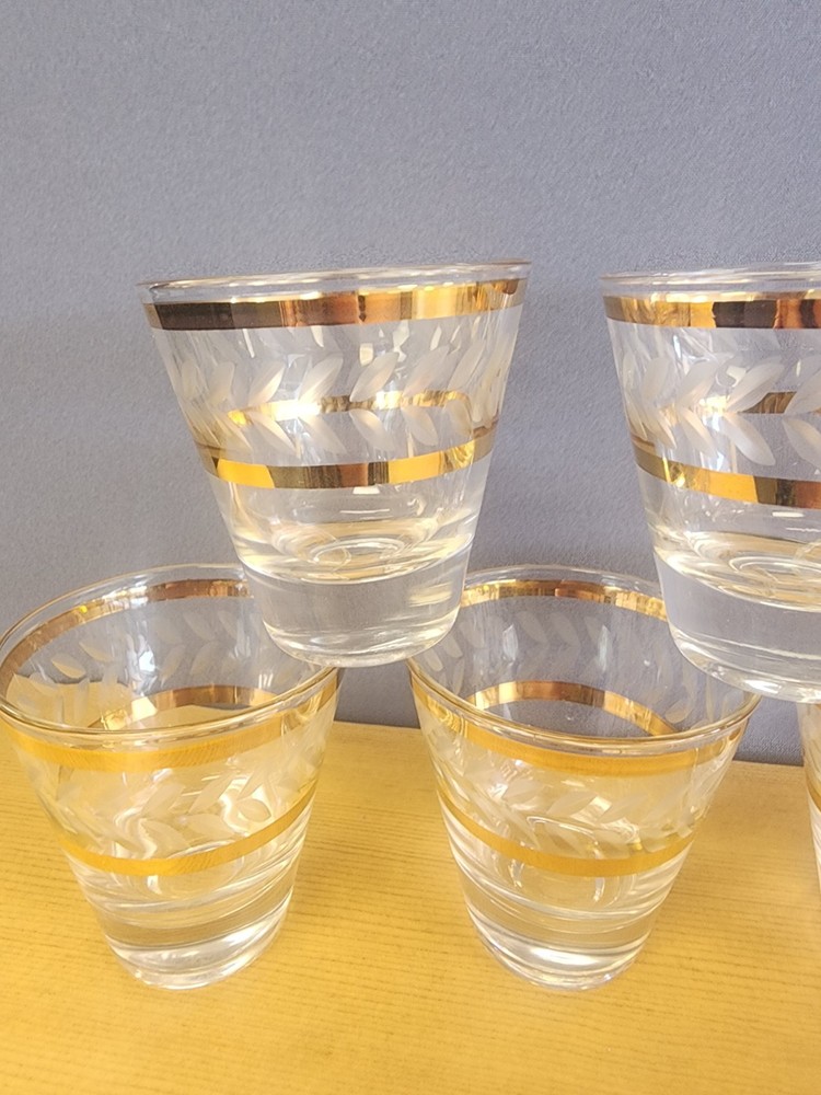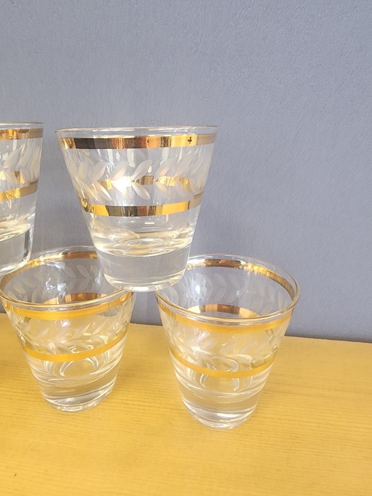Set Of 5 beautiful elegant somewhat delicate drinking glasses. Each one features an etched design and a double gold band. Thick glass bottom. Great for use in the bar or dining room. Great condition, but not perfect. Please examine pictures carefully prior to purchase and ask questions if you have any